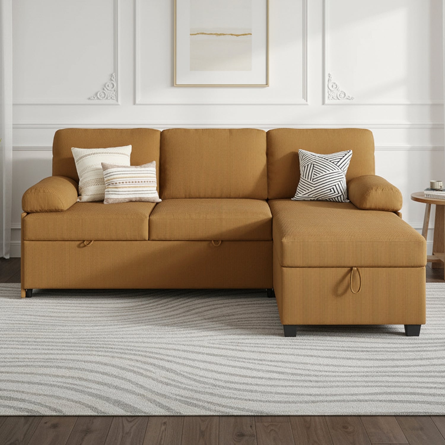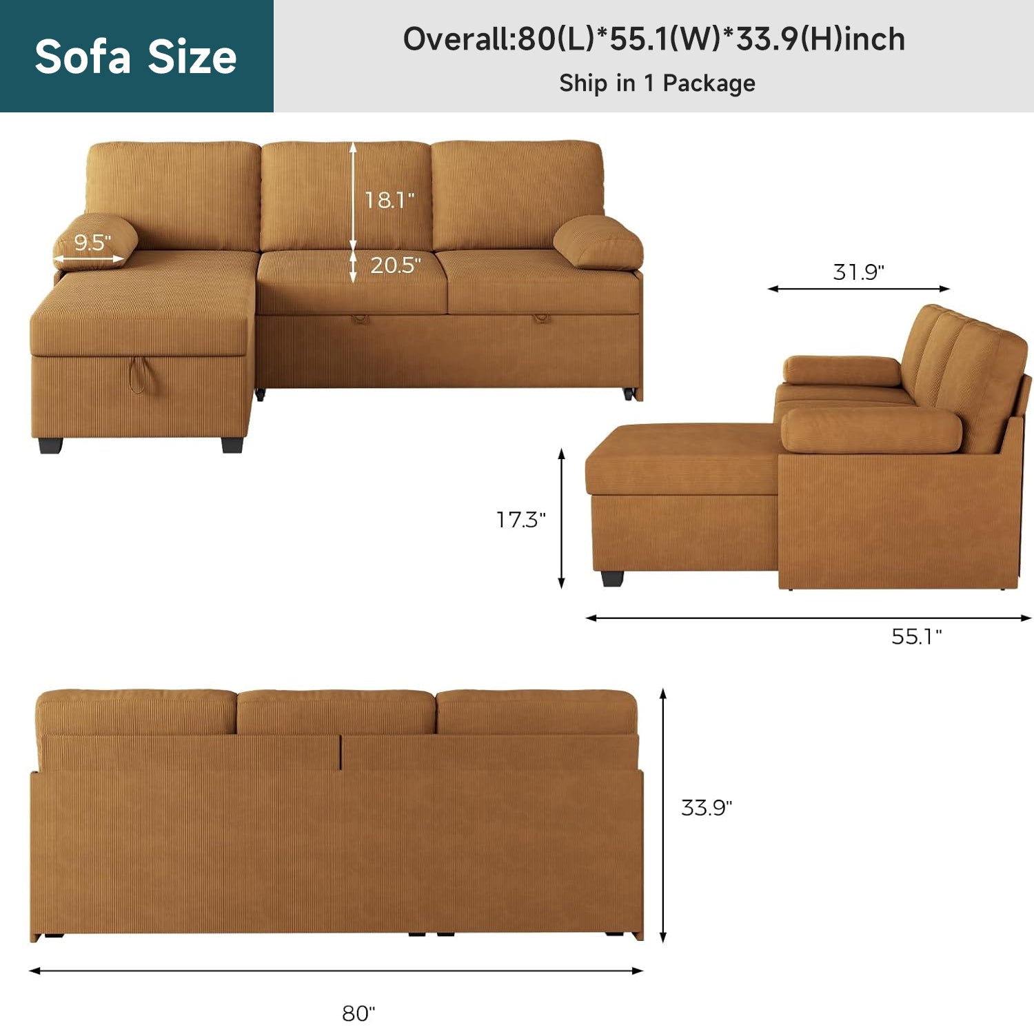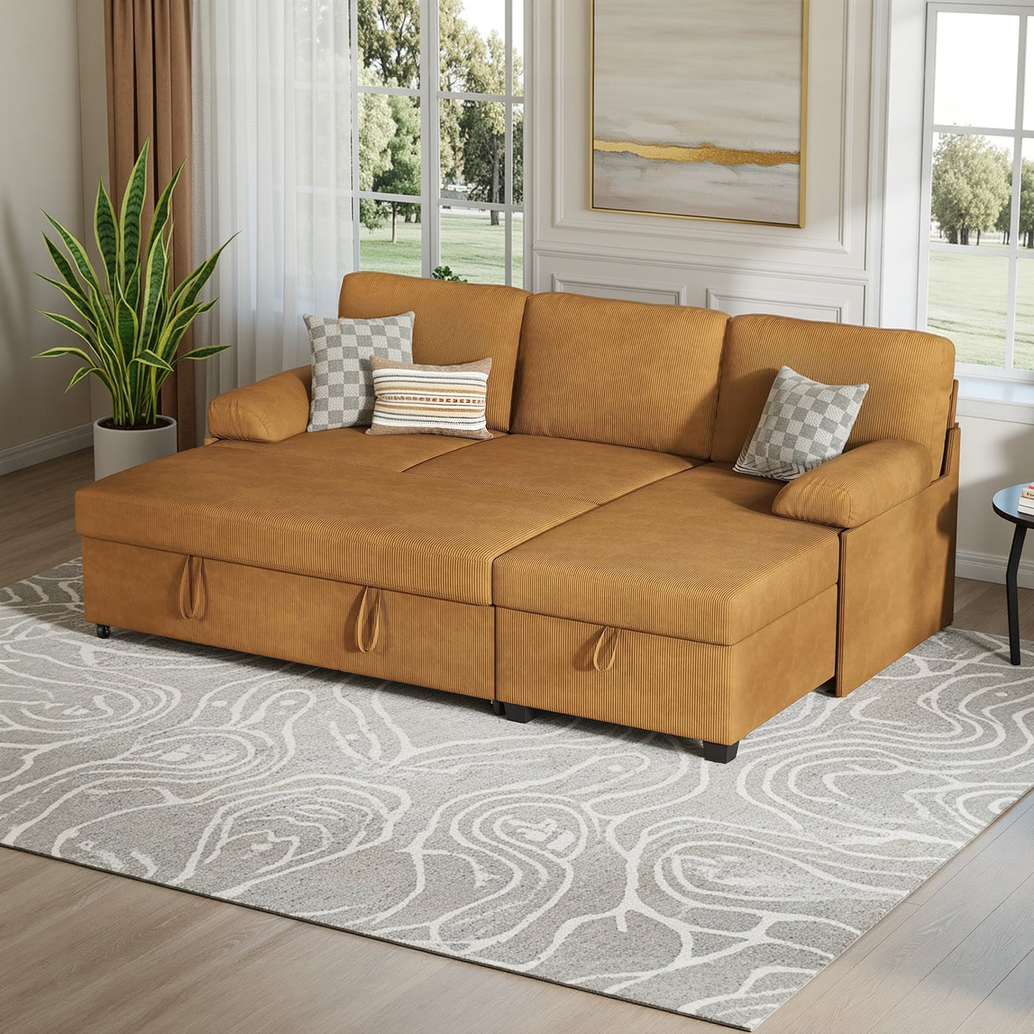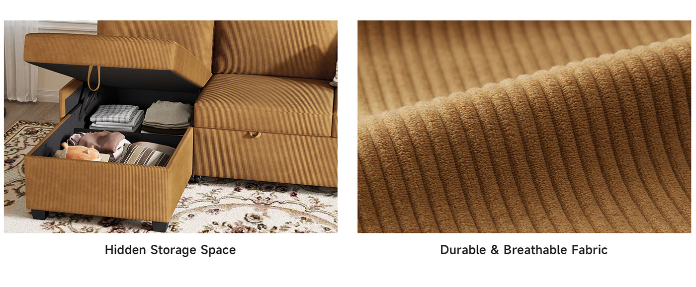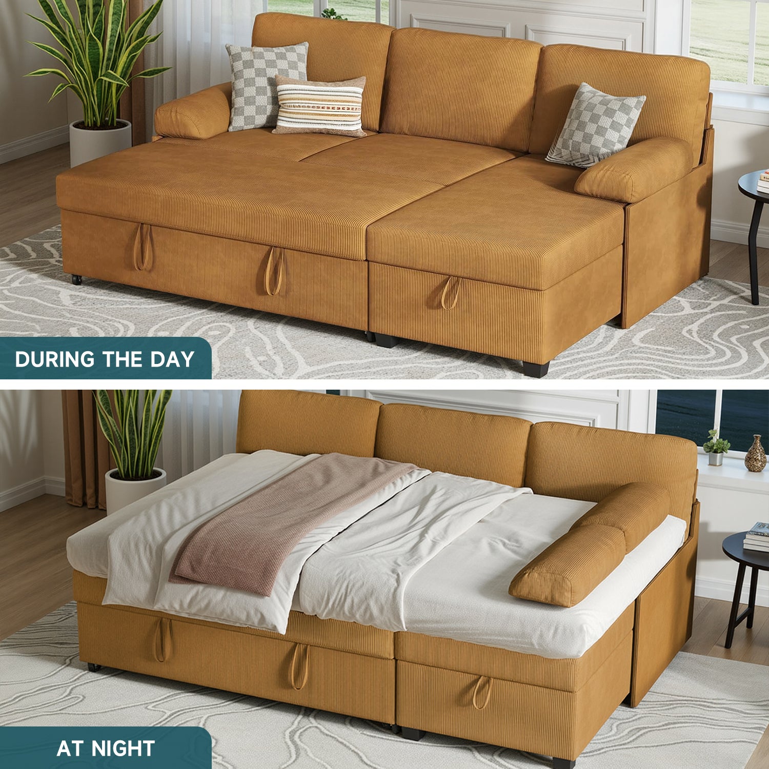 Convertible L-Shaped Sectional Sofa Bed with Reversible Chaise, Corduroy Sleeper Sofa with Storage & Pull-Out Design