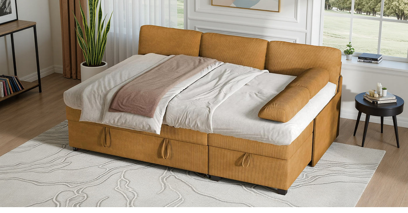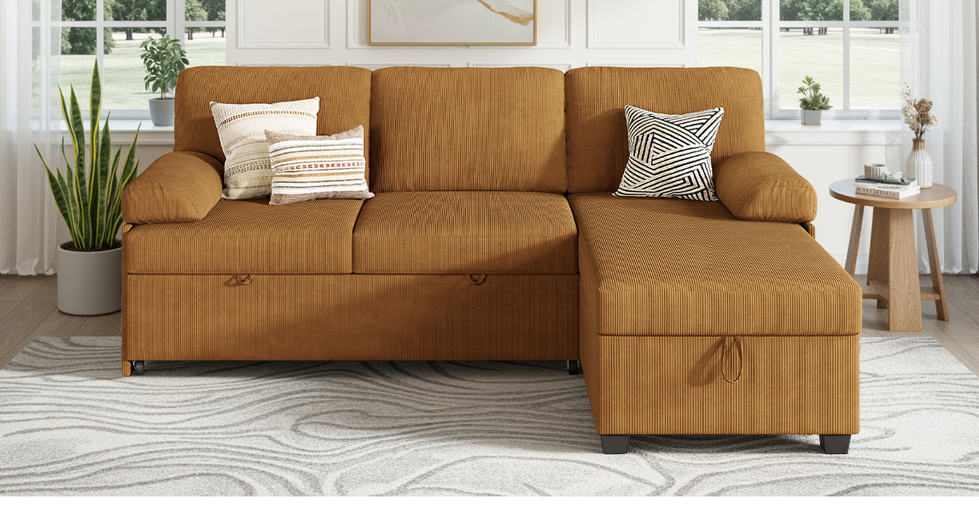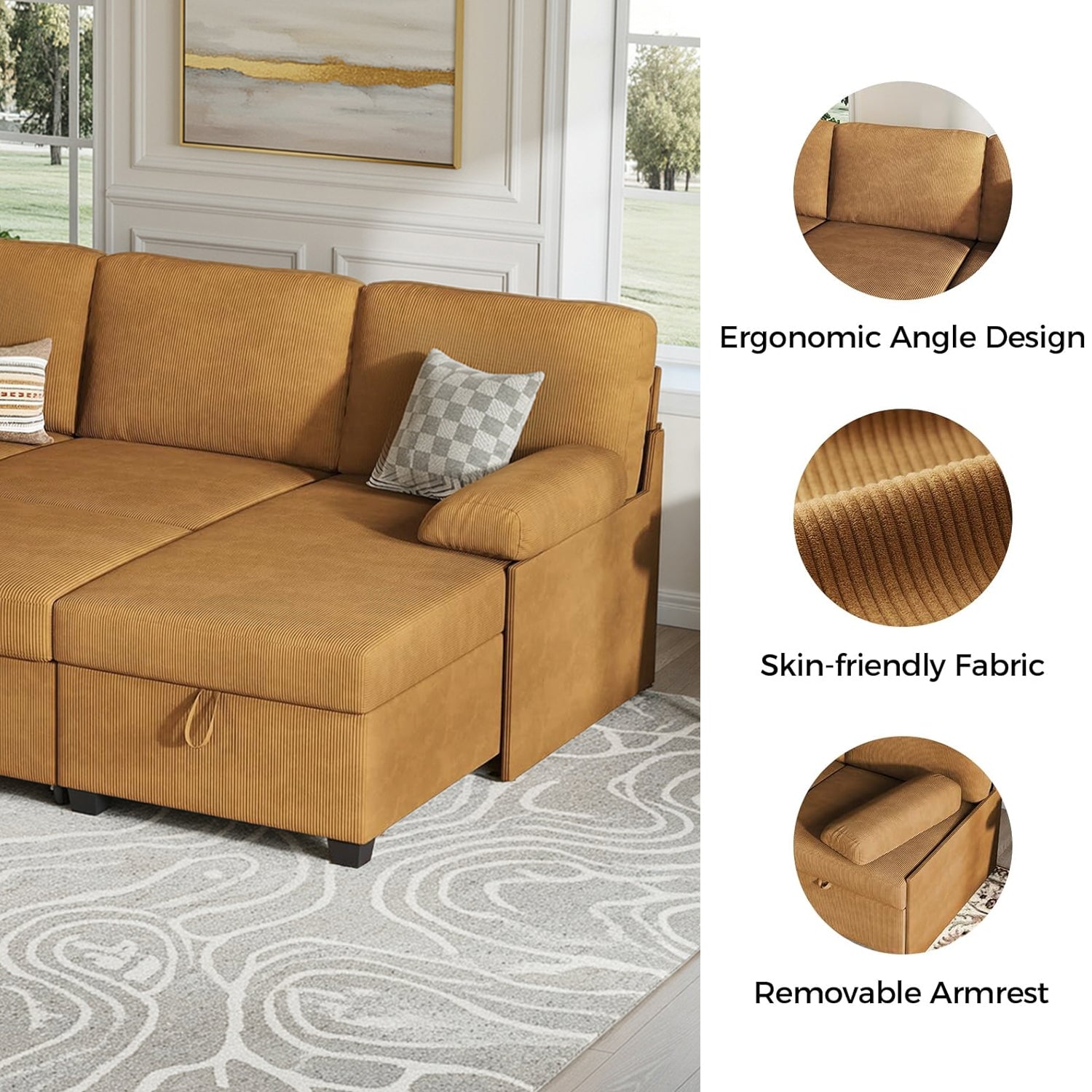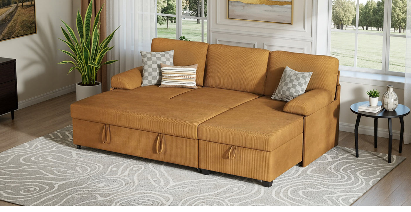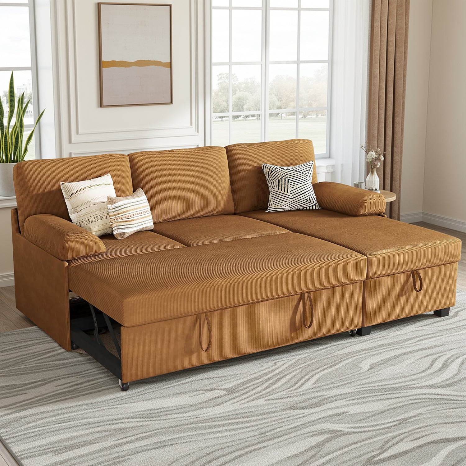 Convertible L-Shaped Sectional Sofa Bed with Reversible Chaise, Corduroy Sleeper Sofa with Storage & Pull-Out Design