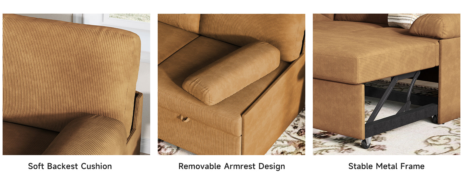 This convertible sectional sofa bed is designed as a versatile 2-in-1 solution for modern living spaces. Built with a sturdy plywood frame and reinforced metal springs, it delivers reliable durability for everyday seating and sleeping. Upholstered in soft corduroy fabric and filled with supportive foam, it balances comfort, texture, and contemporary style.