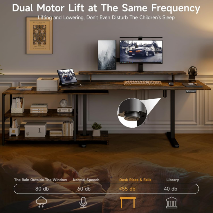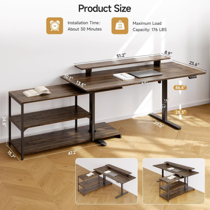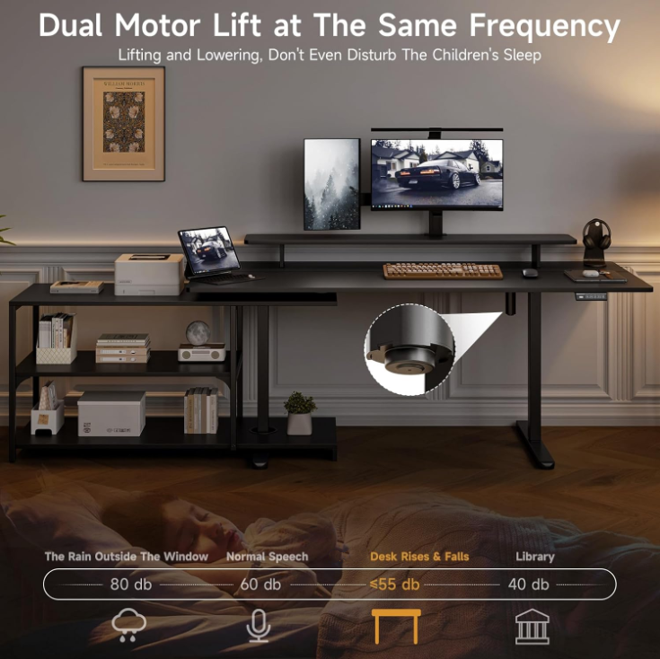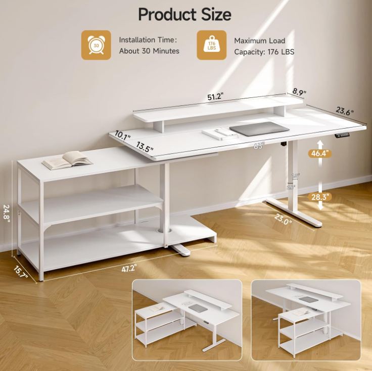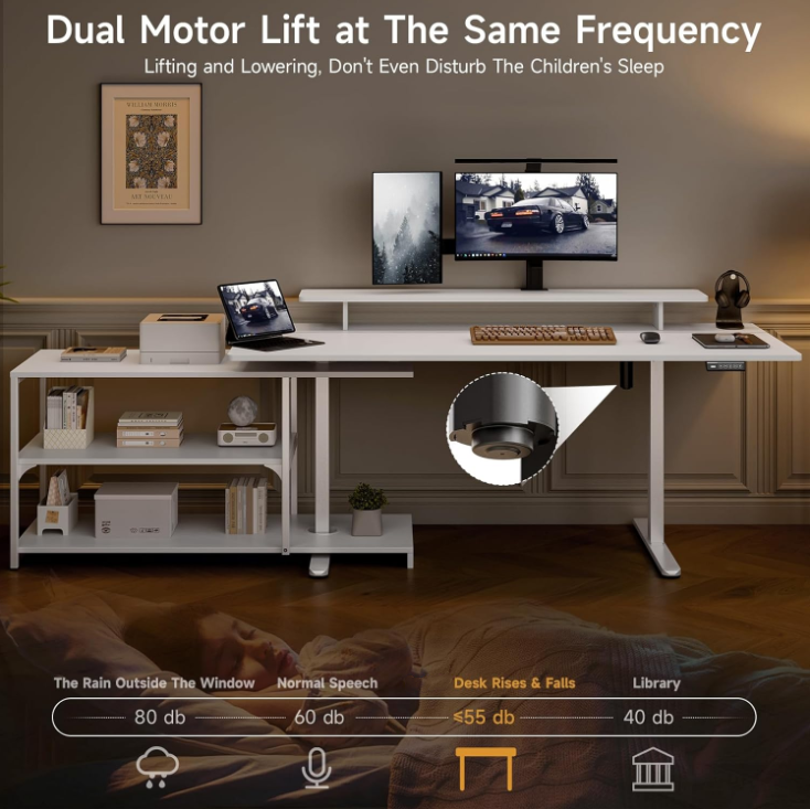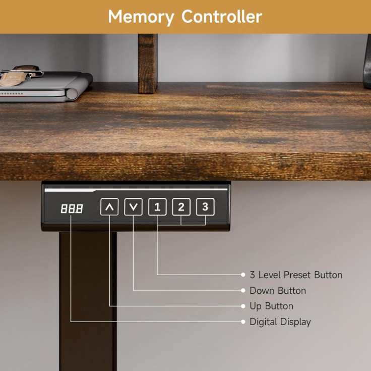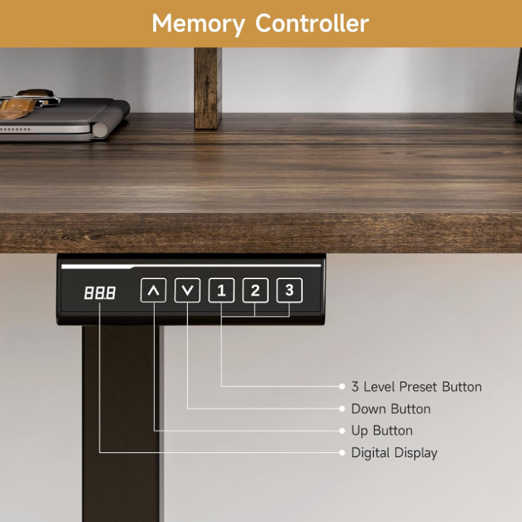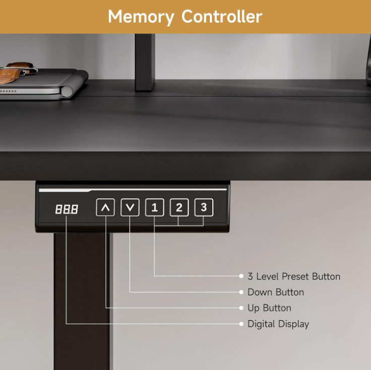 The sit stand desk adjusts in height from 28.3 inches to 46.6 inches, making it easy to switch between sitting and standing as your day goes on. The motor runs at around 55 dB, so adjustments feel quiet and unobtrusive. You can also save your preferred heights with the memory controller and return to them with one touch.
