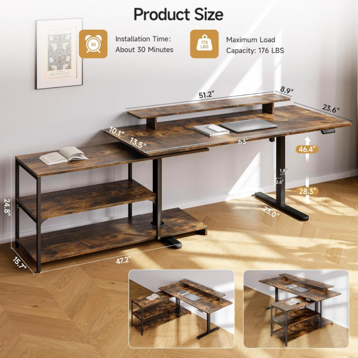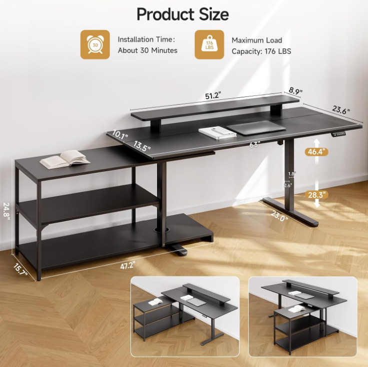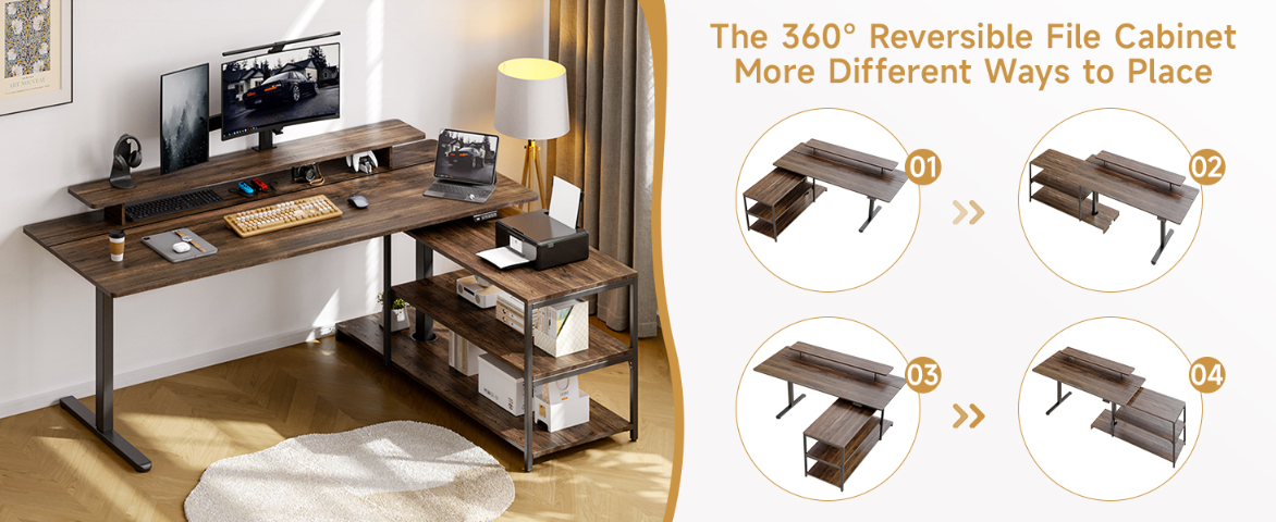 The stand up desk features an open file cabinet that rotates fully, allowing you to turn it toward you and access files or boxes without standing up. Since the cabinet is separate, it can be installed on either the left or right side. This is especially helpful if your room layout isn’t fixed or if you might rearrange things later.