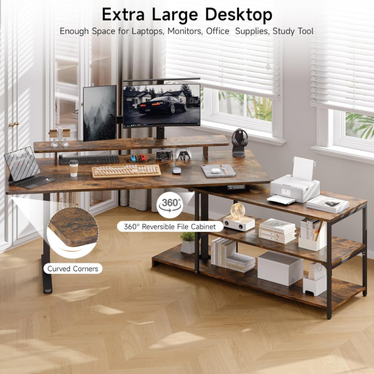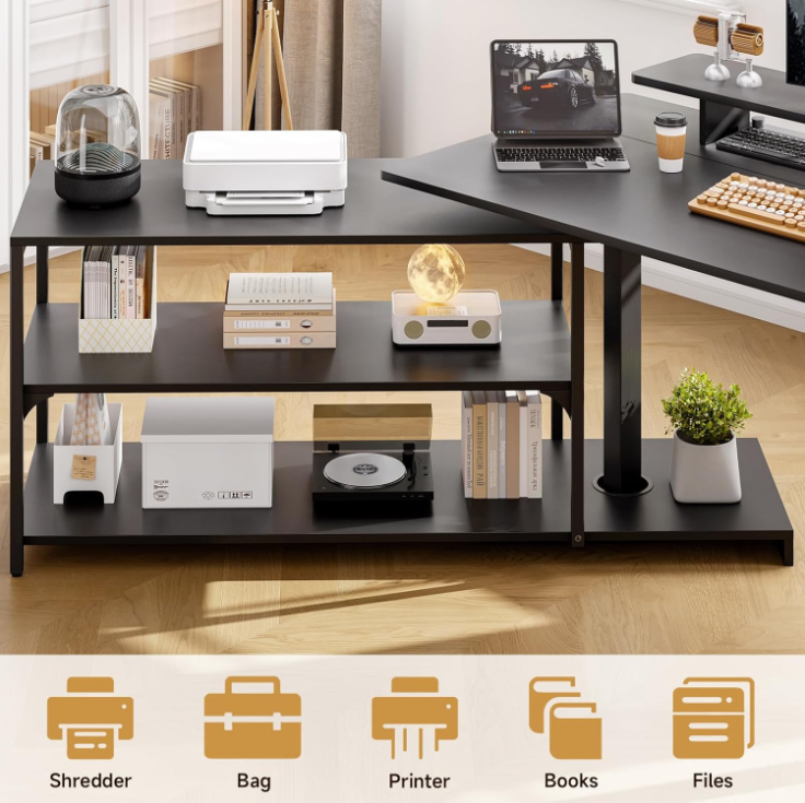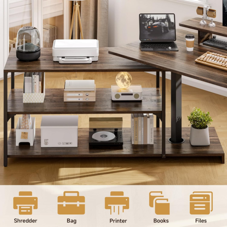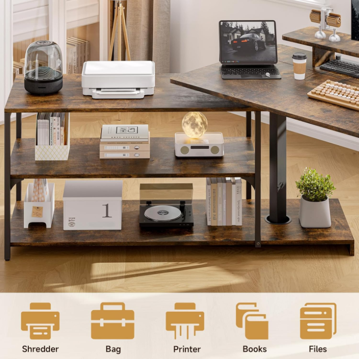 I really enjoy this desk after it was set up. This offers plenty of storage options with a shelf area. The shelf can even rotate! Use it all the time and fits good in my office. Solid 5 stars!