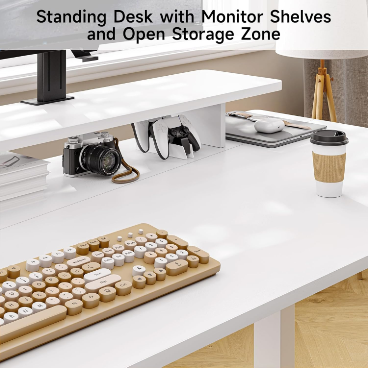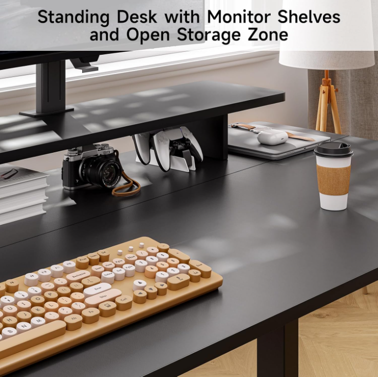 The adjustable desk features a raised monitor shelf, which helps lift your screen to a more comfortable viewing height. That way, your main work surface stays clear and organized, with enough room for a laptop, keyboard, notebooks, and daily essentials.