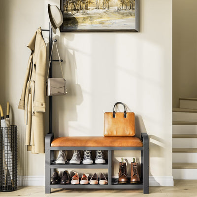Shoe Bench, 2 Tier Storage Bench with Padded Seat Cushion, Farmhouse Entryway Bench with 2 Barn Doors & 2 Adjustable Shelves