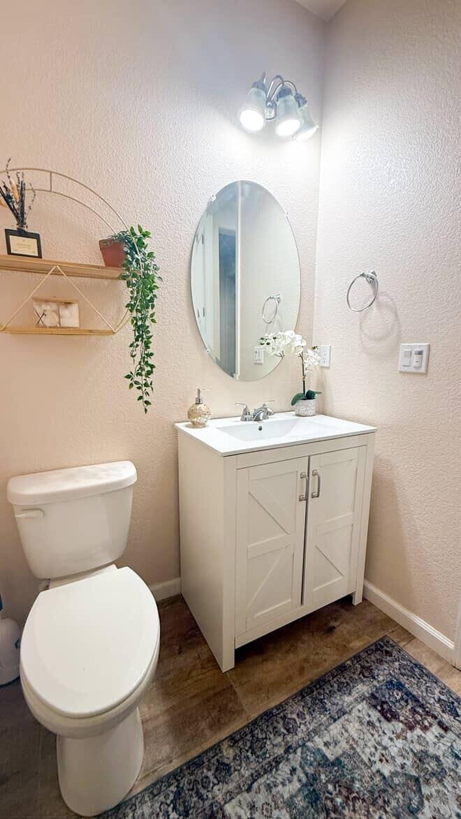 This freestanding bathroom vanity measures 18.3"D x 30"W x 34"H. This freestanding bathroom vanity is made from CARB-certified P2 MDF to prevent cracking and support heavy loads. Solid wood legs add extra stability, while soft-close hinges on both cabinet doors ensure smooth and quiet operation for long-term reliability.