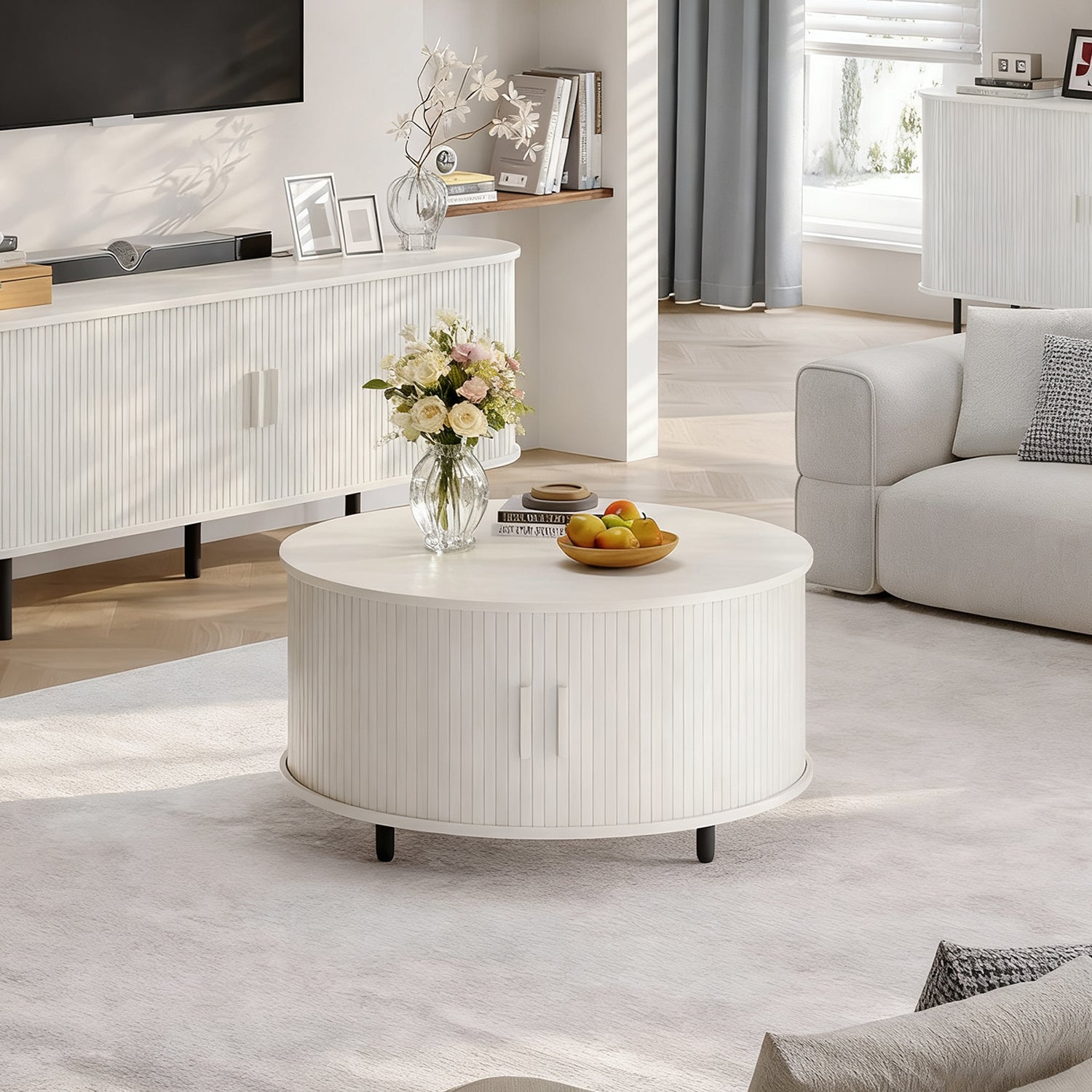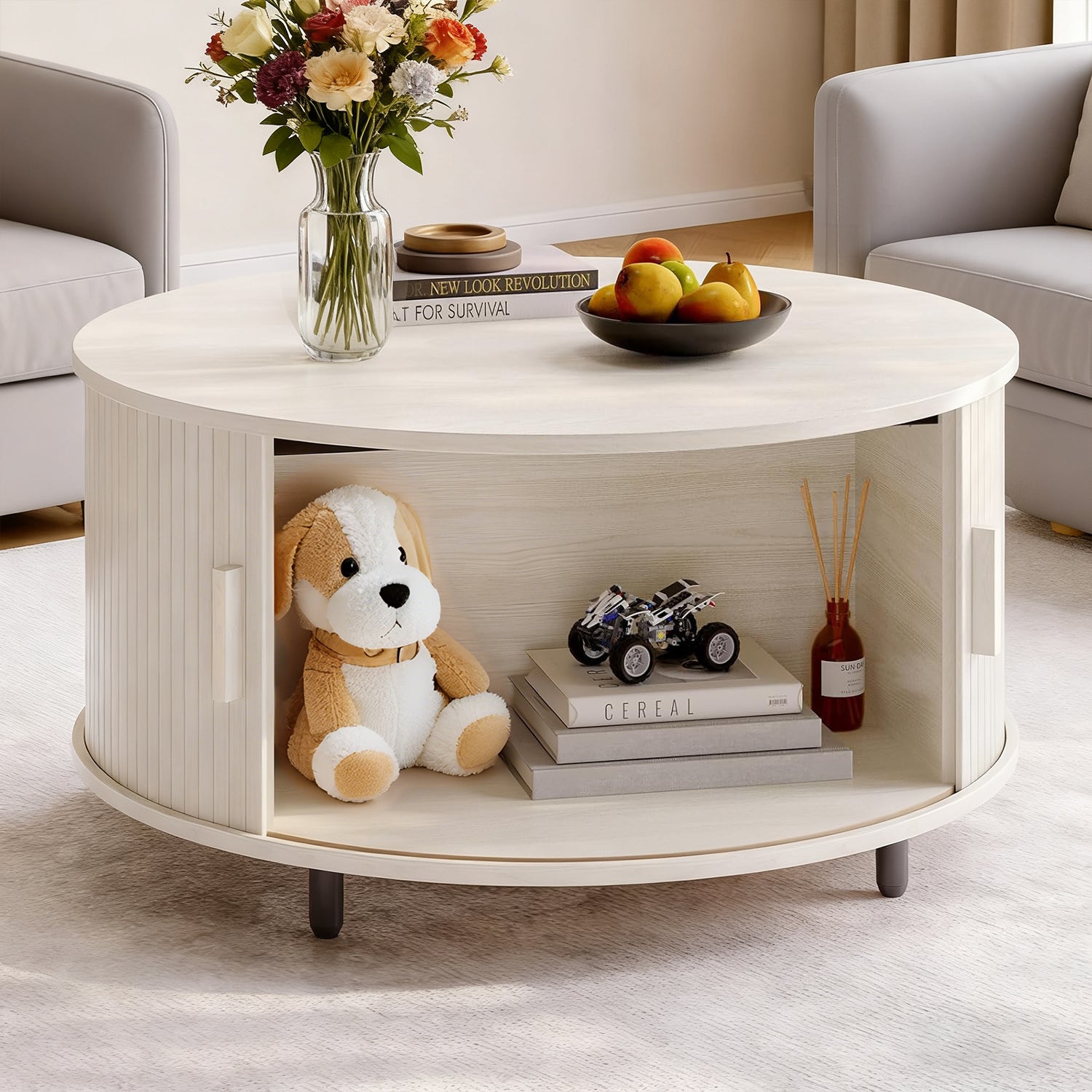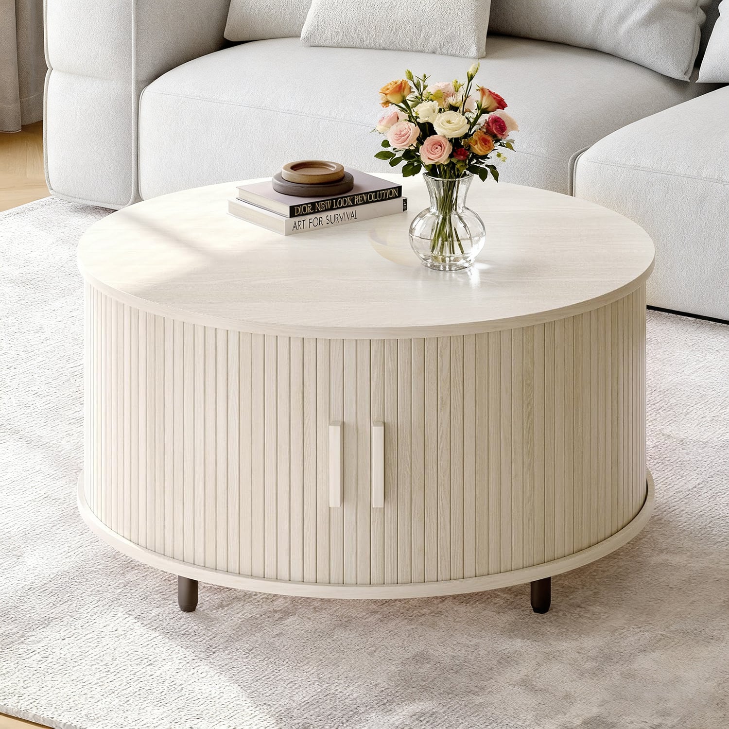31.5" Round Storage Coffee Table, Fluted Wood Coffee Table with Adjustable Footpads and 360° Curved Sliding Door