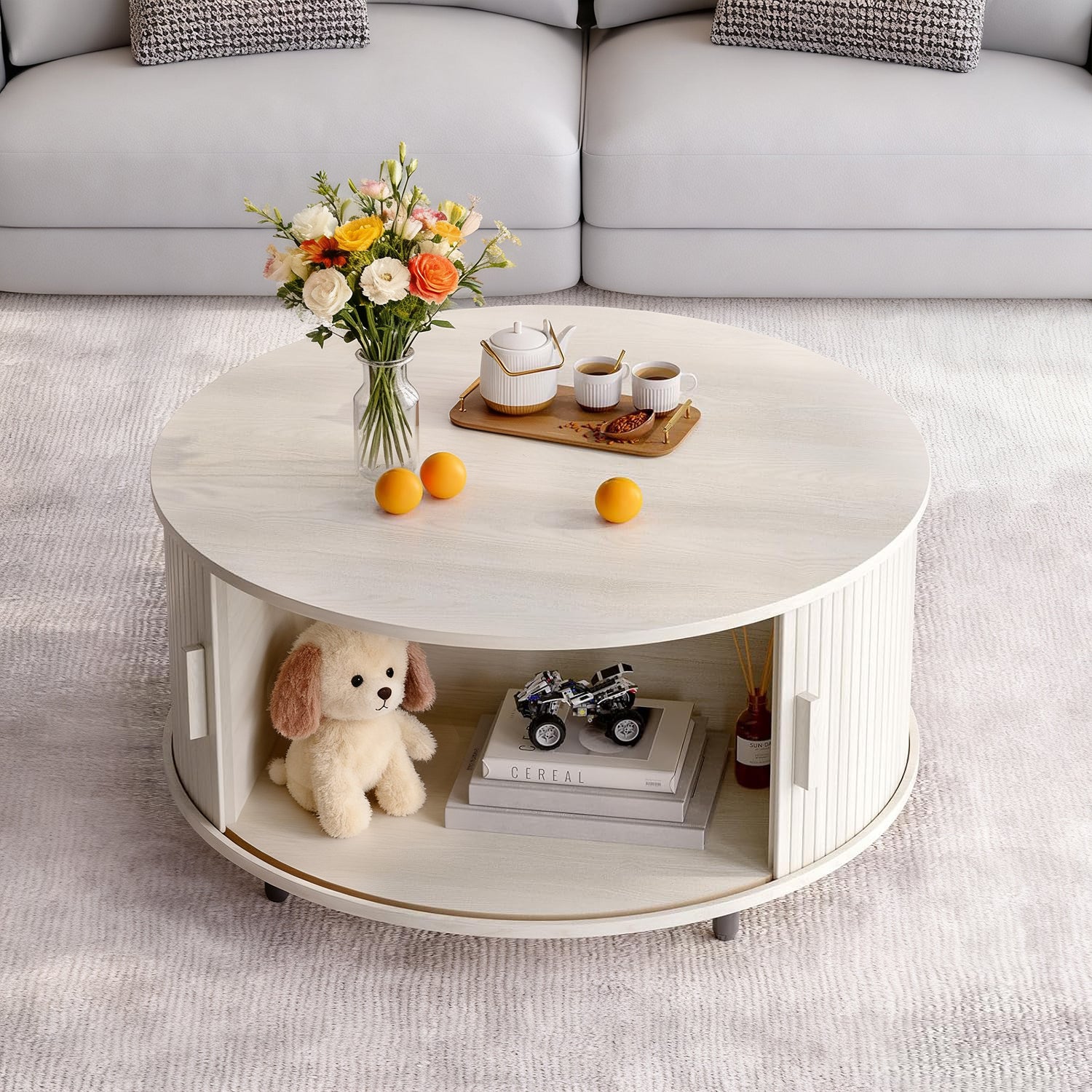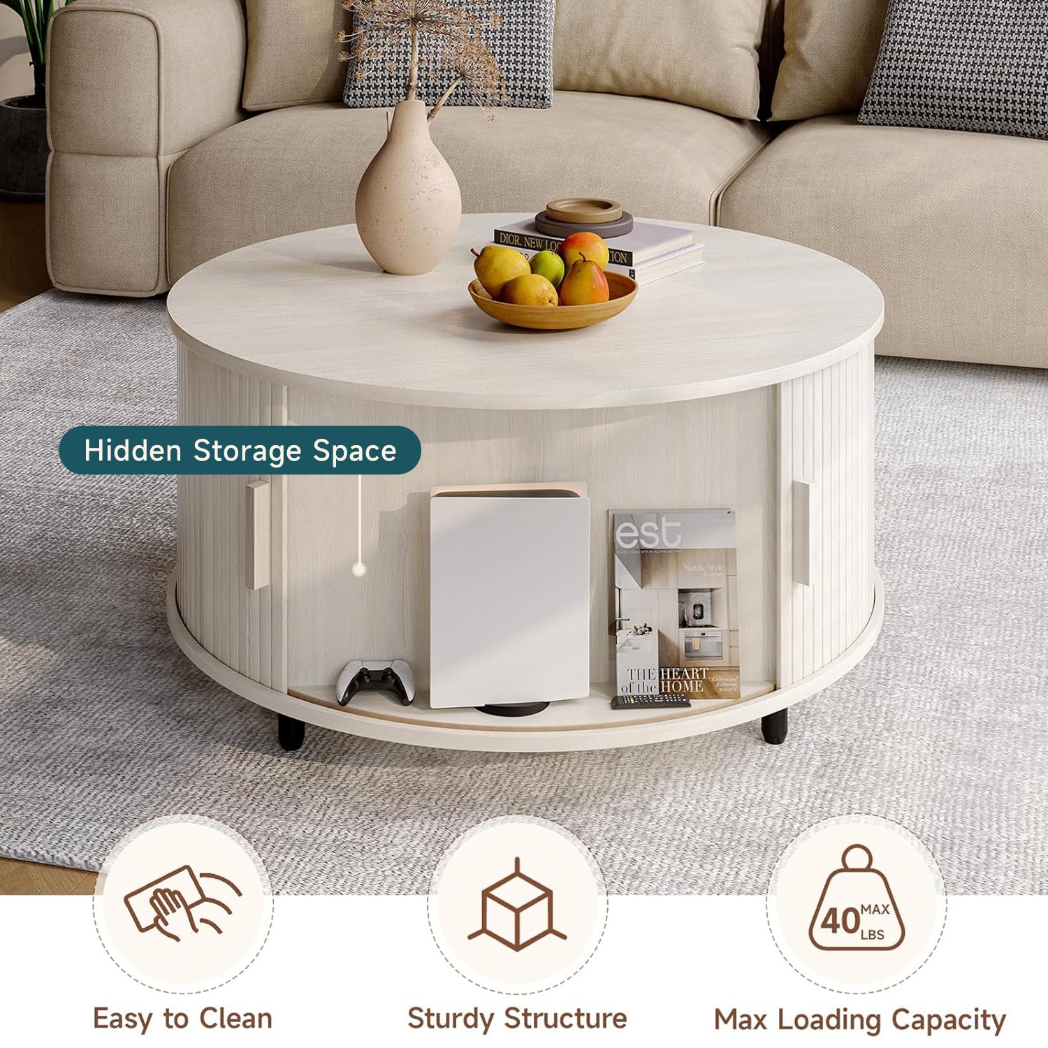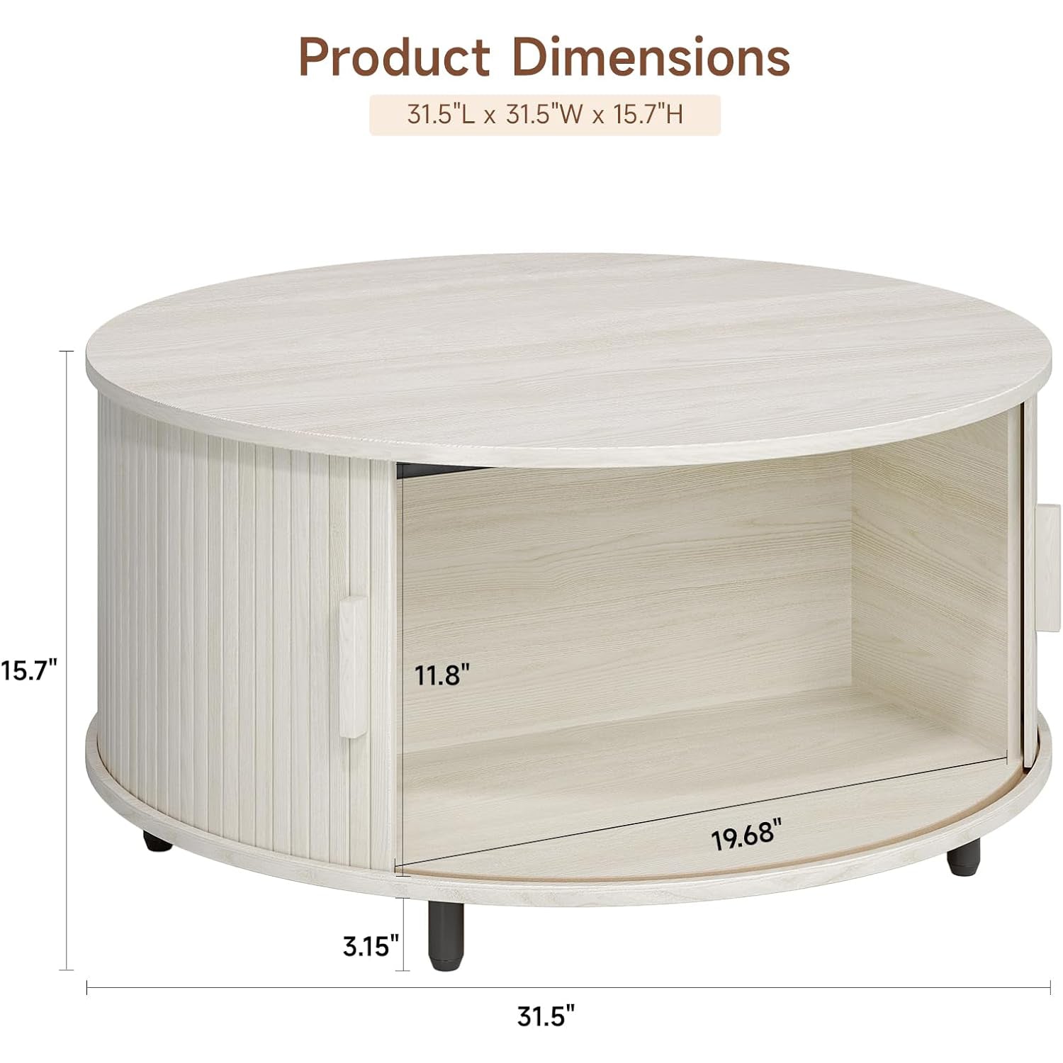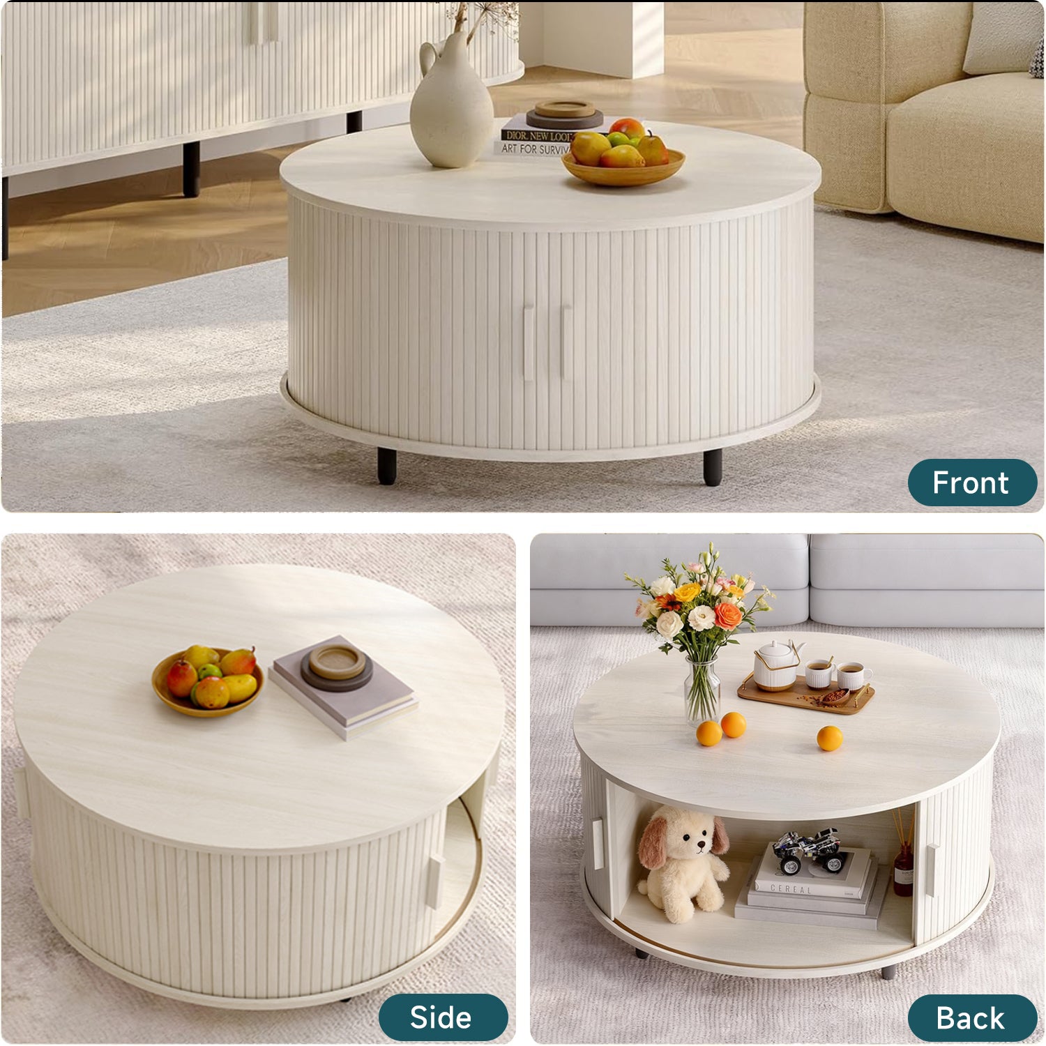 31.5" Round Storage Coffee Table, Fluted Wood Coffee Table with Adjustable Footpads and 360° Curved Sliding Door