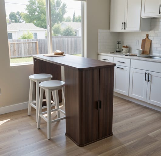 On one side, the kitchen island table features built-in storage shelves and wine bottle holders, keeping wine, cups, and kitchen essentials within easy reach. The other side is open, leaving space for chairs or stools.