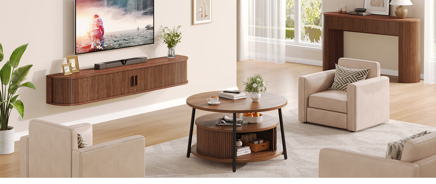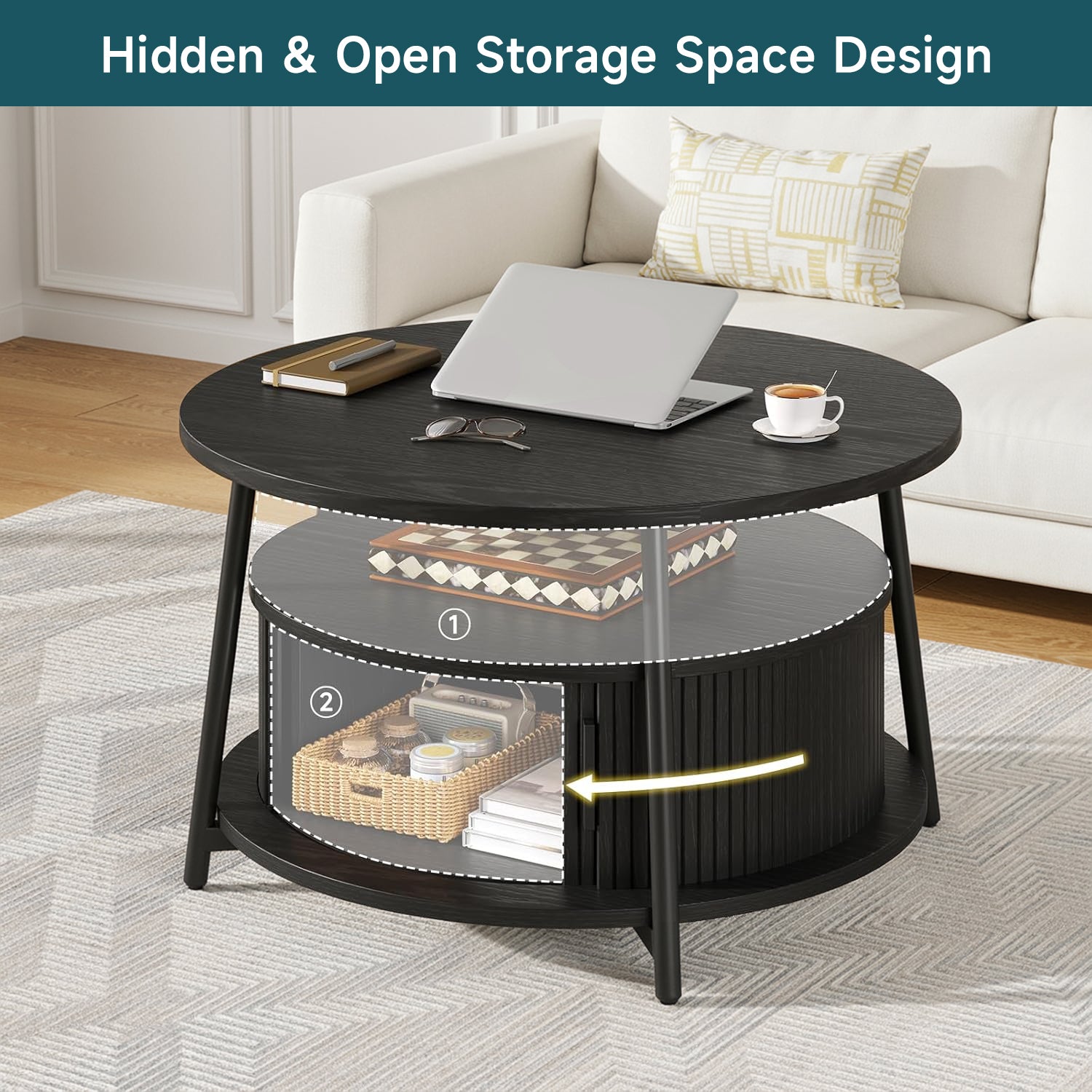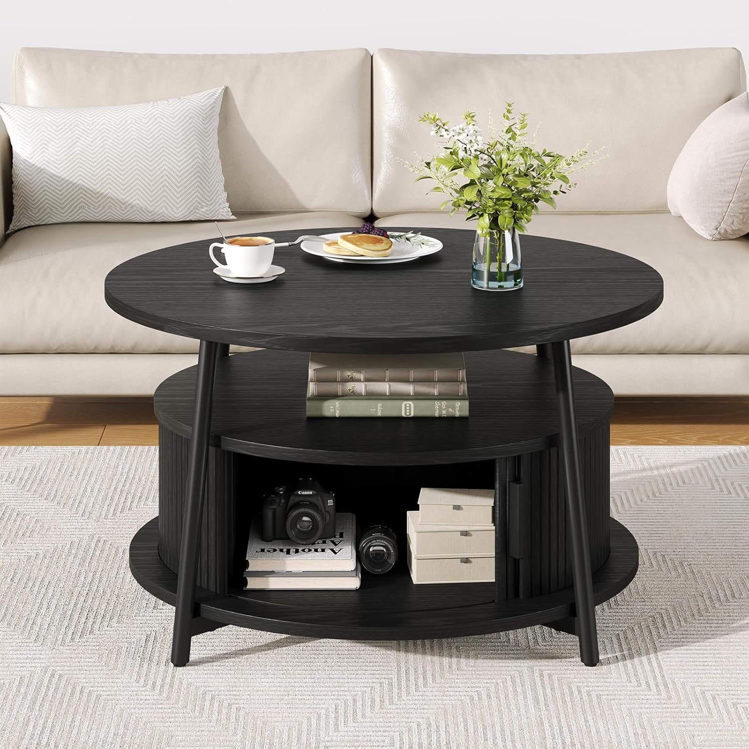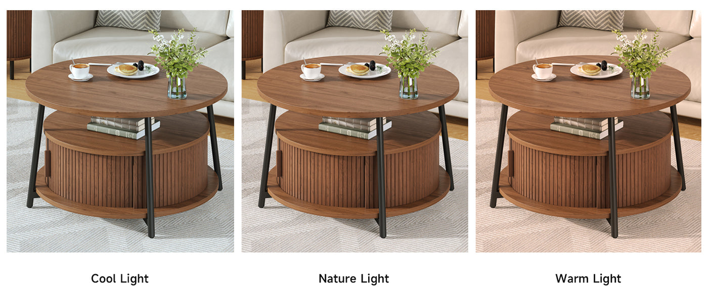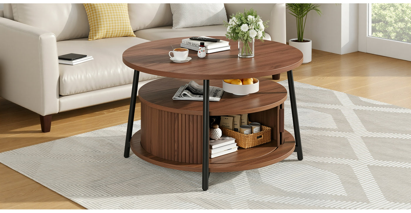 This modern center table features a three-tier storage design. The open middle shelf is easy to access and works well for books, magazines, or everyday items. The lower hidden compartment with smooth sliding doors is suitable for storing remotes, toys, or other small items out of sight.