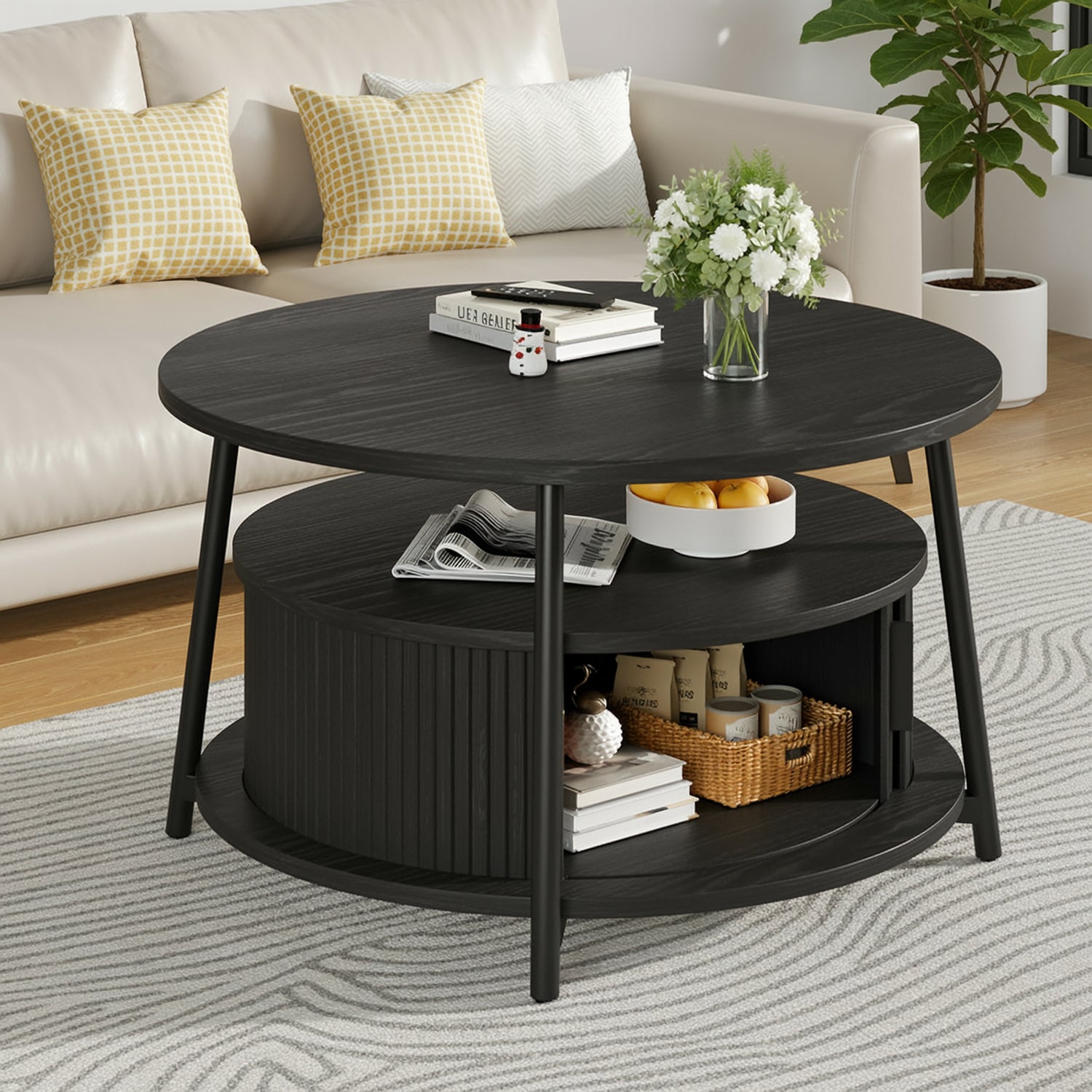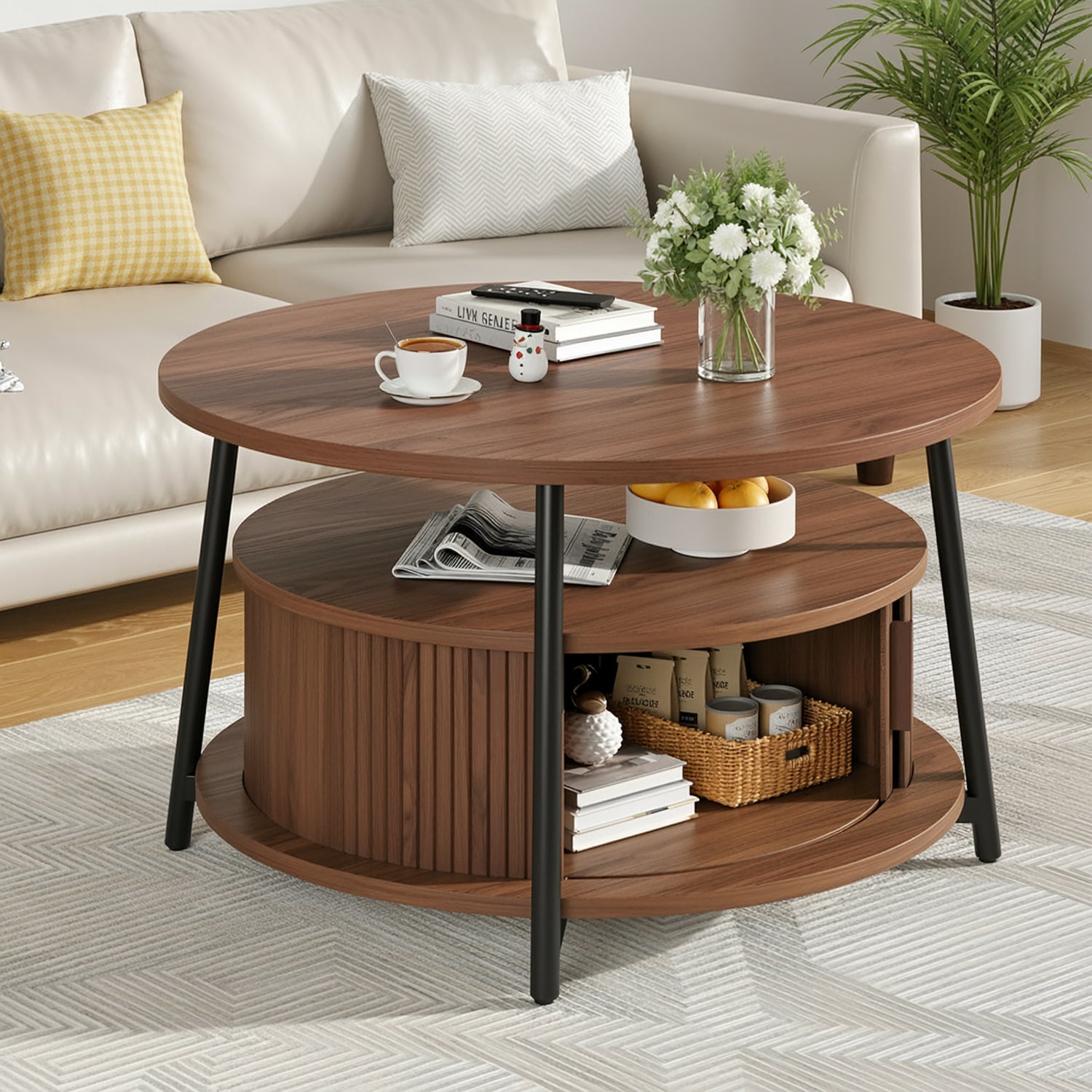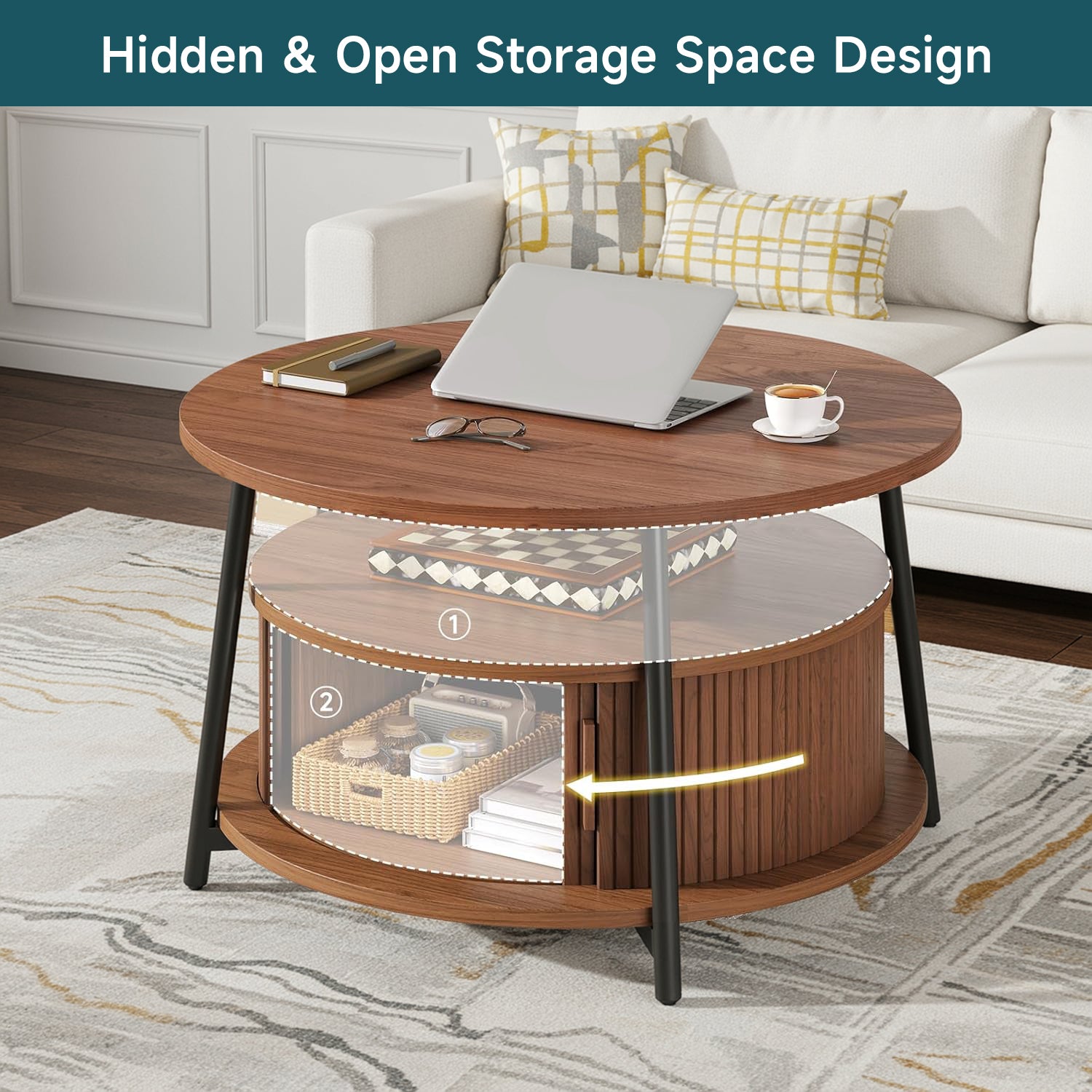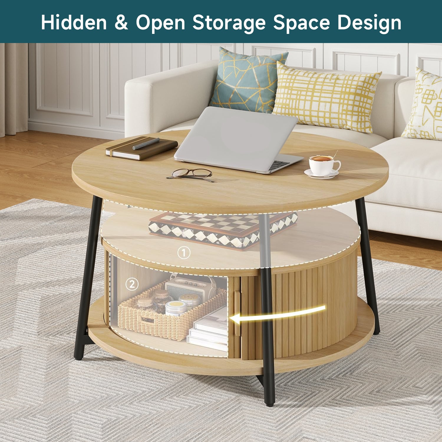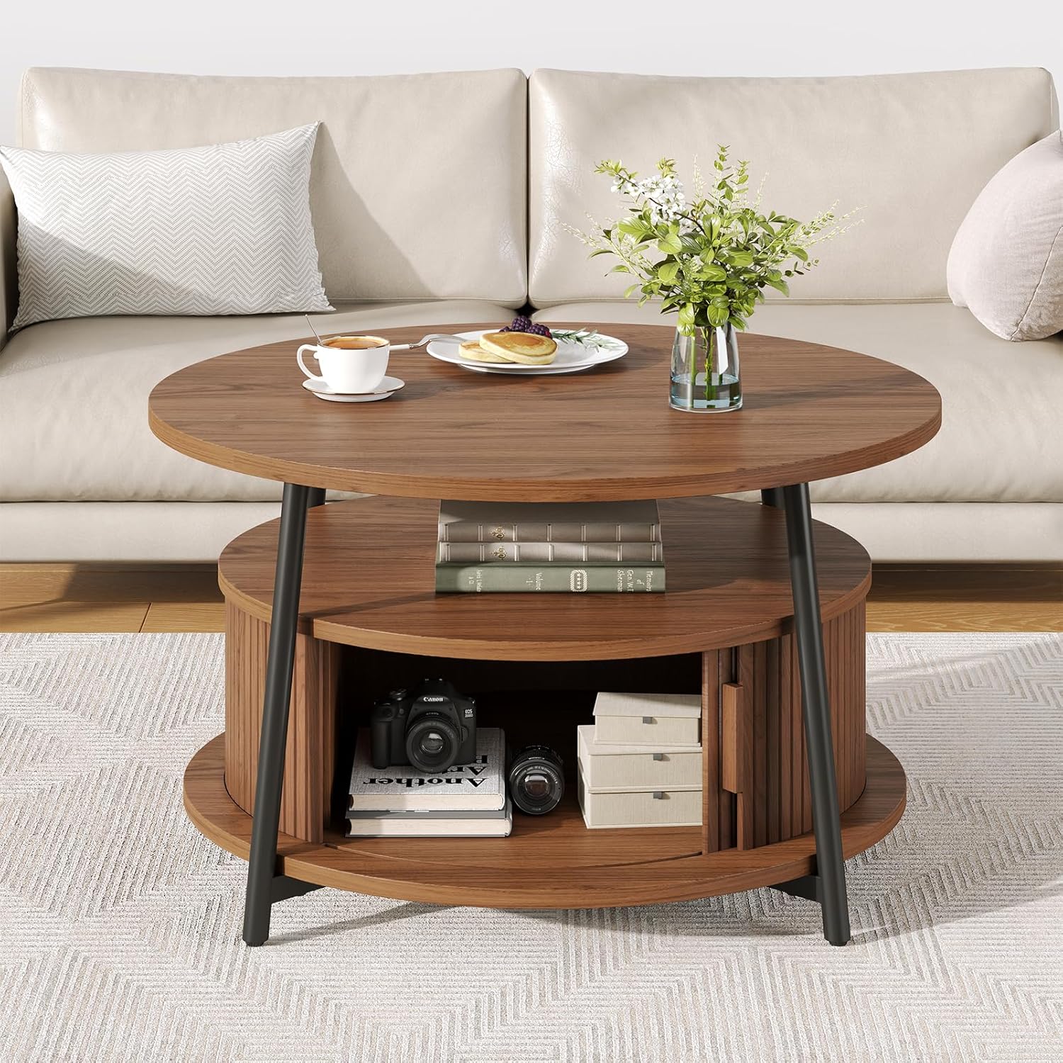 This modern center table features a three-tier storage design. The open middle shelf is easy to access and works well for books, magazines, or everyday items. The lower hidden compartment with smooth sliding doors is suitable for storing remotes, toys, or other small items out of sight.