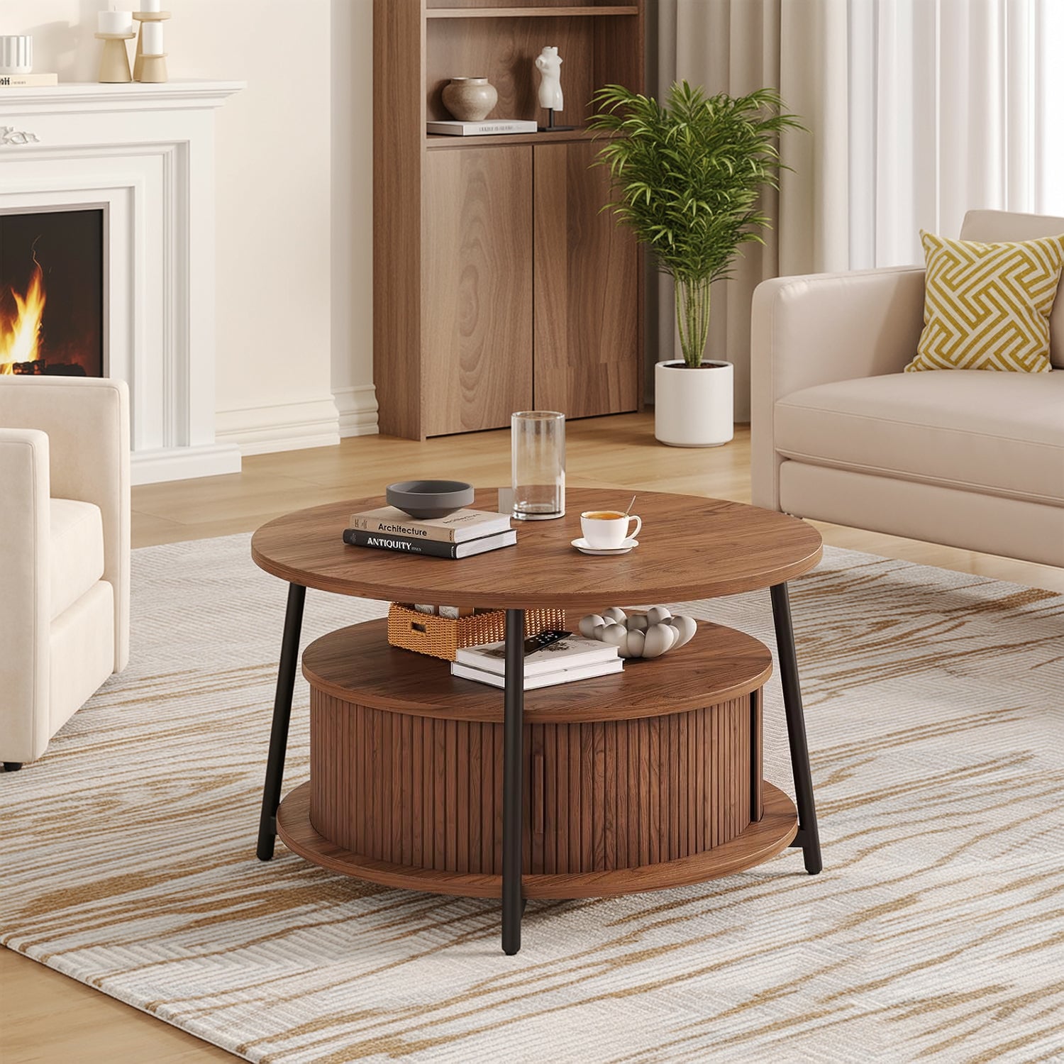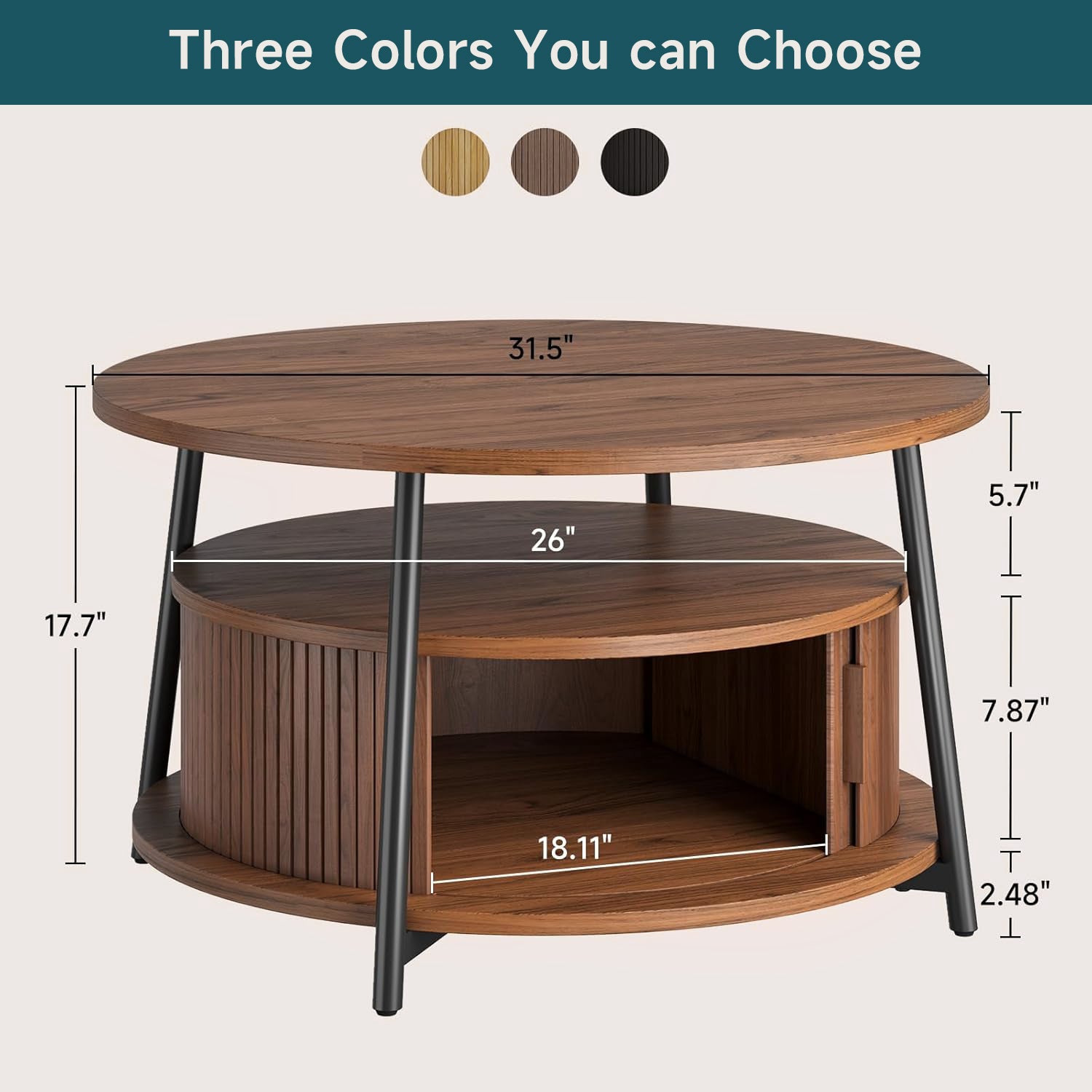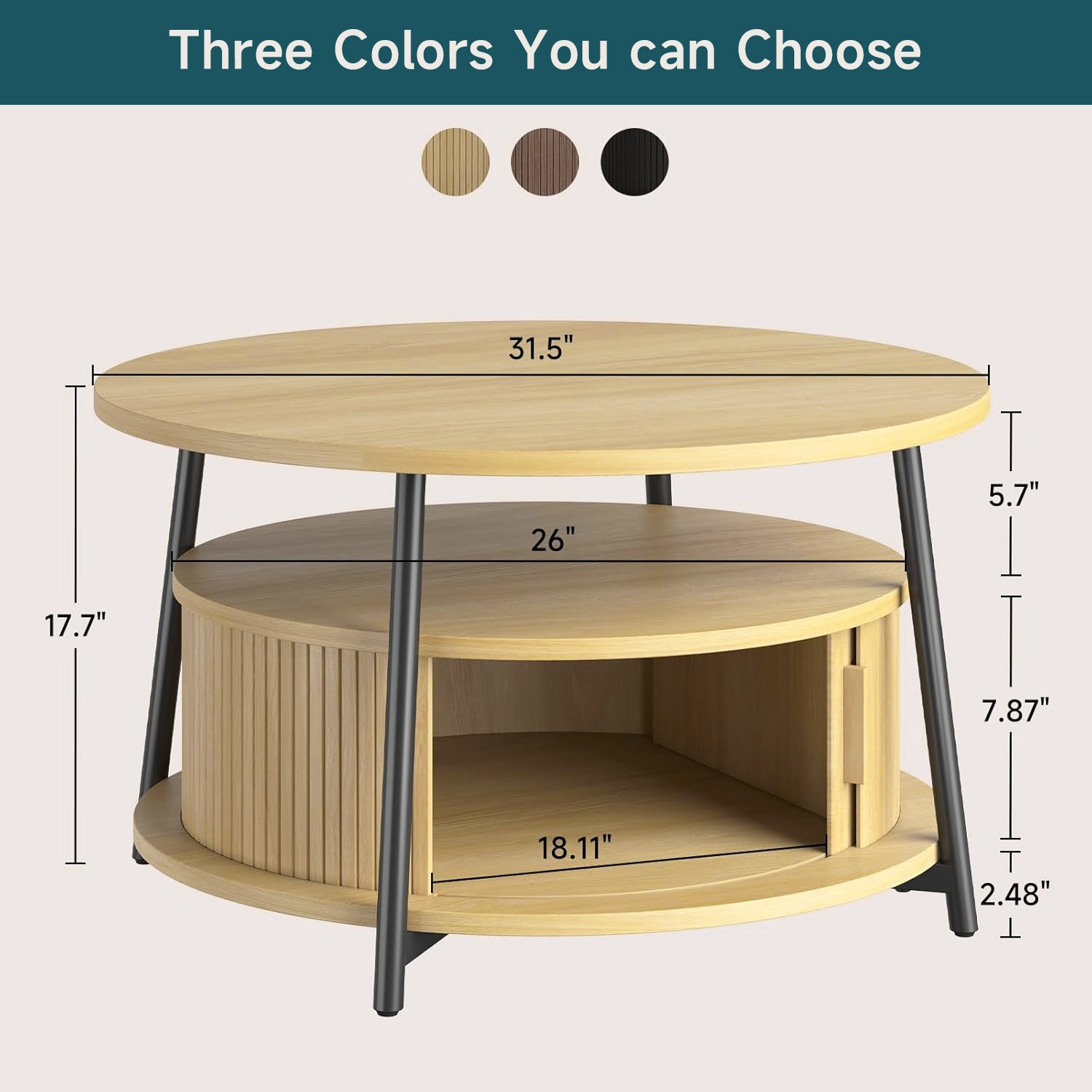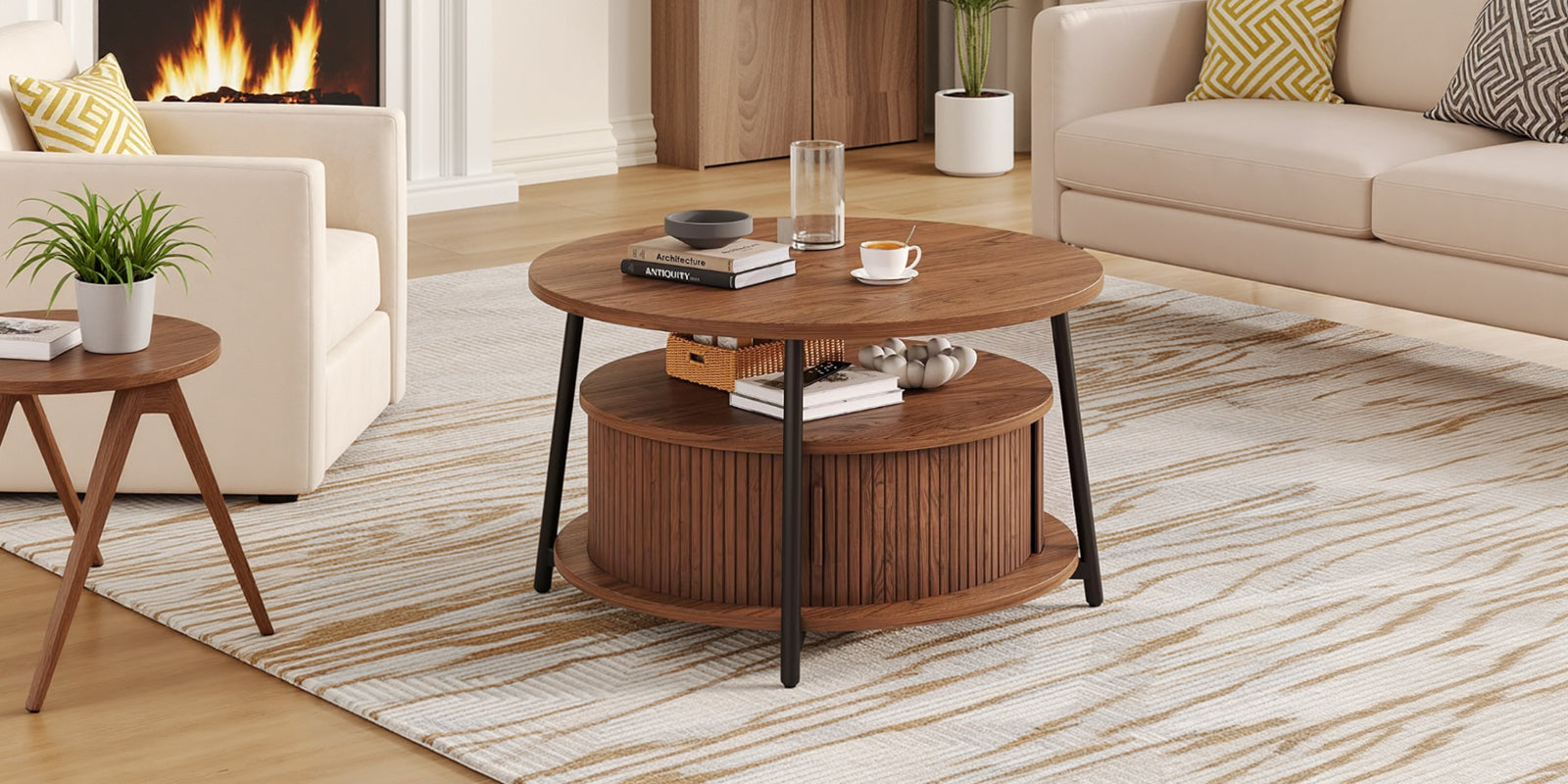 This modern center table features a three-tier storage design. The open middle shelf is easy to access and works well for books, magazines, or everyday items. The lower hidden compartment with smooth sliding doors is suitable for storing remotes, toys, or other small items out of sight.