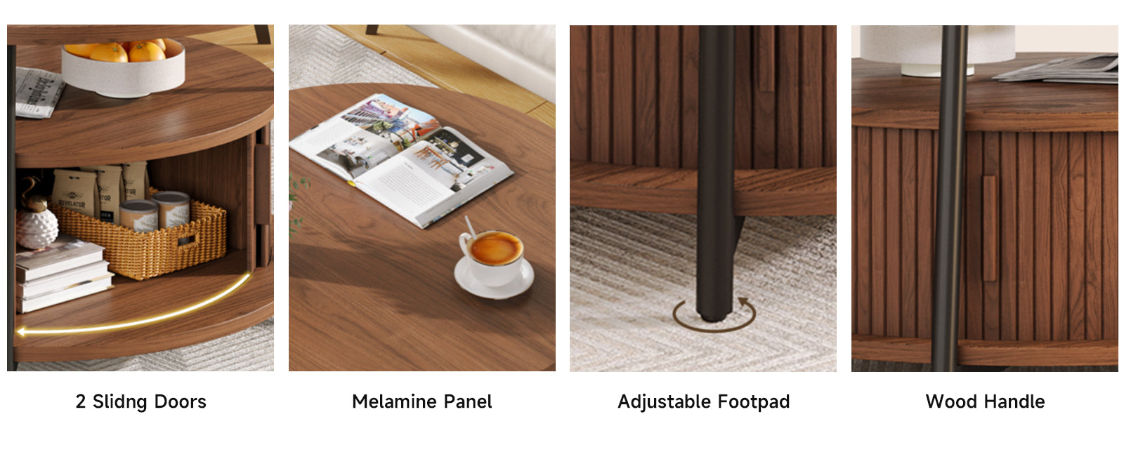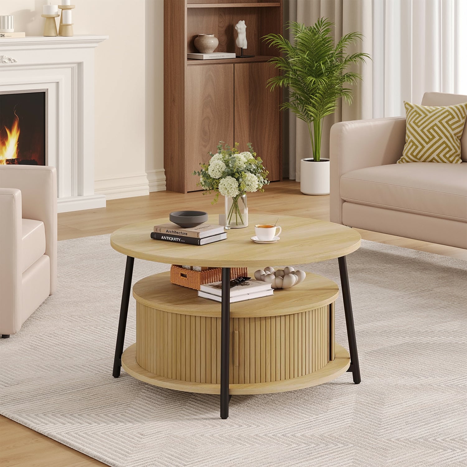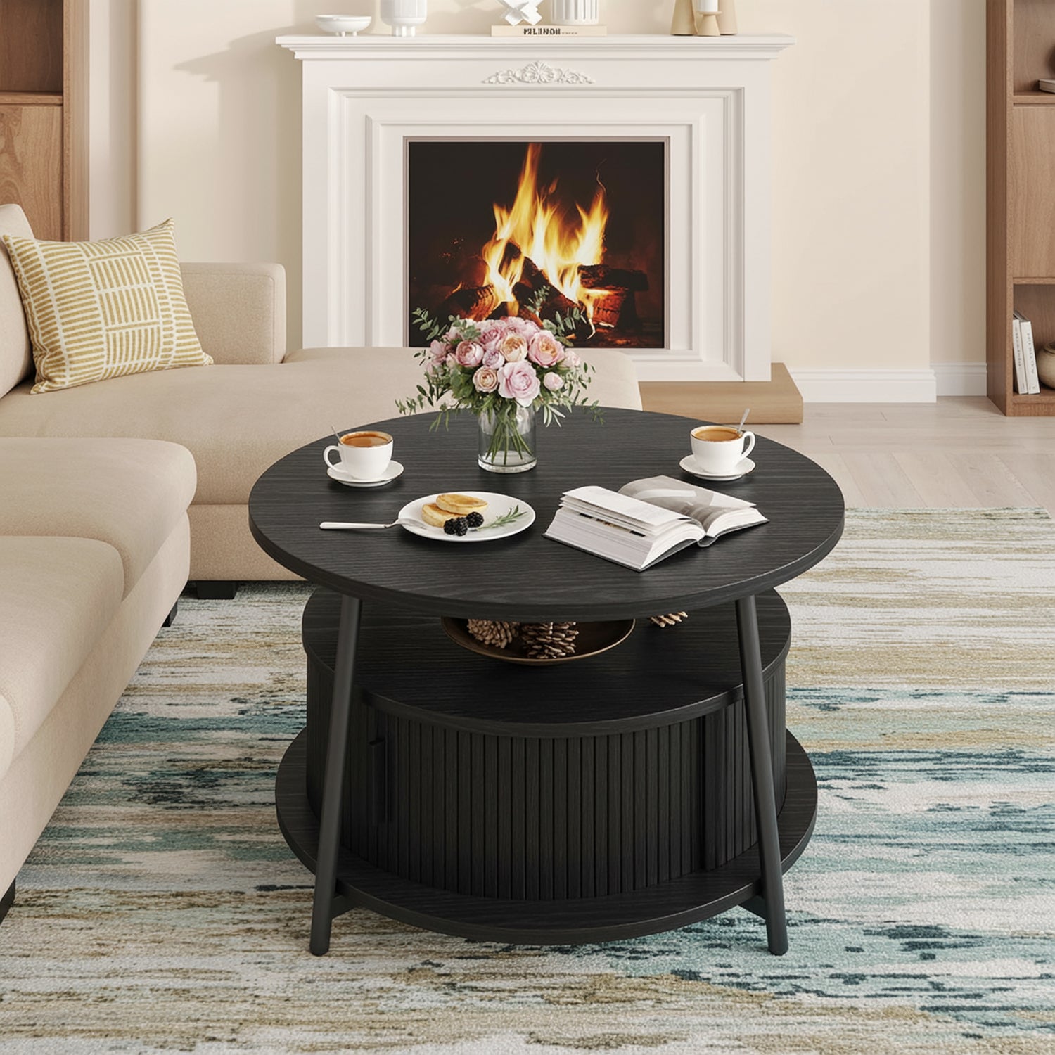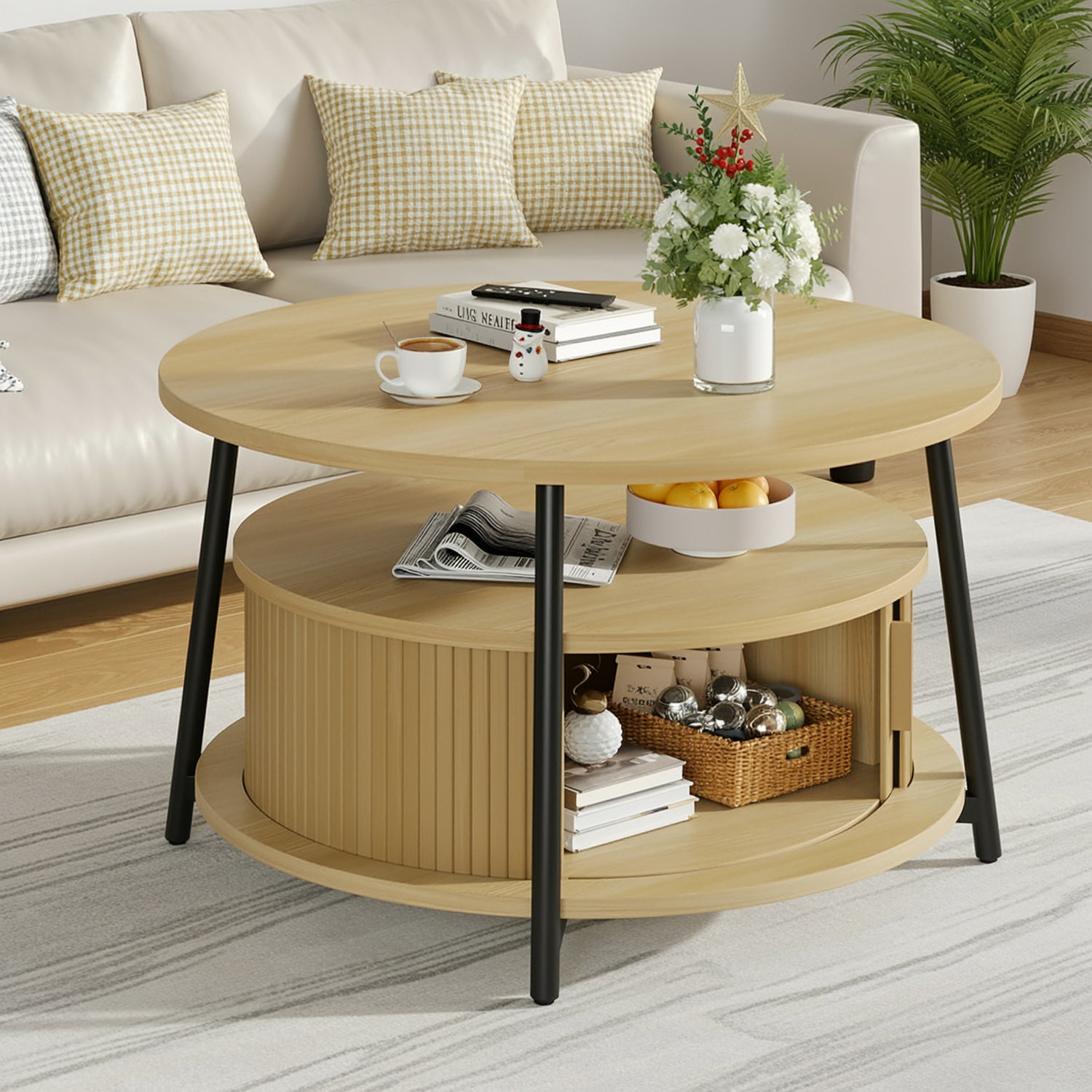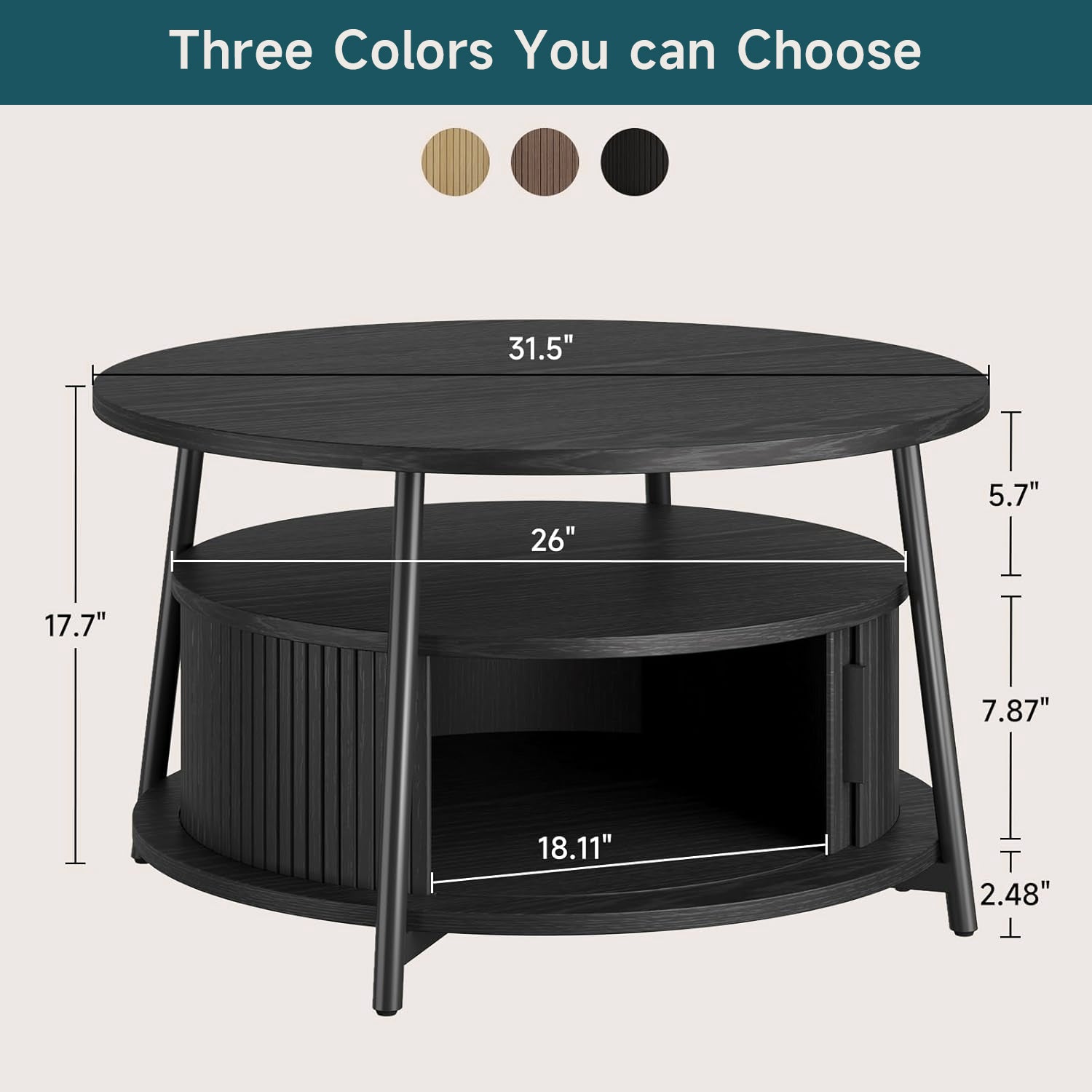 This modern center table features a three-tier storage design. The open middle shelf is easy to access and works well for books, magazines, or everyday items. The lower hidden compartment with smooth sliding doors is suitable for storing remotes, toys, or other small items out of sight.