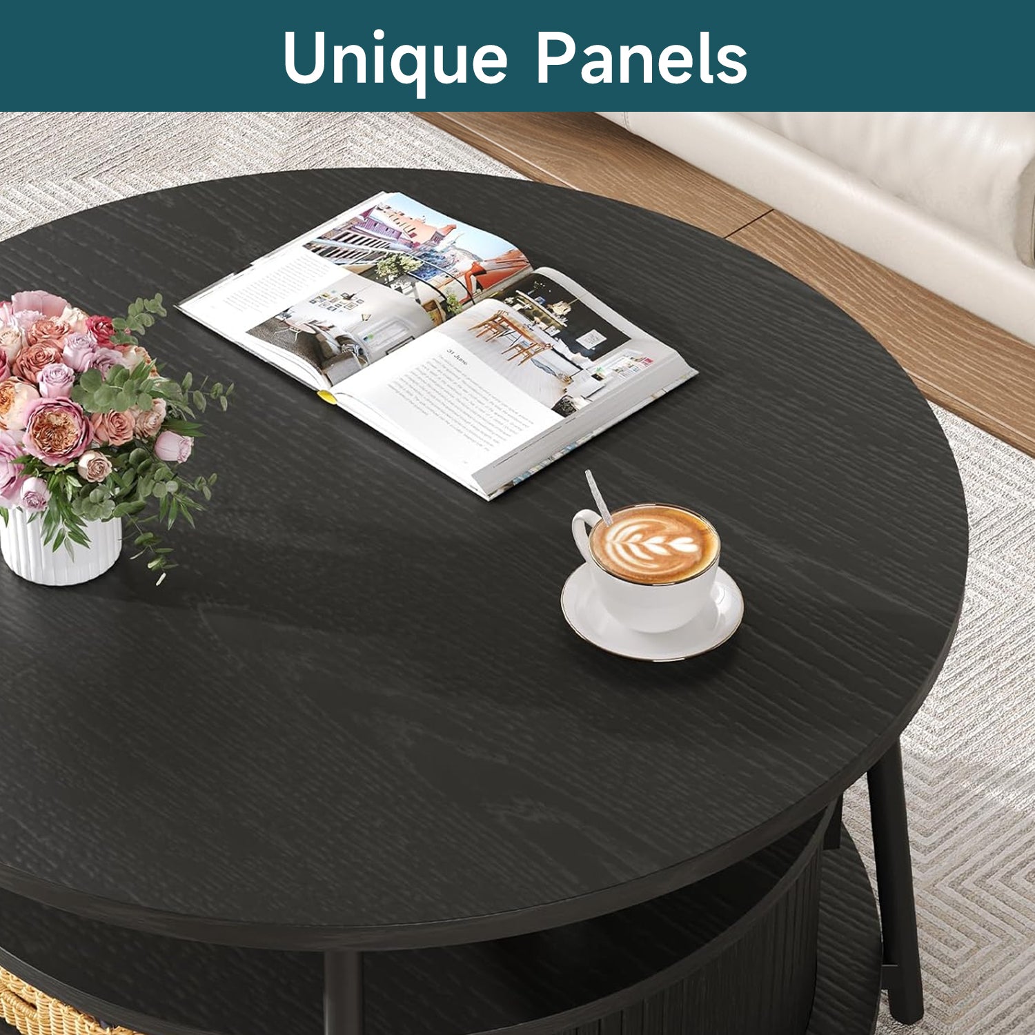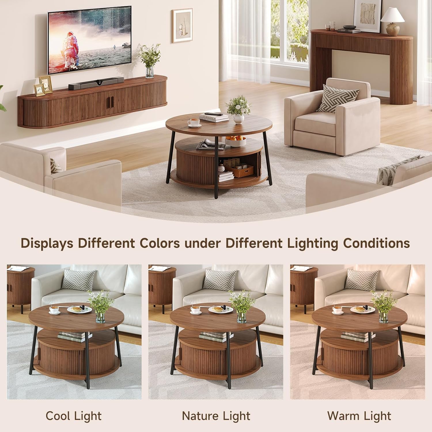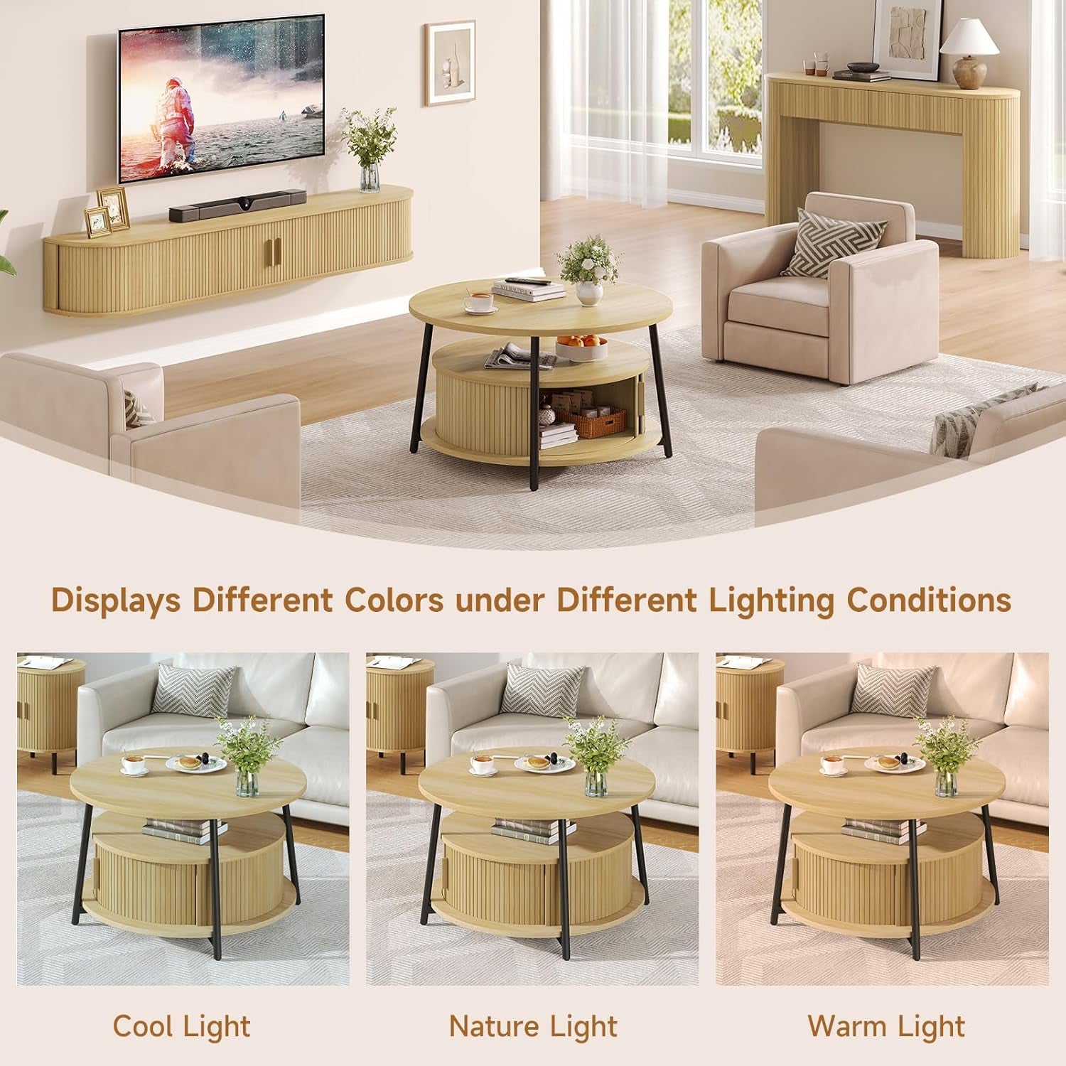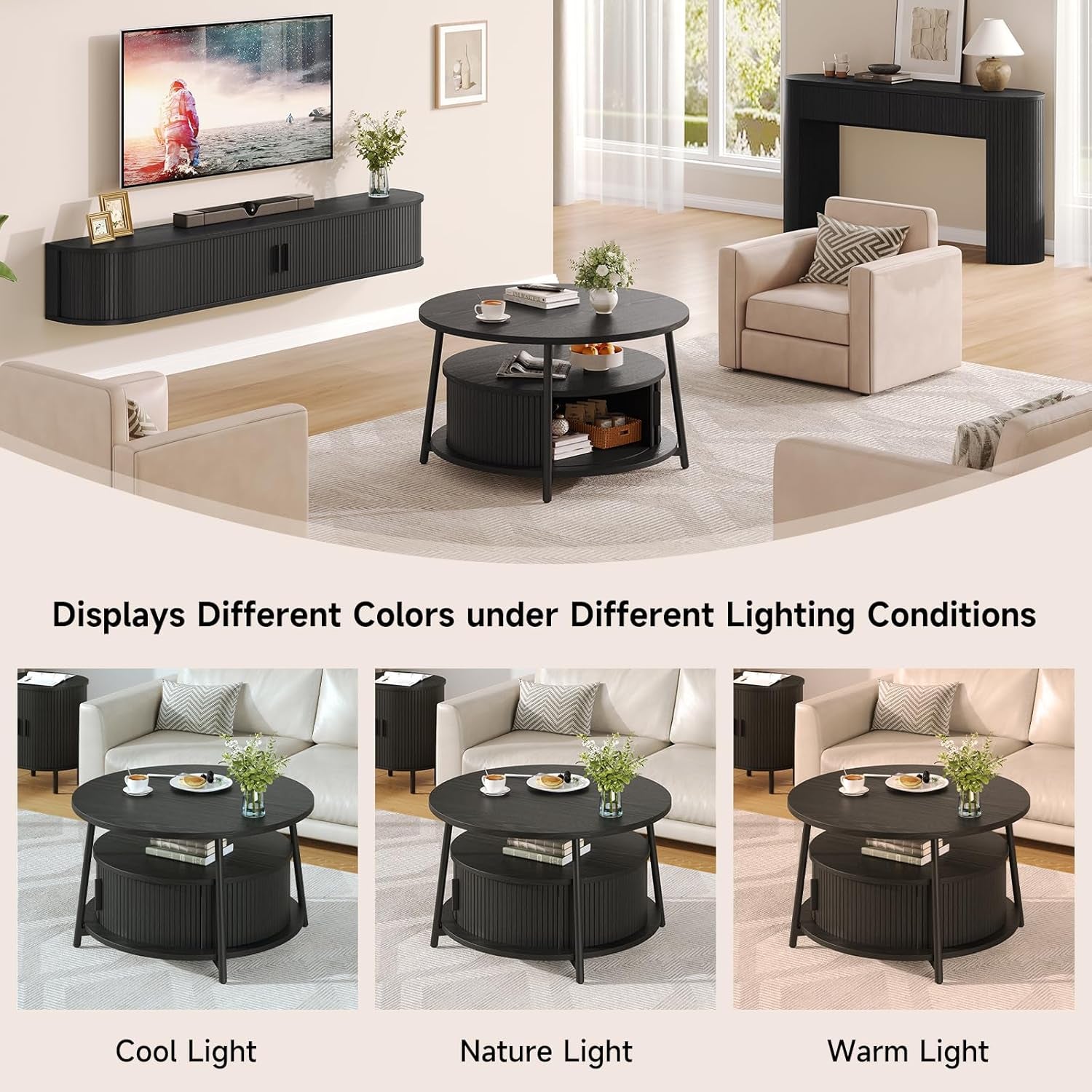 This modern center table features a three-tier storage design. The open middle shelf is easy to access and works well for books, magazines, or everyday items. The lower hidden compartment with smooth sliding doors is suitable for storing remotes, toys, or other small items out of sight.