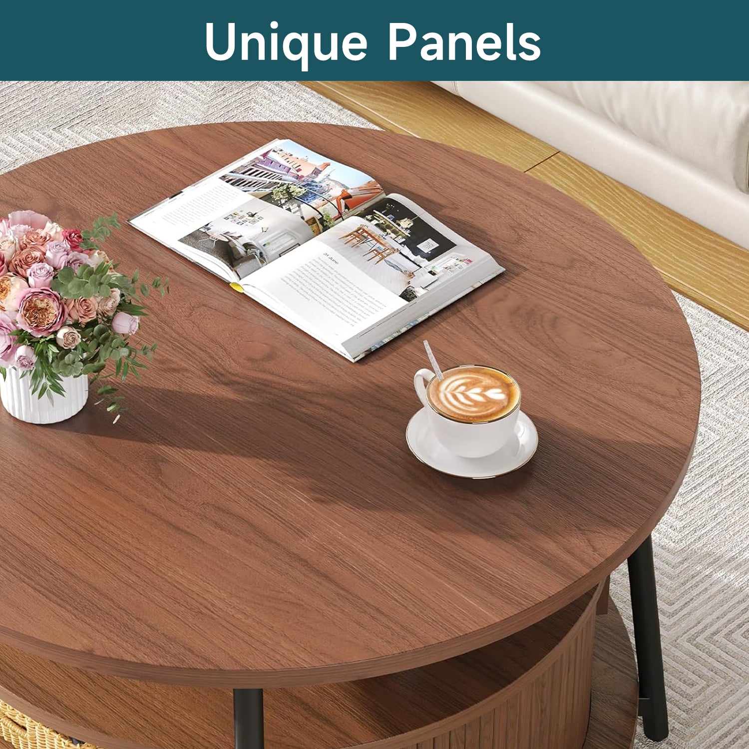 This round coffee table is made of engineered wood with steel legs and adjustable footpads, helping it stay stable on uneven floors.