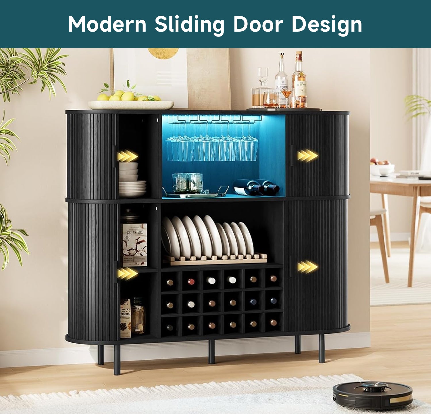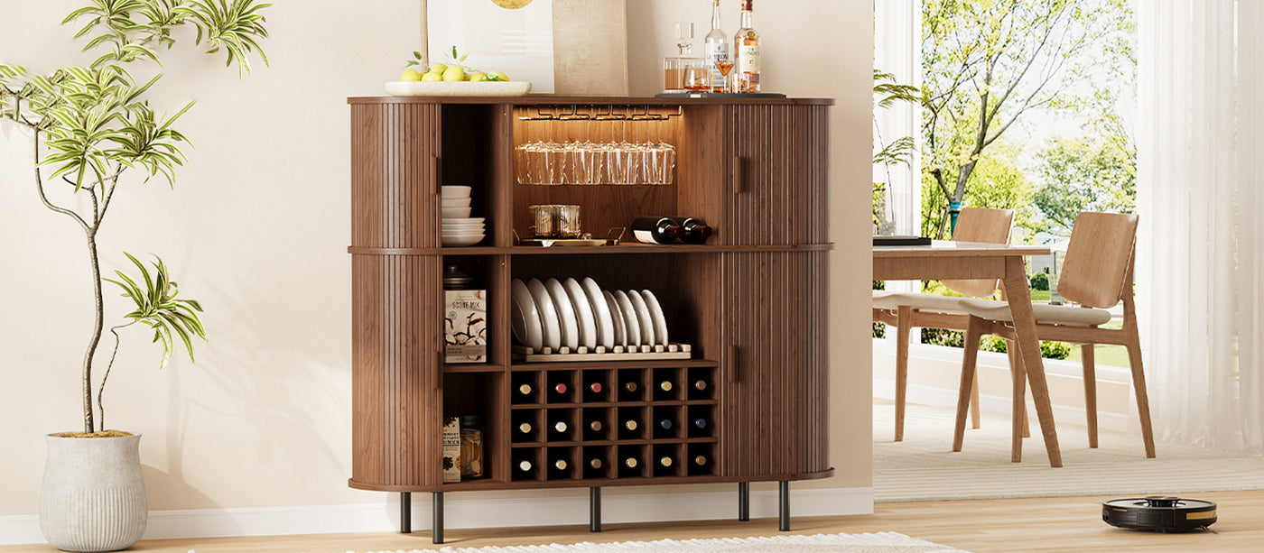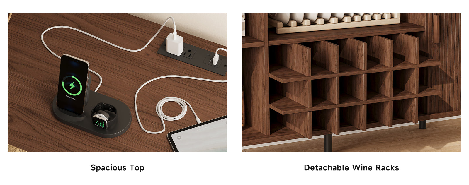 This cabinet provides both storage and serves multiple purposes. The top is wide enough to hold a coffee maker, microwave, or other small appliances. Inside, it features multiple shelves that allow you to organize bottles or kitchen items. If you don't need the wine rack, you can remove it to create a large compartment.