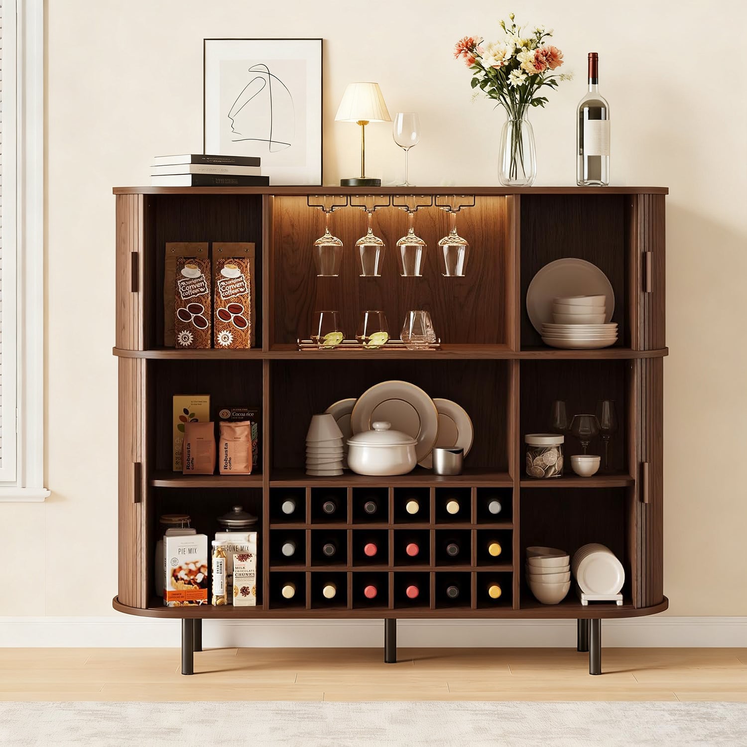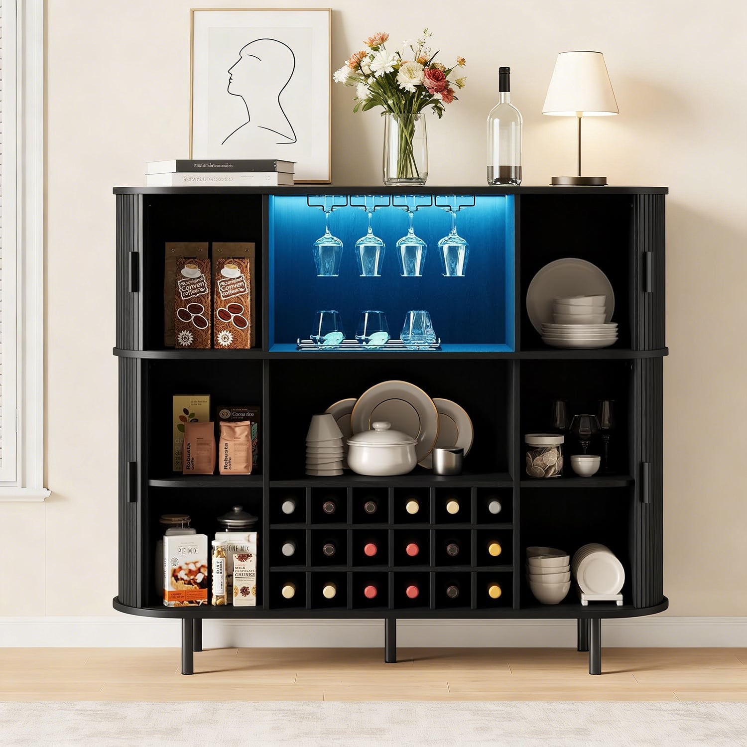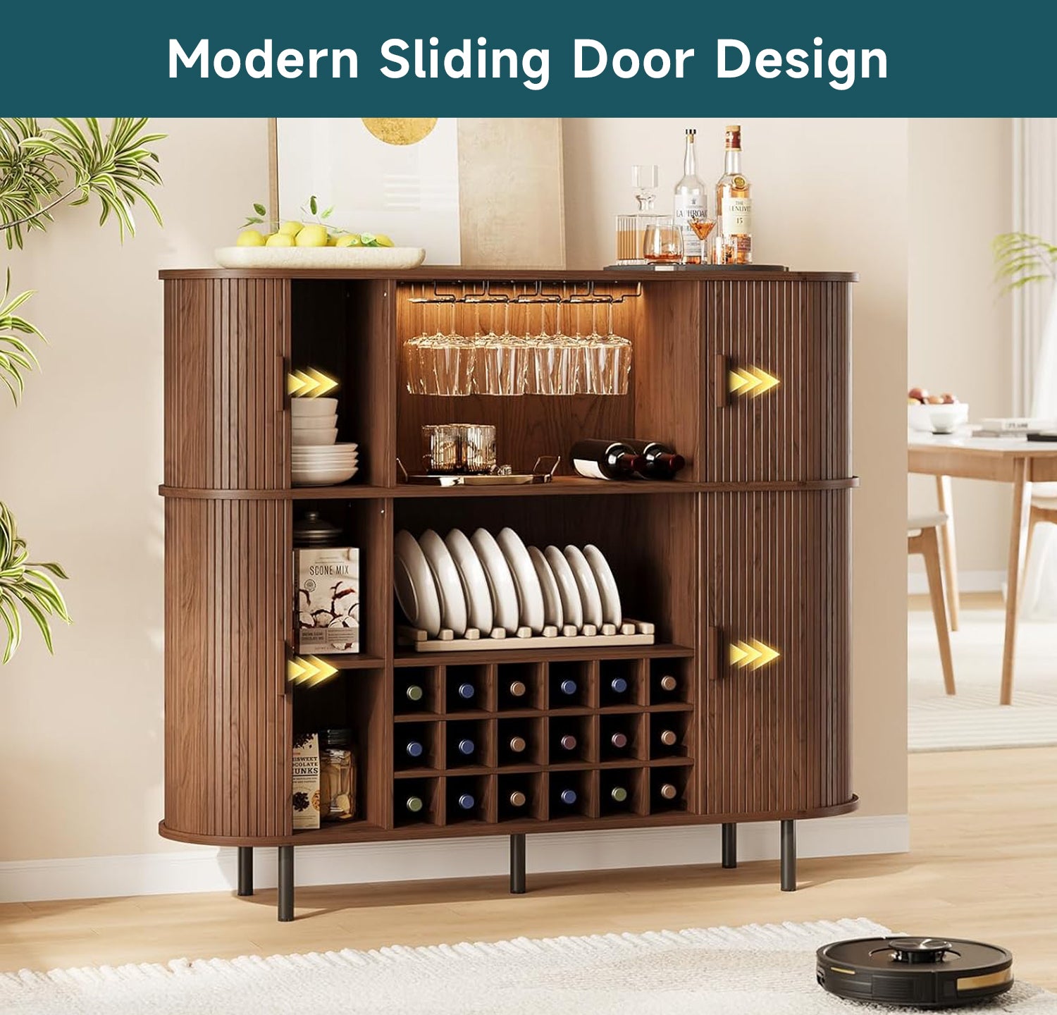 This cabinet provides both storage and serves multiple purposes. The top is wide enough to hold a coffee maker, microwave, or other small appliances. Inside, it features multiple shelves that allow you to organize bottles or kitchen items. If you don't need the wine rack, you can remove it to create a large compartment.