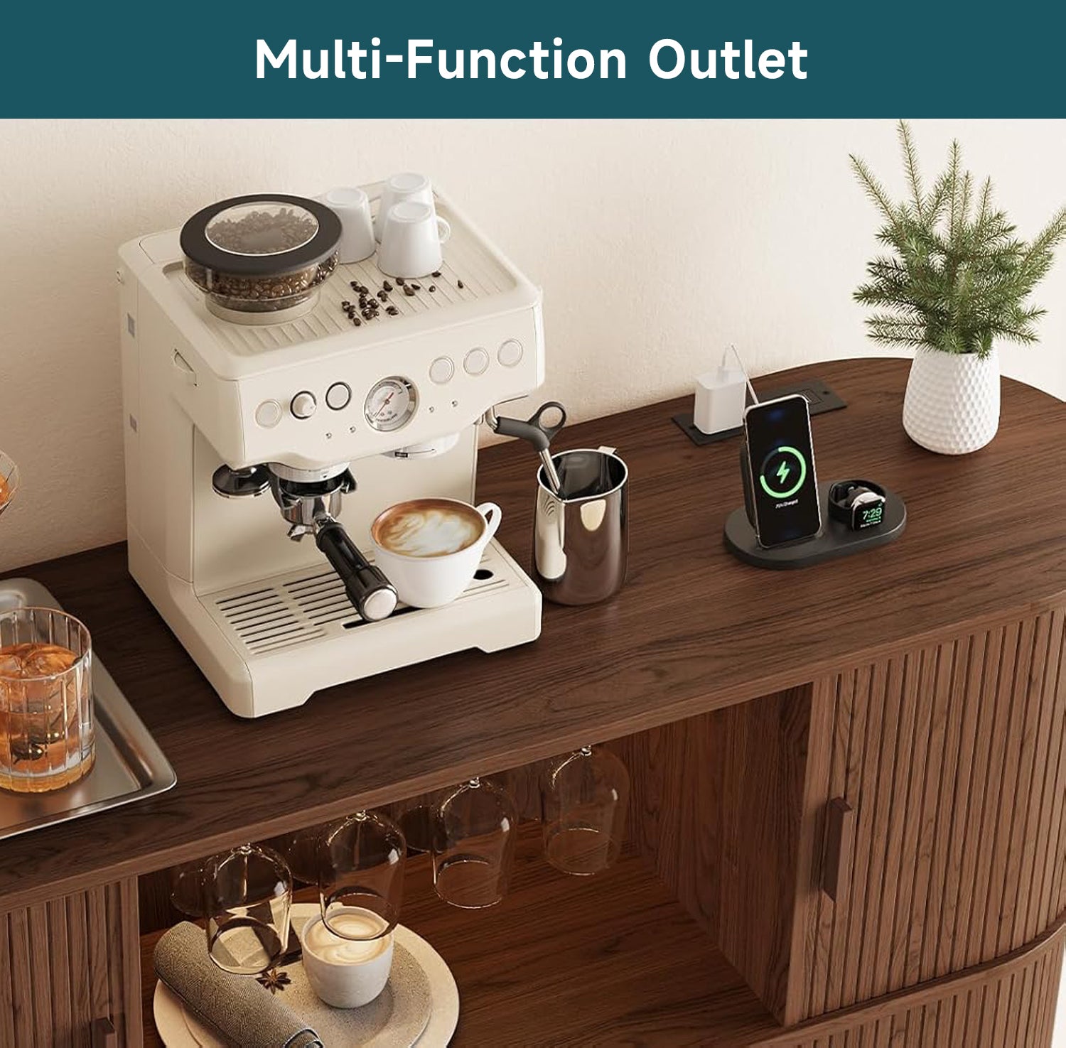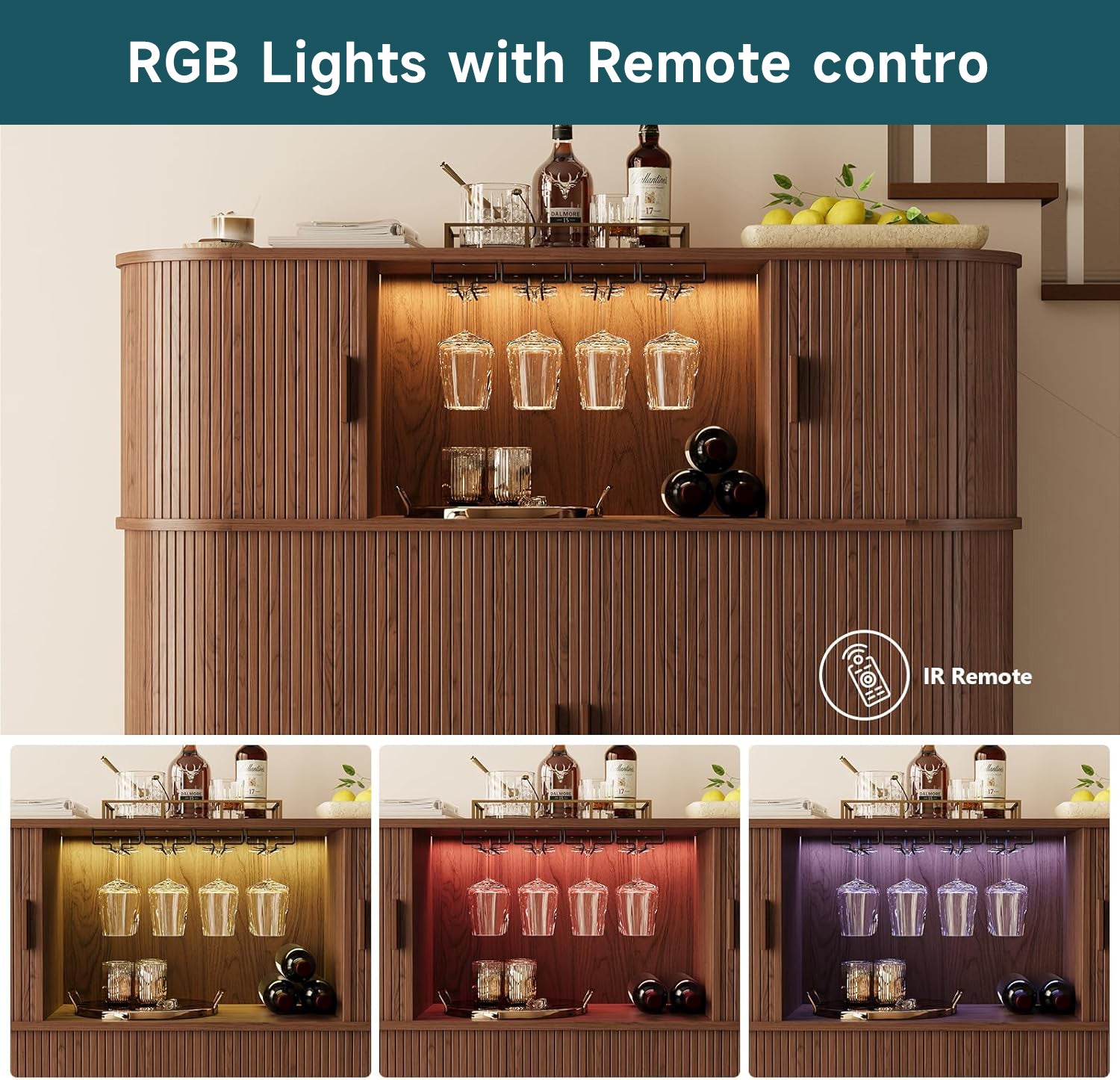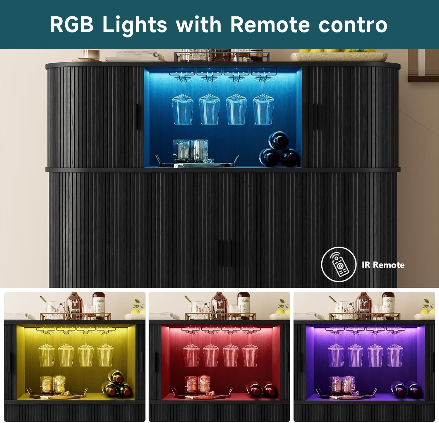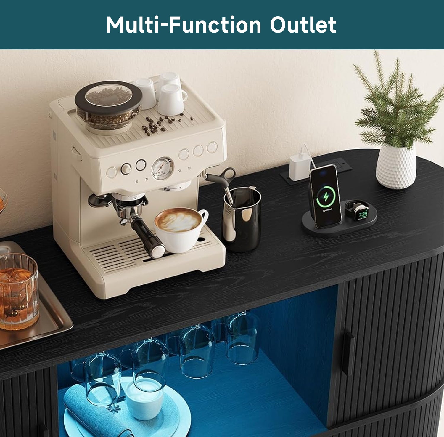 One of the handy features is the built-in power station. This coffee bar has two outlets and two USB ports, so you can plug in appliances or charge devices. There’s also RGB LED lighting you can control with a remote, letting you change the color or brightness depending on your mood or the room’s lighting.