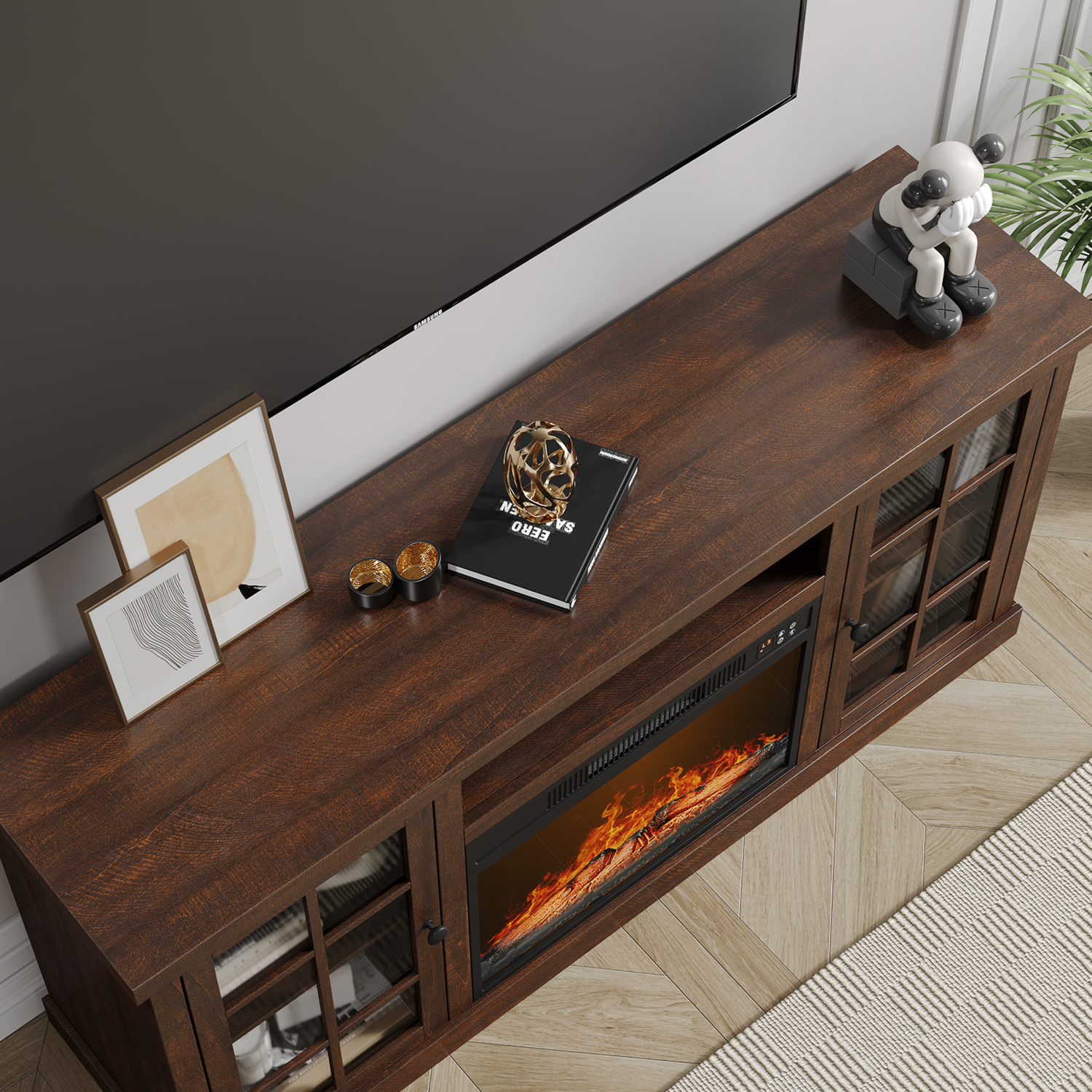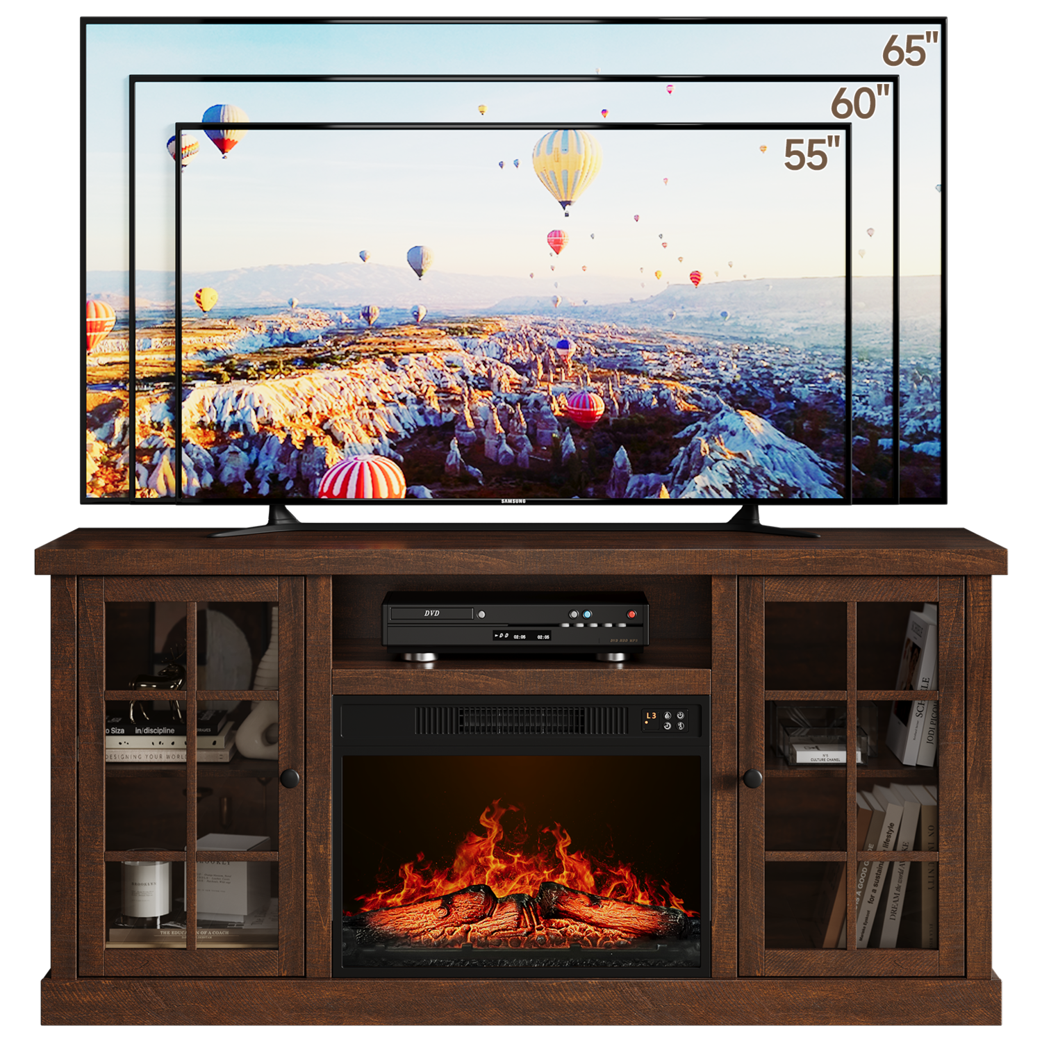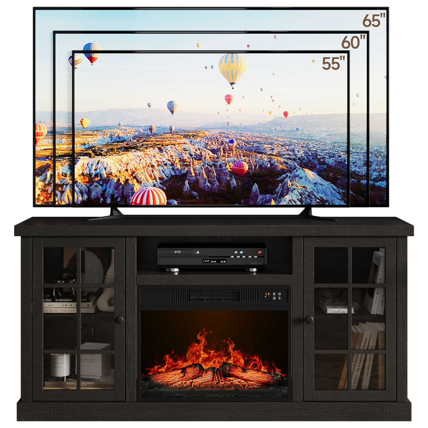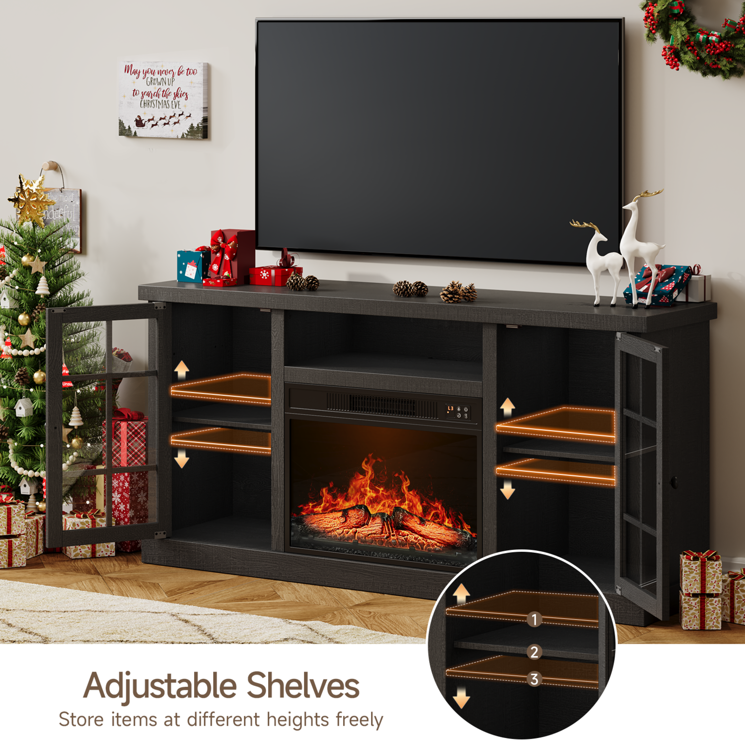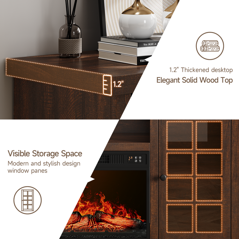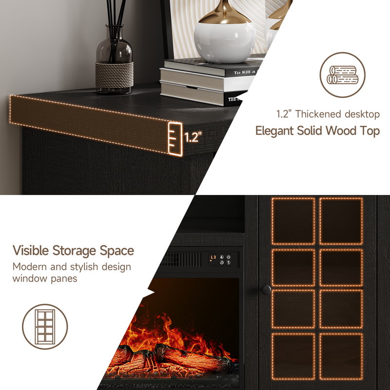 The fireplace TV cabinet provides plenty of storage space to keep your living room tidy. These two side cabinets have 3 heights of adjustable shelves for flexible storage. The 59-inch wide tabletop comfortably accommodates TVs up to 65 inches, making it the ideal focal point for a home entertainment center.