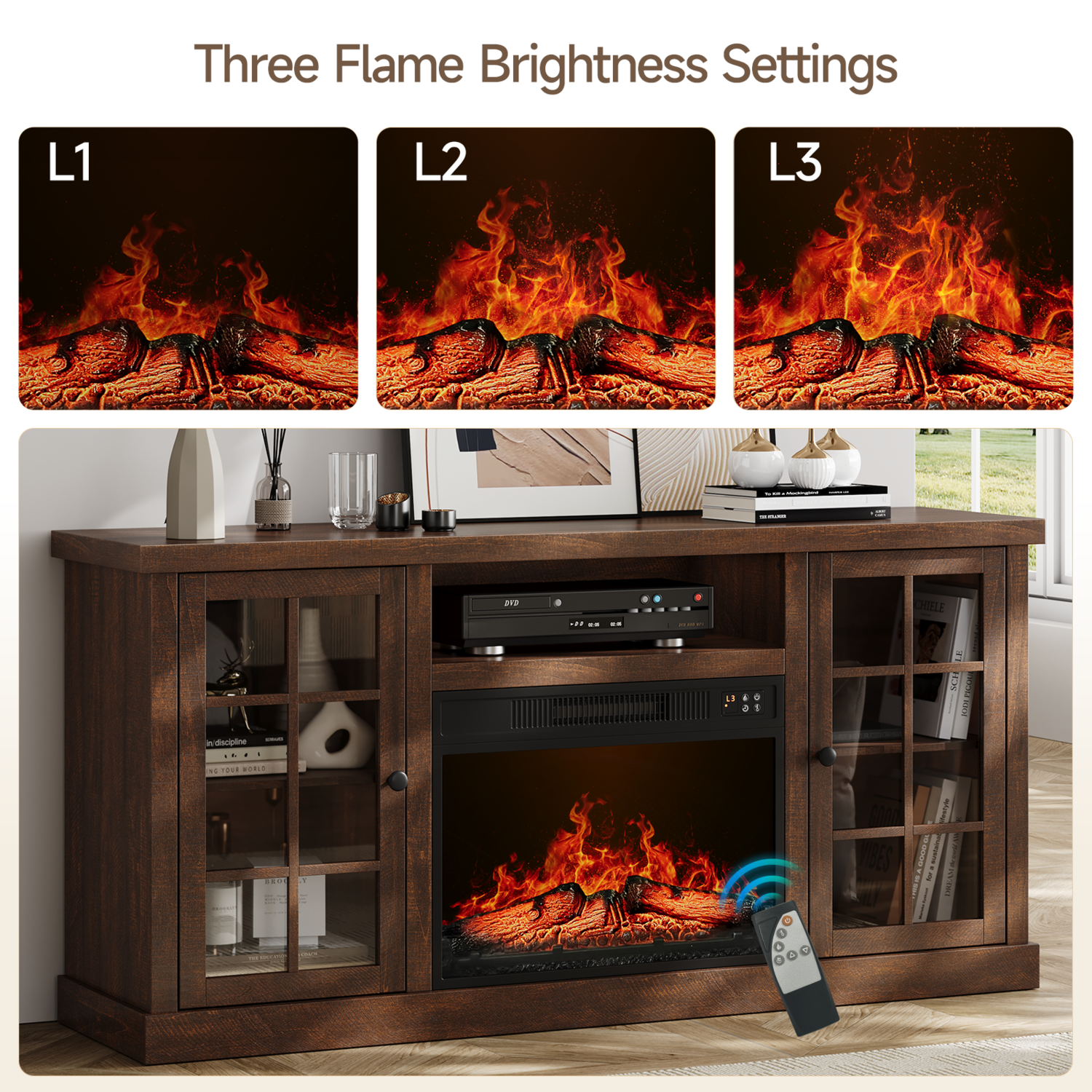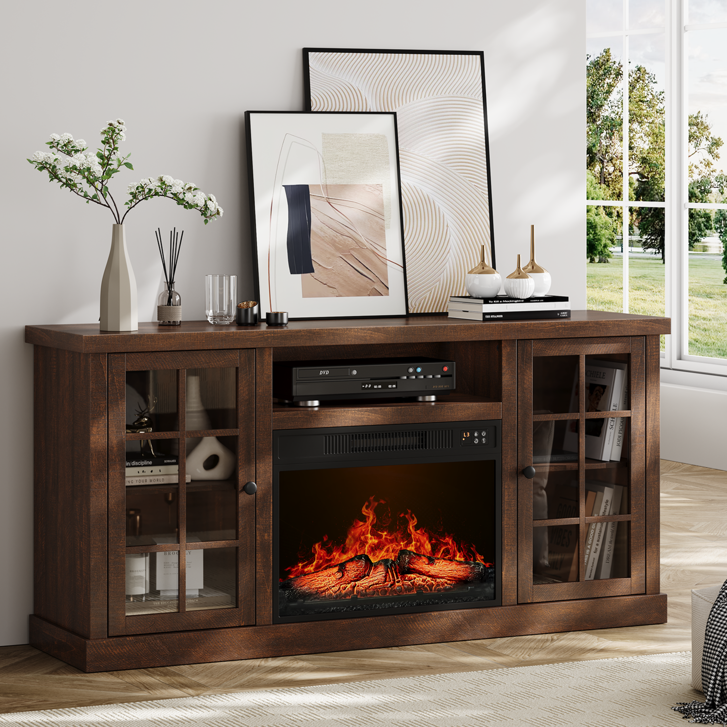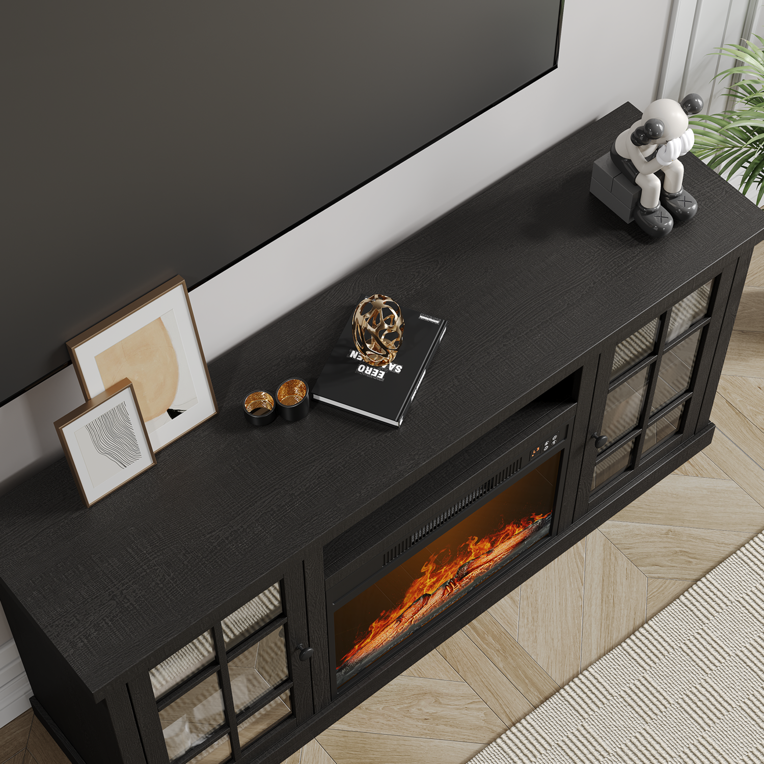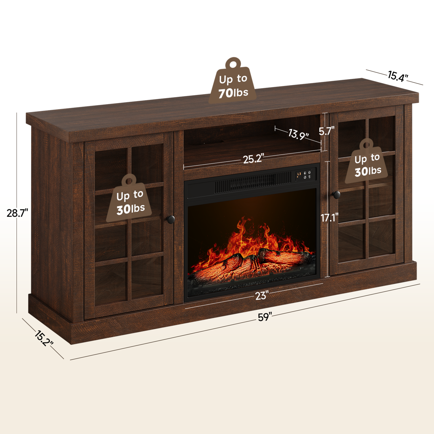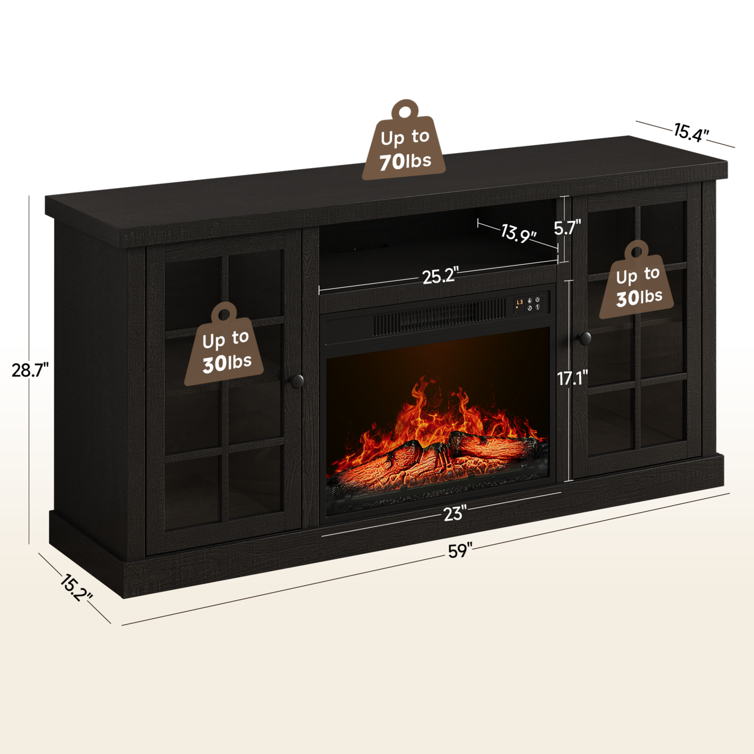 The fireplace TV cabinet provides plenty of storage space to keep your living room tidy. These two side cabinets have 3 heights of adjustable shelves for flexible storage. The 59-inch wide tabletop comfortably accommodates TVs up to 65 inches, making it the ideal focal point for a home entertainment center.