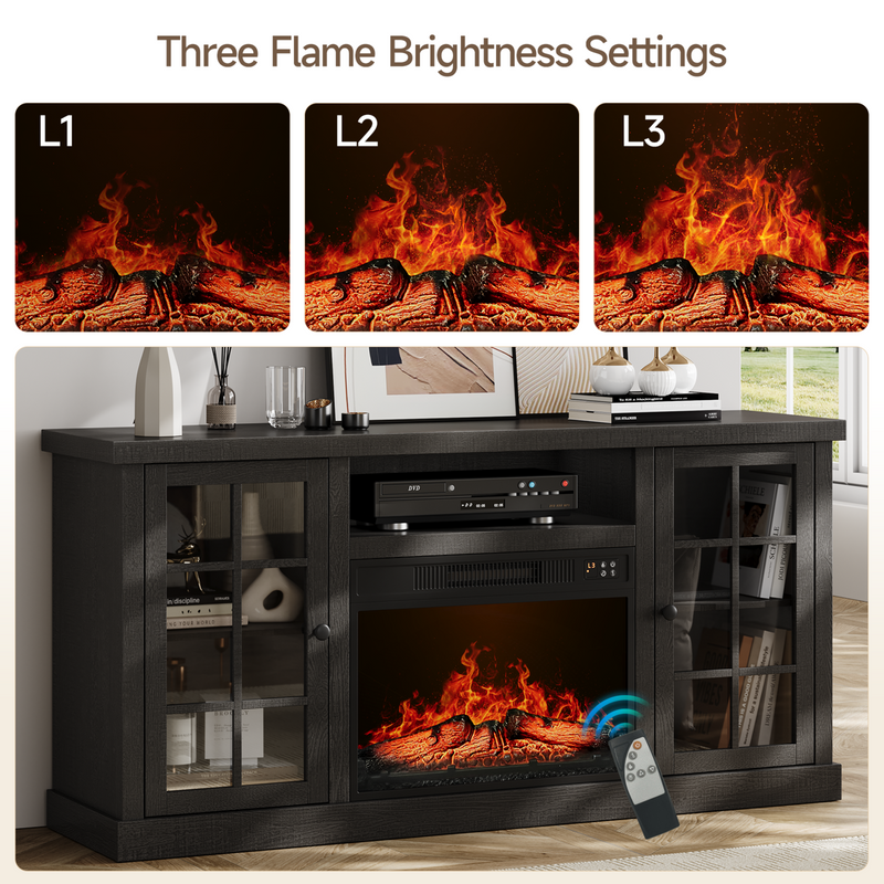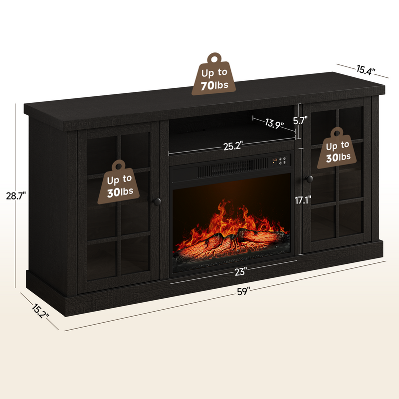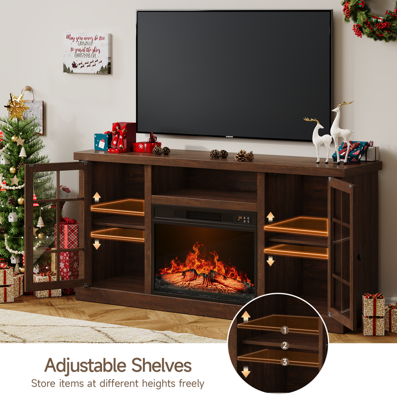 59 Inch Fireplace TV Stand, TV Table with 23 Inch Electric Fireplace, Media Console Cabinet with Storage and Glass Doors