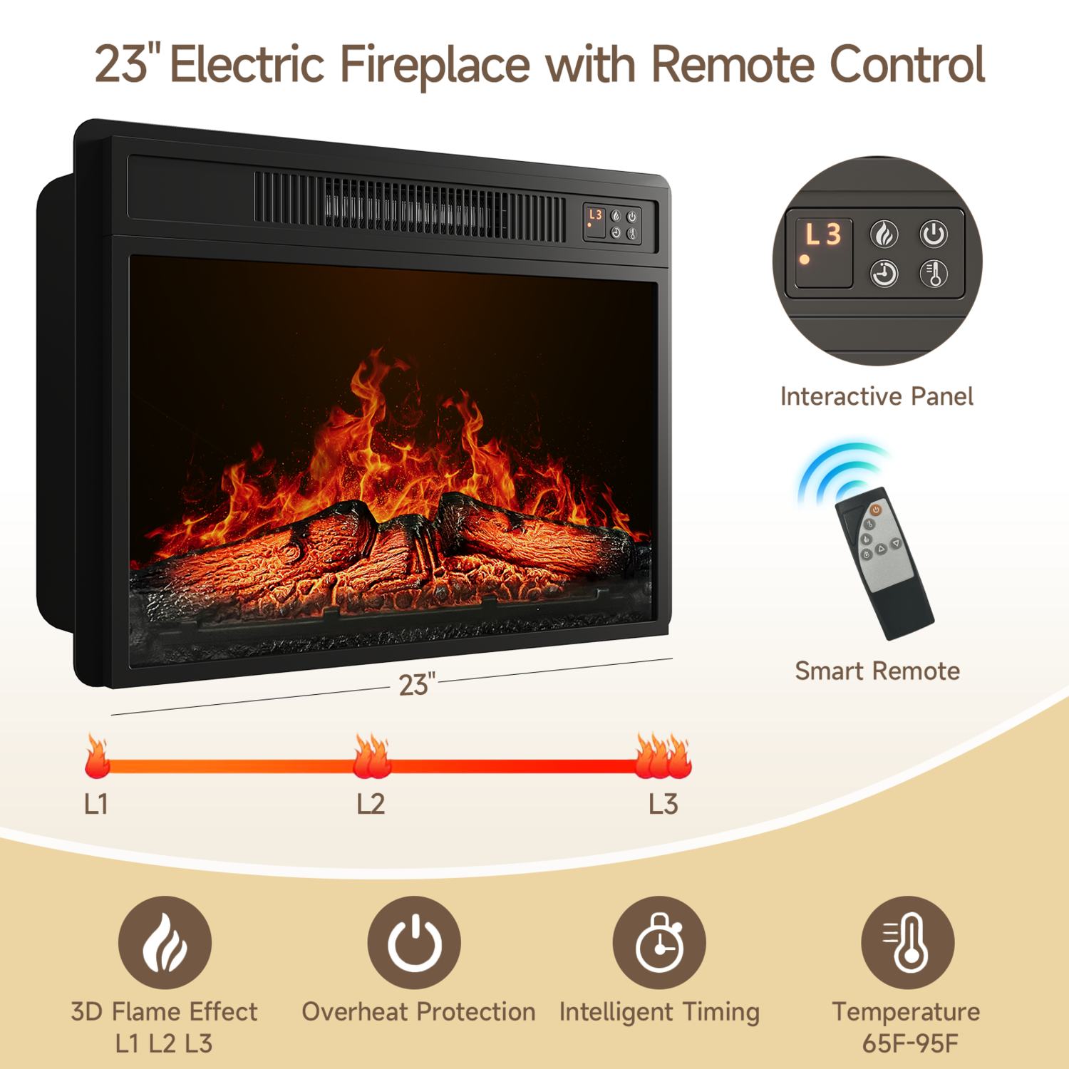 The fireplace offers both Fahrenheit and Celsius displays and can be easily controlled with the touch of a button or the included remote control. The integrated timer allows you to set the fireplace to shut off automatically in 0 to 6 hours, and the temperature can be adjusted from 62°F to 82°F, giving you complete control over your comfort.