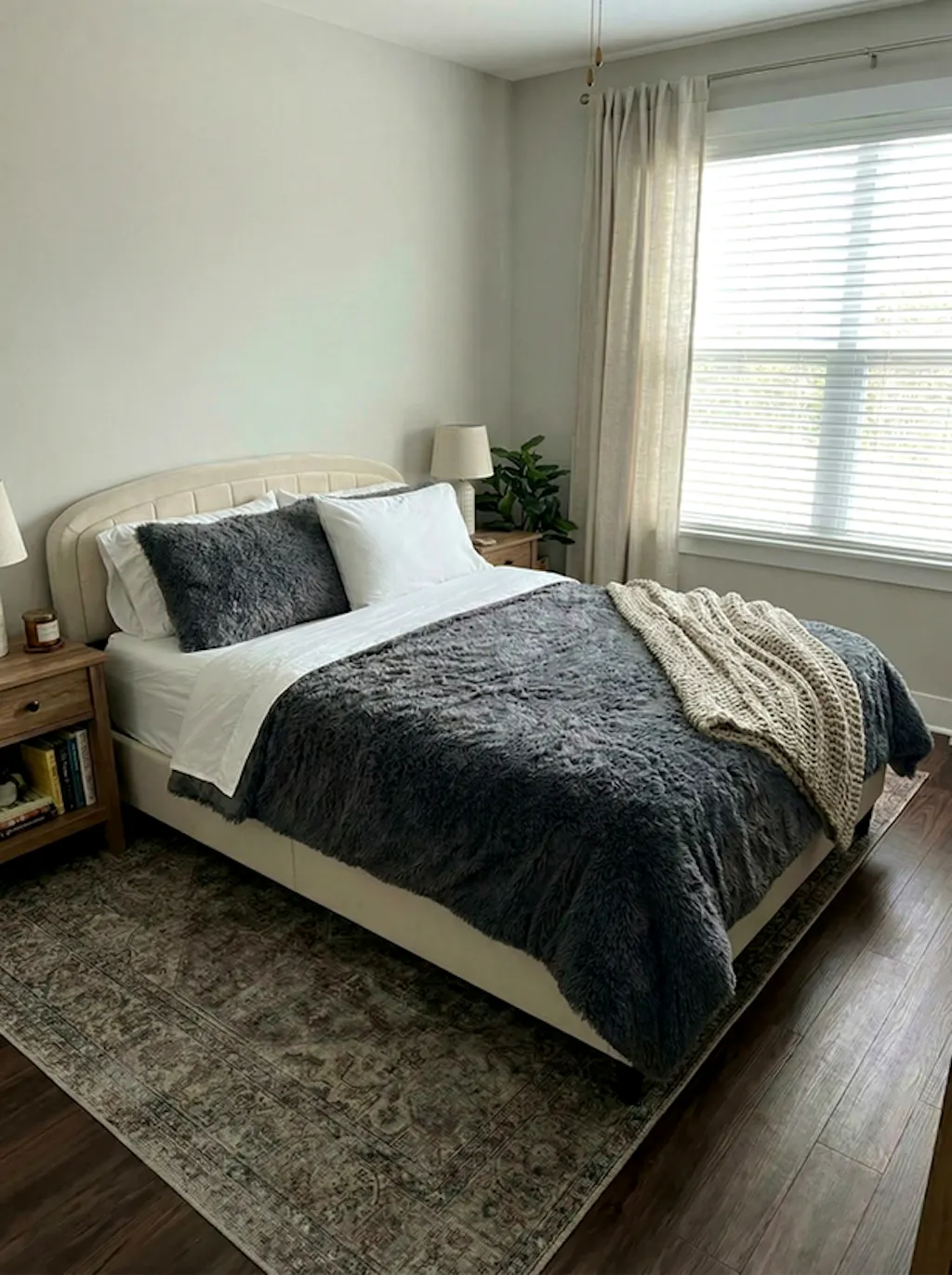The upholstered headboard features a vertical channel design that adds subtle texture to the space. The stitching helps keep the padding in place and supports its shape over time.