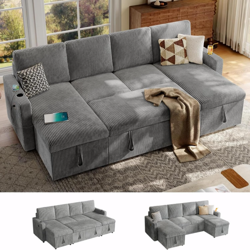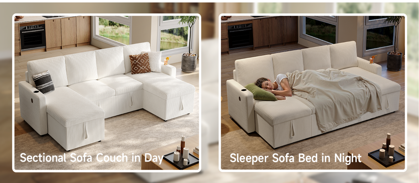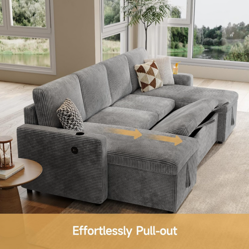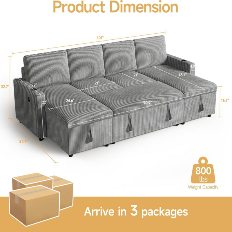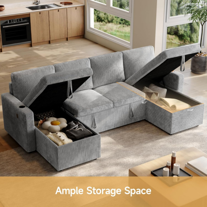 101 Inch U-Shaped Sleeper Sofa Couch with Pull Out Bed, Corduroy Sectional Sofa Bed Couch with Double Storage Chaise, 2 Charging Ports, Cup Holder