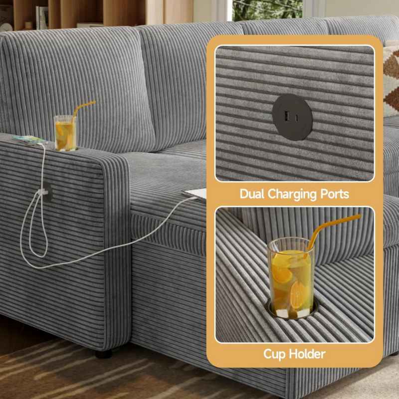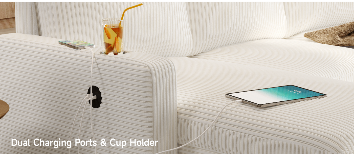This couch bed is thoughtfully designed with charging ports, and hassle-free charging. It also features a cup holder design, allowing you to place your water cups and enjoy leisure time conveniently. This couch bed effortlessly combines style and functionality, elevating the versatility of your living space.