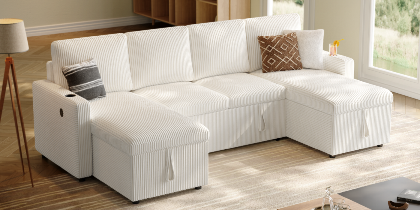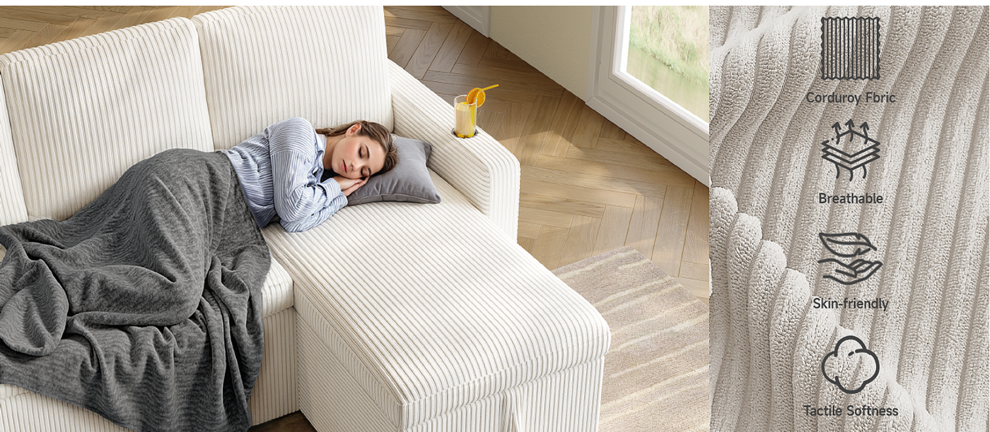This u-shaped couch effortlessly transforms into a spacious sleeper sofa, offering nearly 28 sq ft of sleeping area, ideal for two adults to enjoy a restful night's sleep. Its compact design saves space and enhances quality of life, making it a perfect choice for small families.