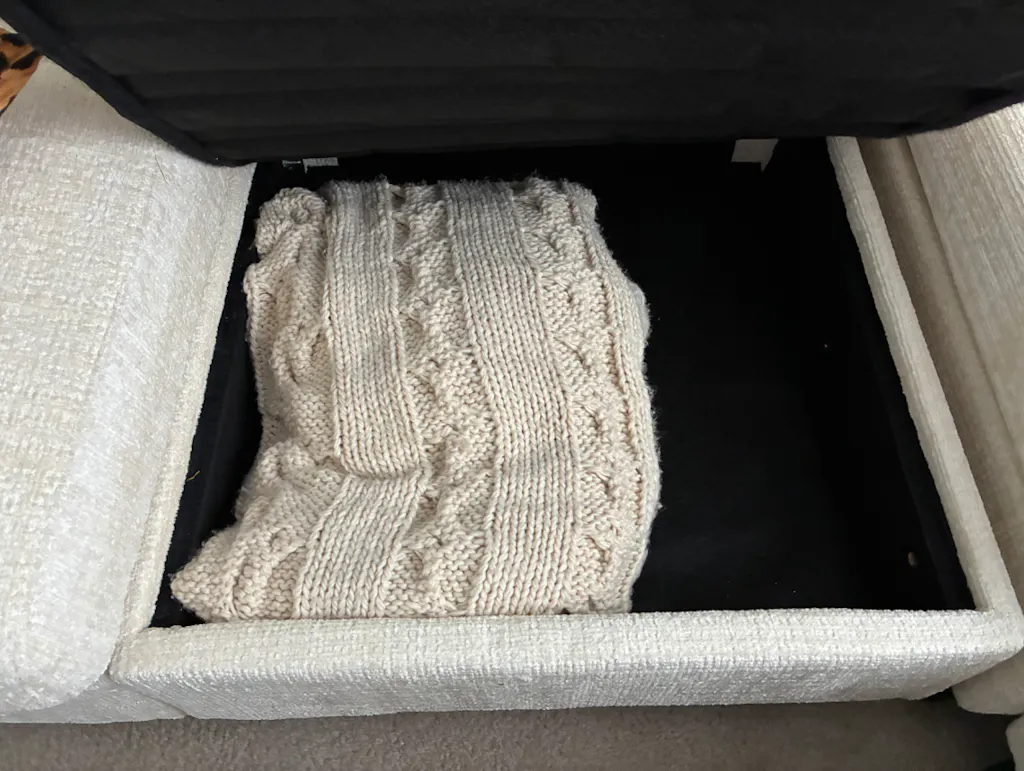 Each seat of this sectional sofa features hidden storage space underneath, perfect for storing seasonal blankets, extra throw pillows, kid's toys, and any other miscellaneous items you wish to organize. The concealed storage helps keep your living room tidy and orderly, enhancing the overall comfort and aesthetic appeal of your home. The built-in charging outlet on the armrest side lets you easily power up your devices, eliminating clutter from tangled cords. Additionally, the cup holder on the armrest provides a secure spot for your beverages, making it perfect for relaxation and entertainment.