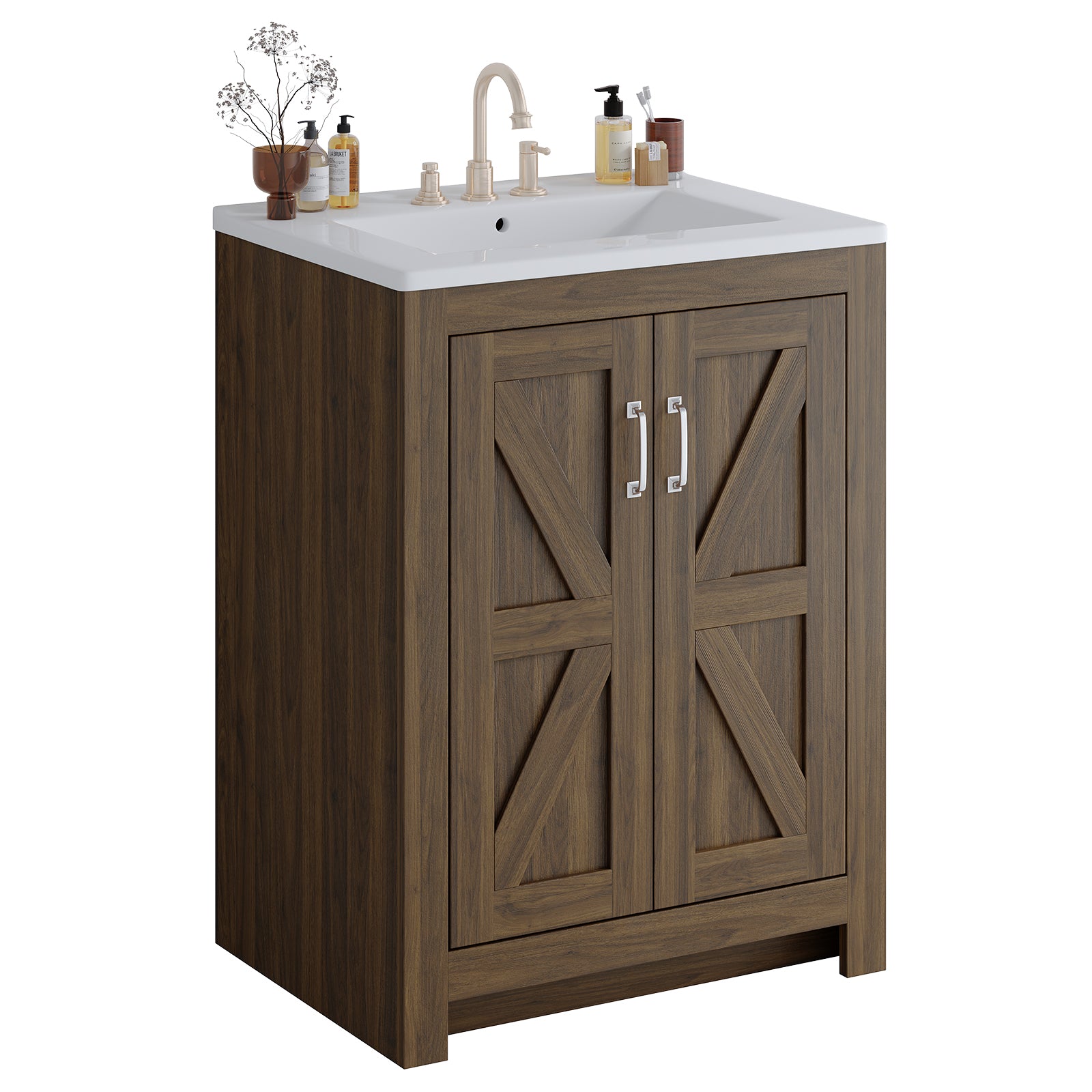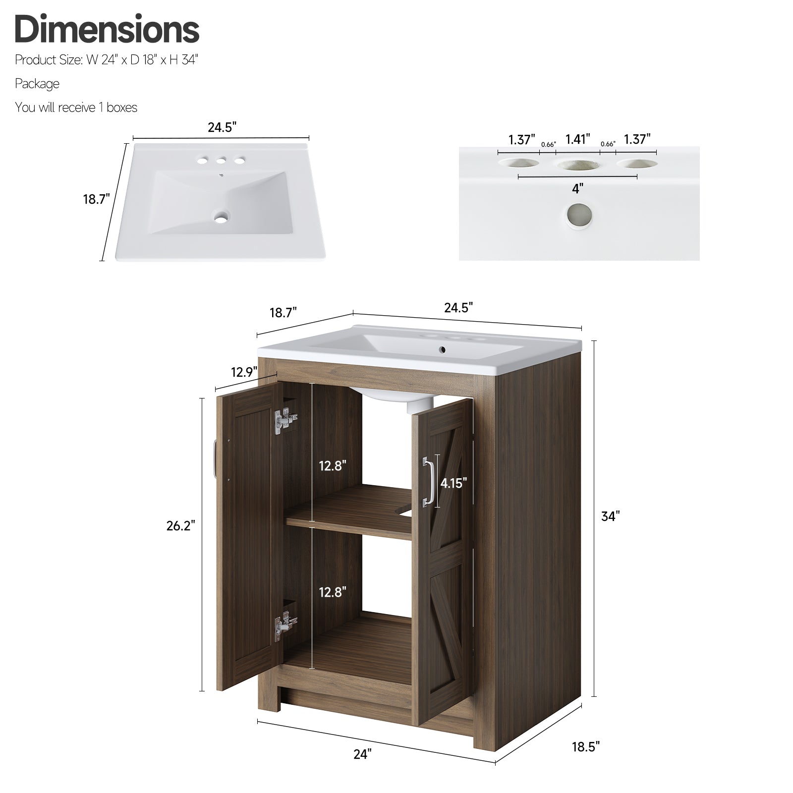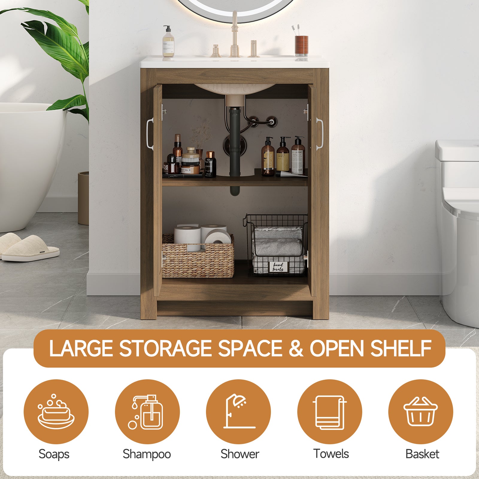 This bathroom vanity is 24 inches wide and comes with a ceramic sink and a wooden cabinet. The vanity cabinet is made of engineered wood and MDF with a reinforced frame and base, which ensures stability and durability.