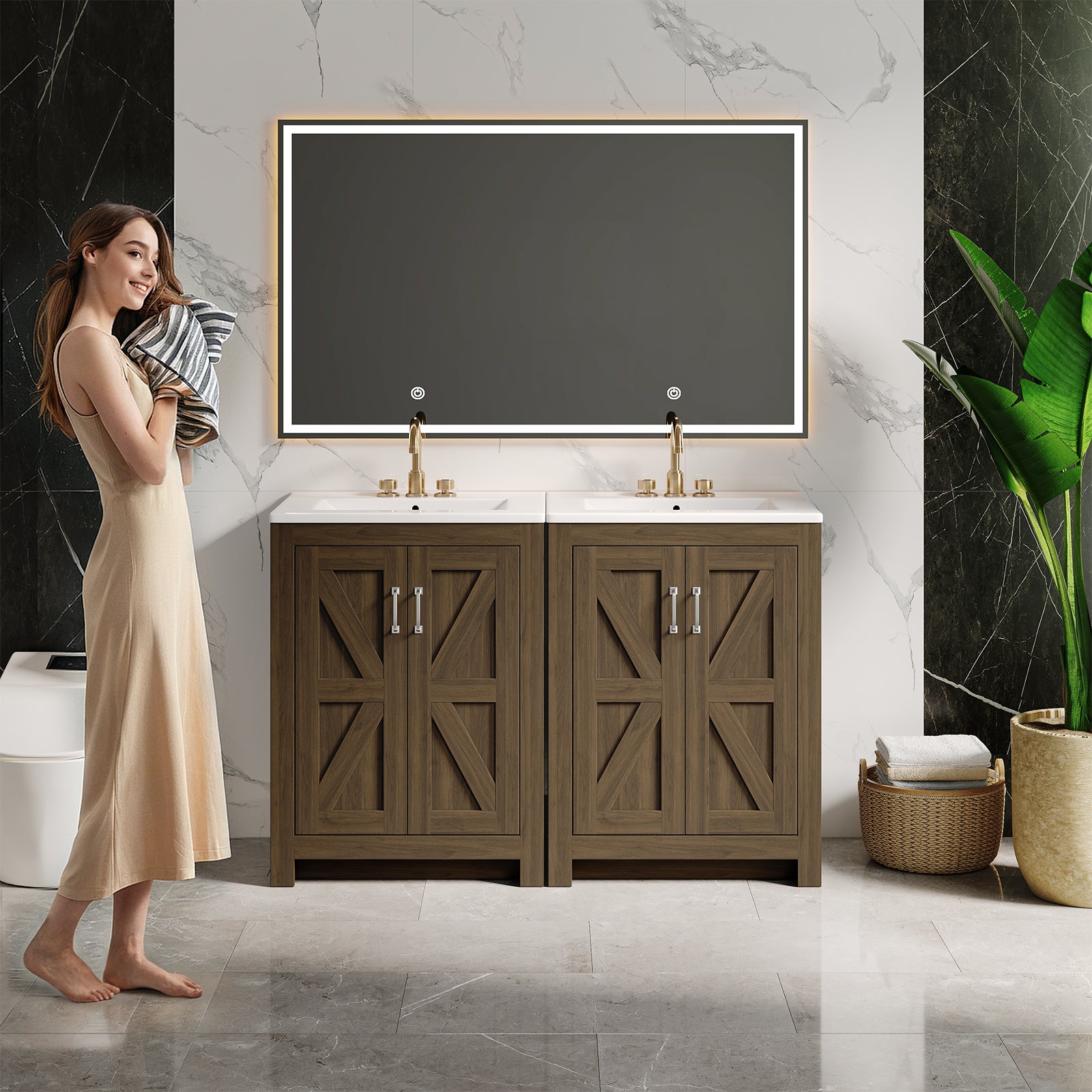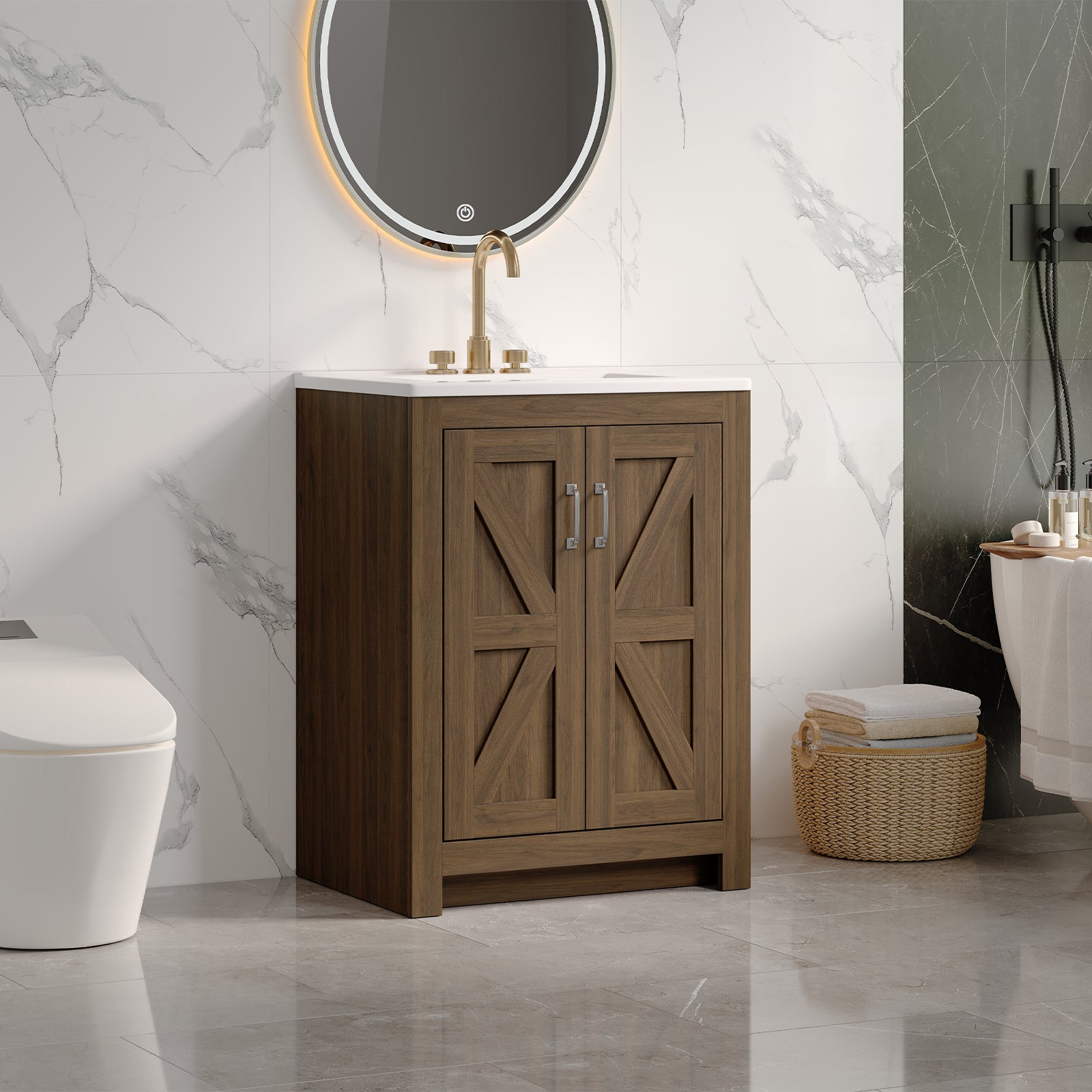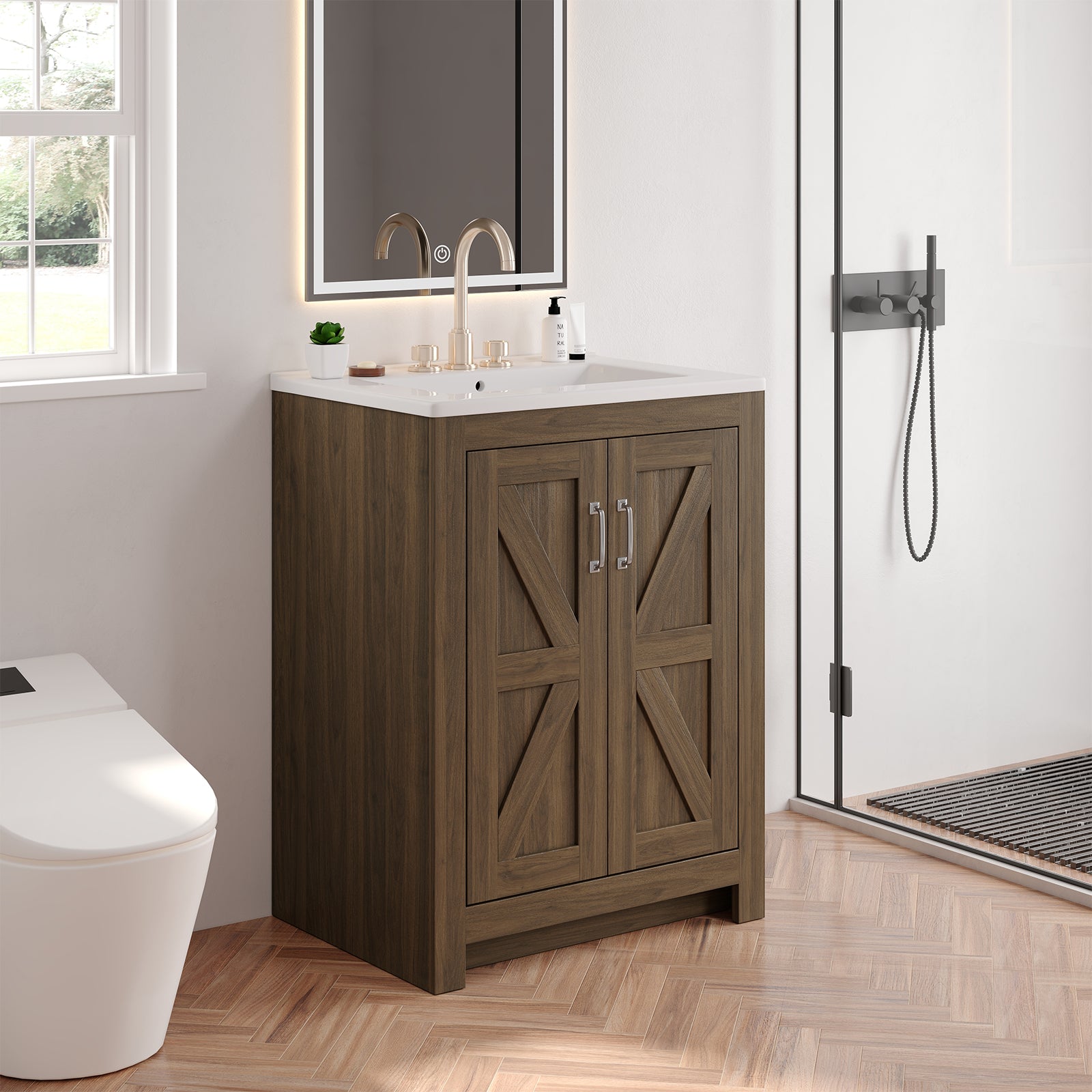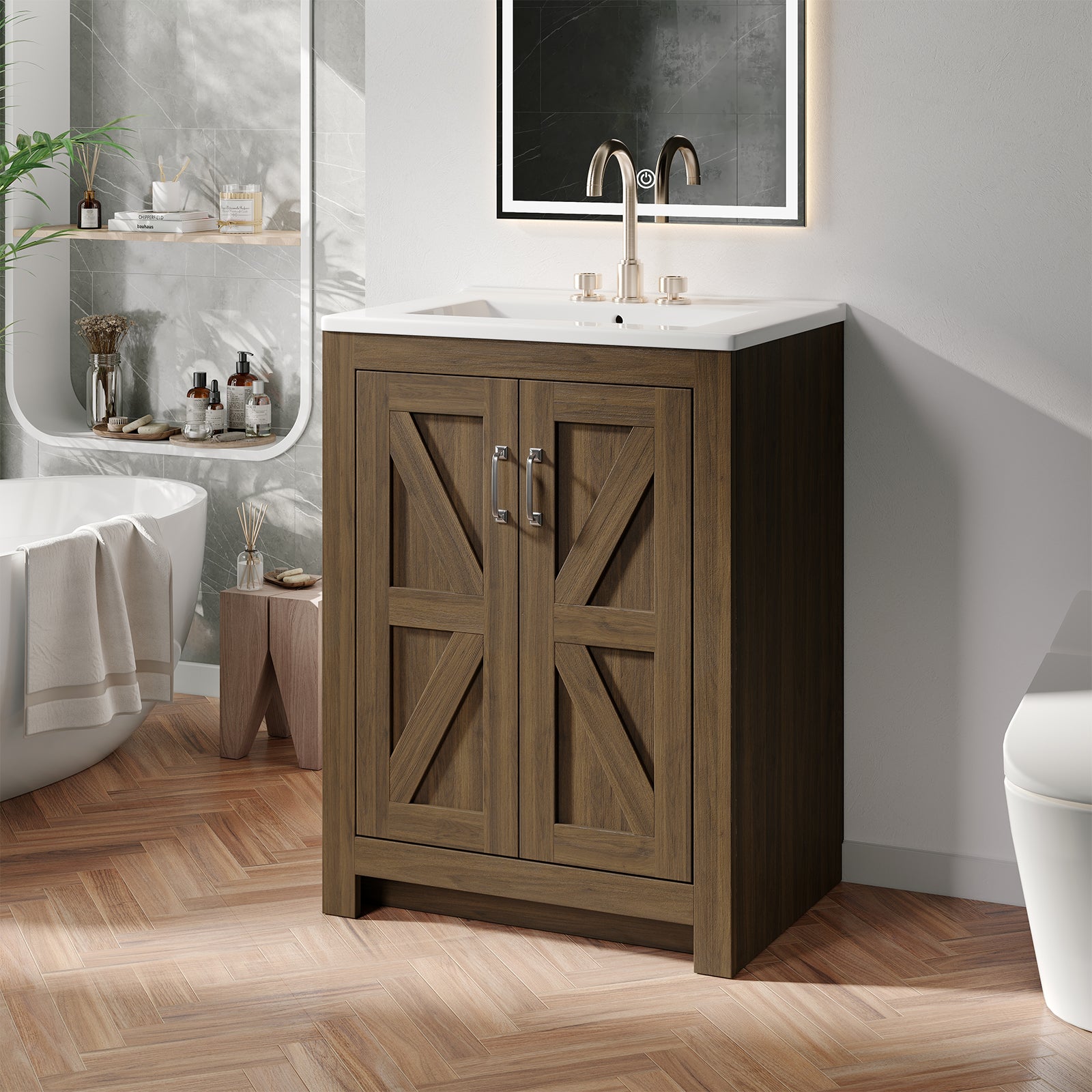 This bathroom vanity is 24 inches wide and comes with a ceramic sink and a wooden cabinet. The vanity cabinet is made of engineered wood and MDF with a reinforced frame and base, which ensures stability and durability.