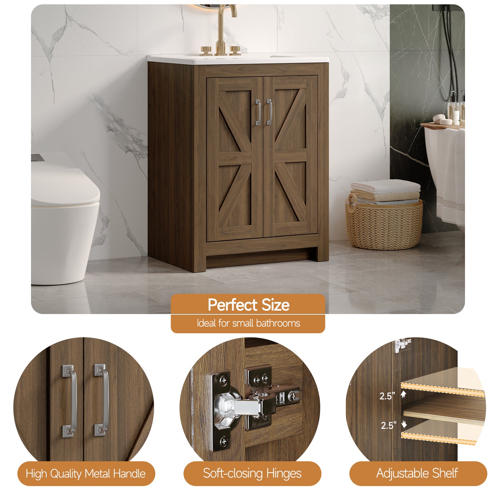 The bathroom vanity cabinet has two doors with metal handles. Adjustable reinforced metal hinges ensure silent, gentle closing to prevent slamming and extend hardware lifespan. Inside the cabinet, there is an adjustable shelf that can be set at three different heights, allowing you to store items of different sizes. The shelf can hold up to 22 pounds.