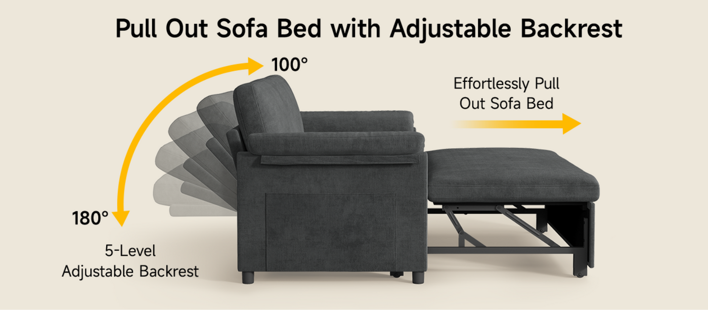 This futon sofa features a sturdy iron frame that is more durable and easier to clean and maintain than traditional wooden frames. The alloy material is designed to prevent warping and allows the sofa bed to support weight effectively. The backrest of the lounge sofa bed is adjustable between 100° and 180°. Whether you are reading, taking a break or sleeping flat on your back, this feature allows you to adjust the backrest to the most comfortable angle.