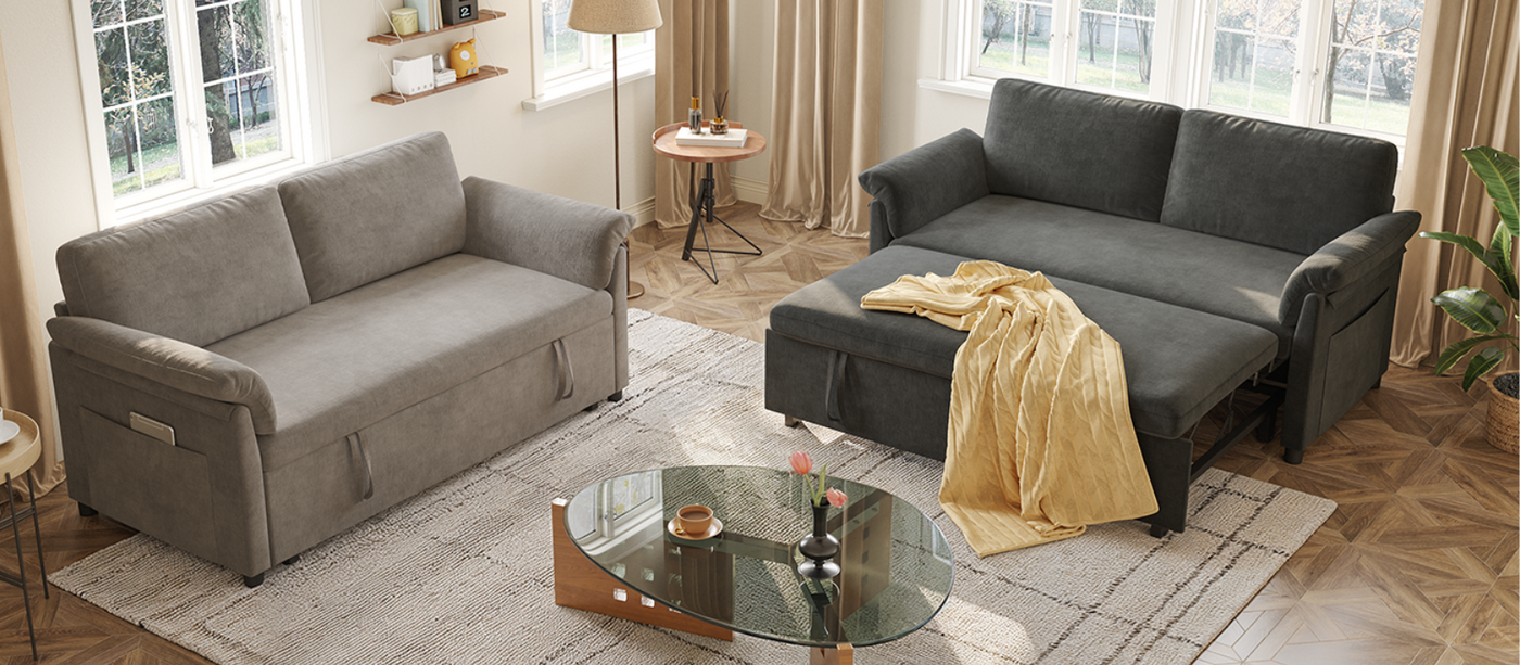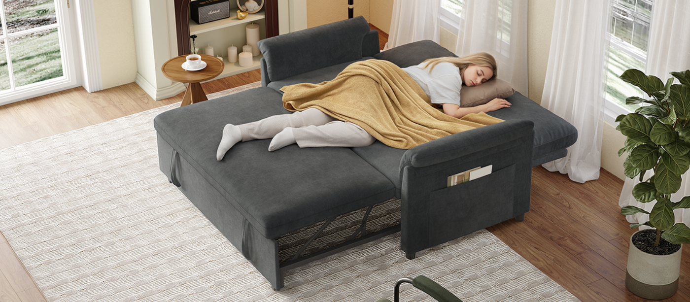 60 Inch Chenille Convertible Sofa Bed, 3 in 1 Sofa Bed with Pullout Bed with Adjustable Backrest and Side Pockets