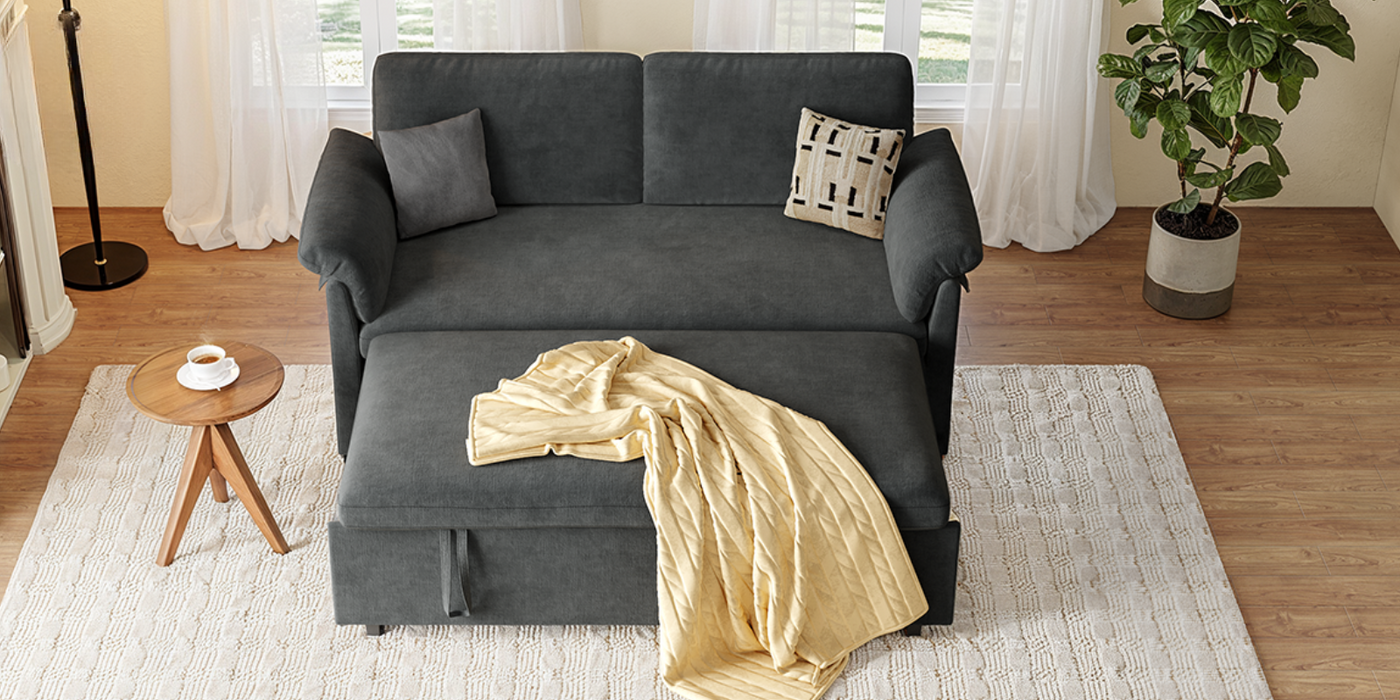 This Convertible Sofa Bed measures 32.3"D x 60"W x 34.6"H; Weight Capacity: 1,000 lbs This modern style convertible pull-out sofa bed features an innovative 3-in-1 design for impressive versatility. Simply pull the provided handle and the sofa bed smoothly extends out on rollers to become a comfortable sleeping bed. It can be easily adjusted to suit your space and requirements.