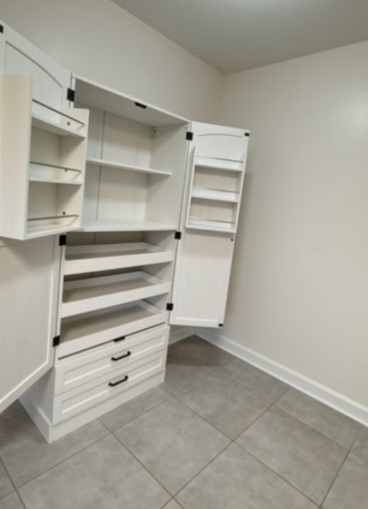 This pantry storage cabinet has a large capacity. It features three pull-out shelves and two larger drawers. The smooth-glide drawers store small condiments and provide easy access to cutlery, forks, spoons, and other utensils. The upper sections of the cabinet's two doors are designed to resemble refrigerator doors, making it suitable for storing snacks, condiments, and other items.