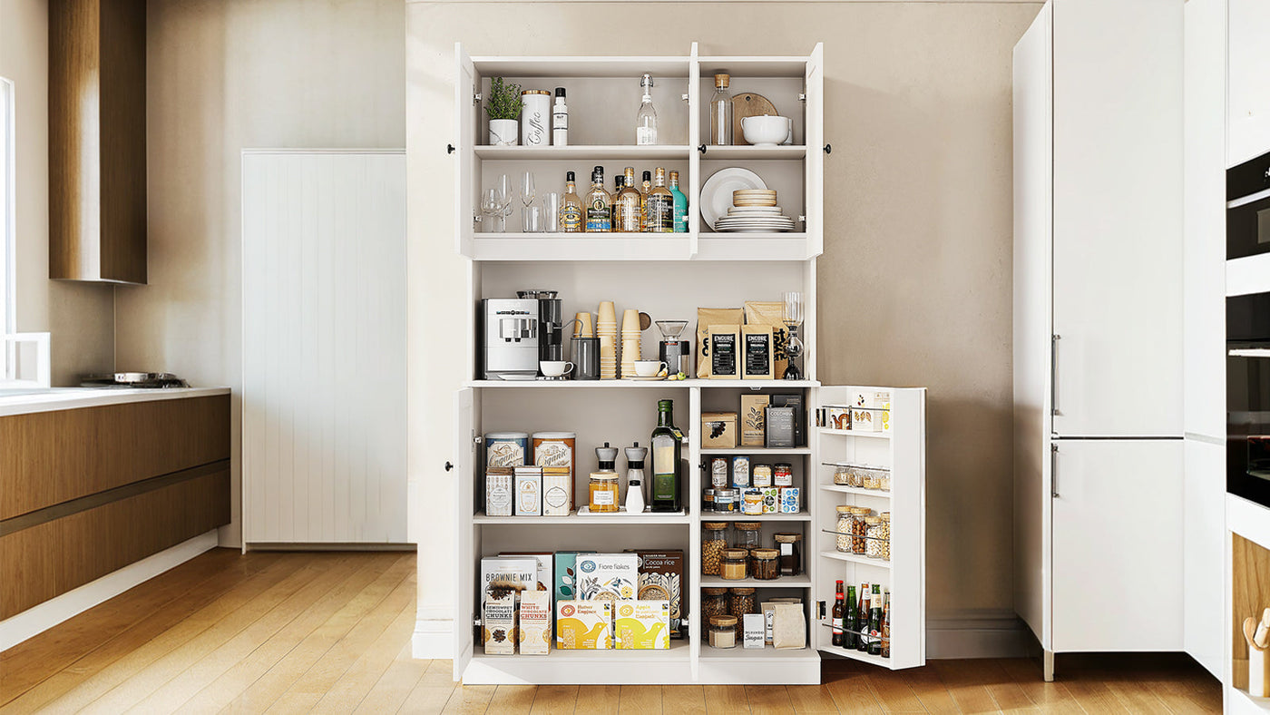 The multi-purpose high cabinet has a huge storage capacity, and the shallow shelf design on the back of the door makes full use of the space and is ideal for storing snack bags, independent beverage bottles, etc.