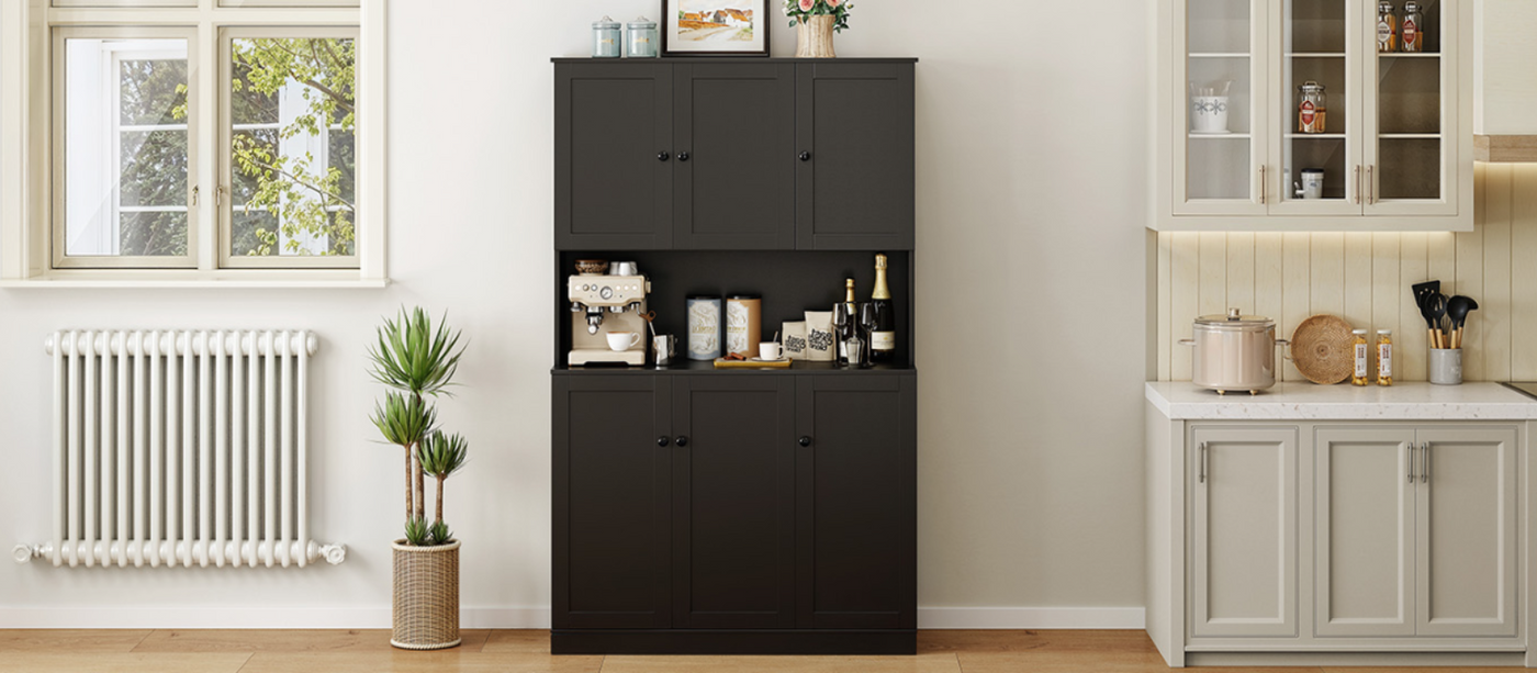 This food storage cabinet features a multi-layer shelf design with 6 cabinets, 1 door shelf and 3 adjustable shelves, offering three height options to meet your various storage needs.