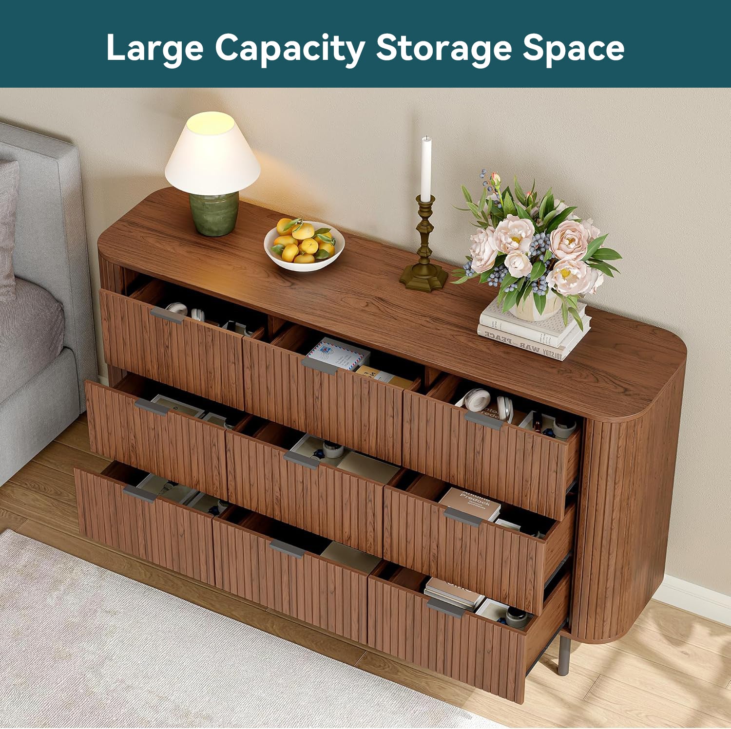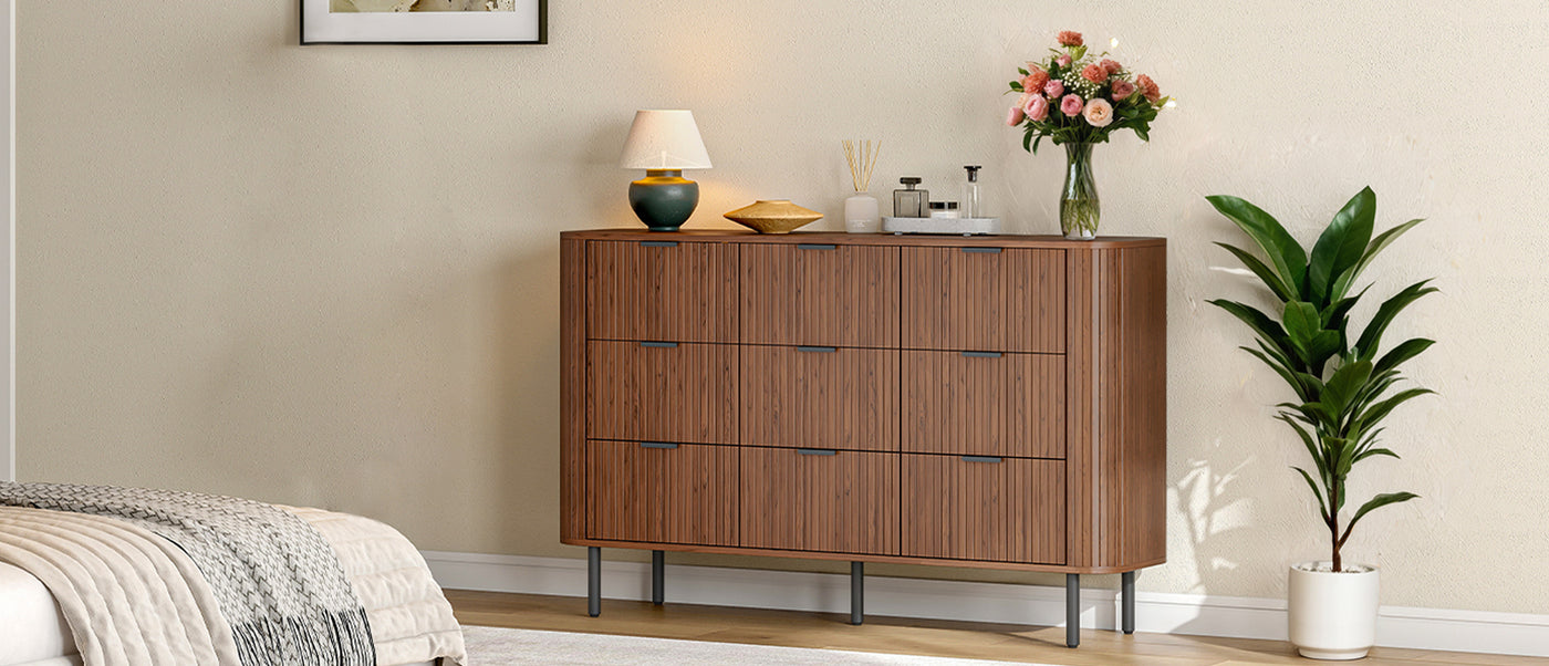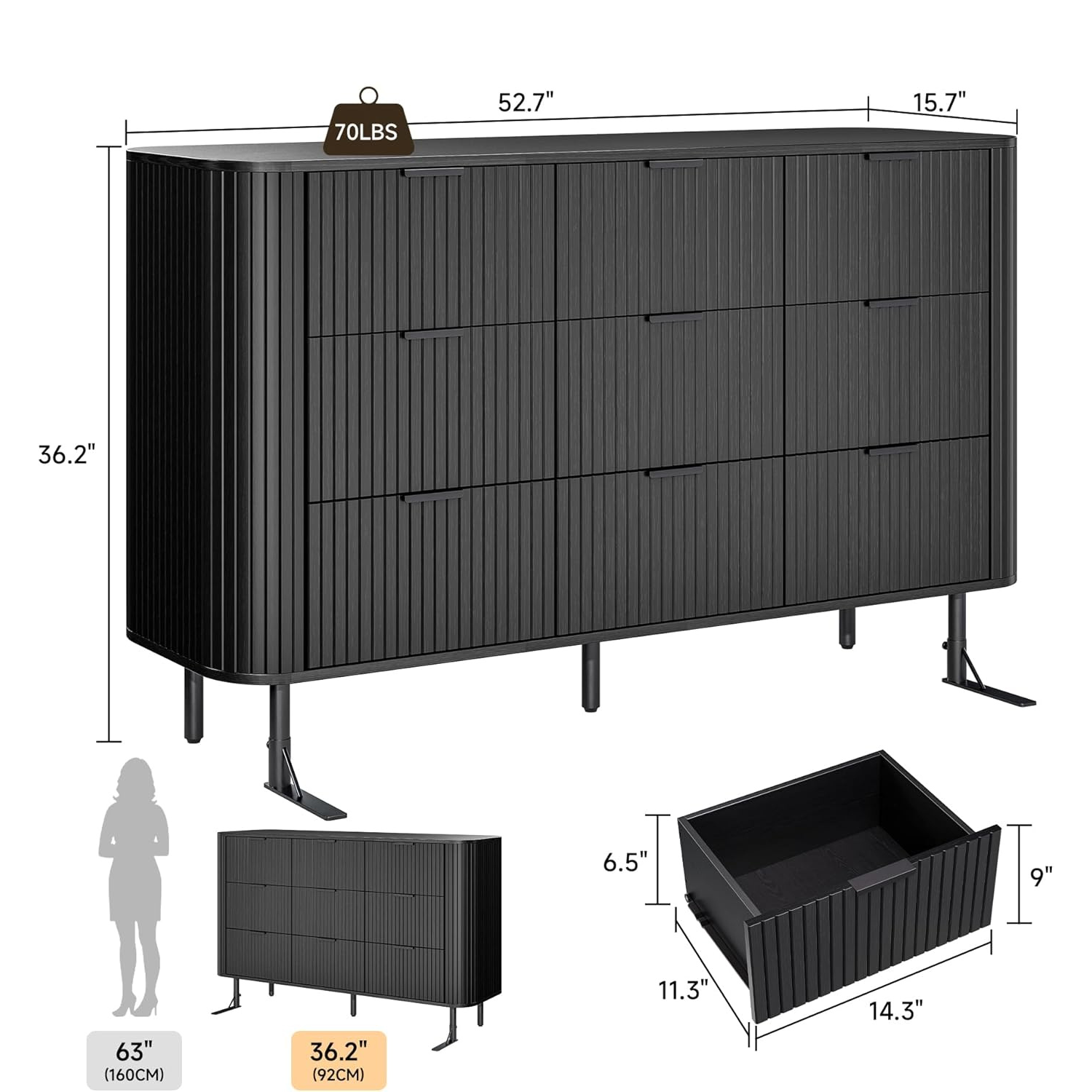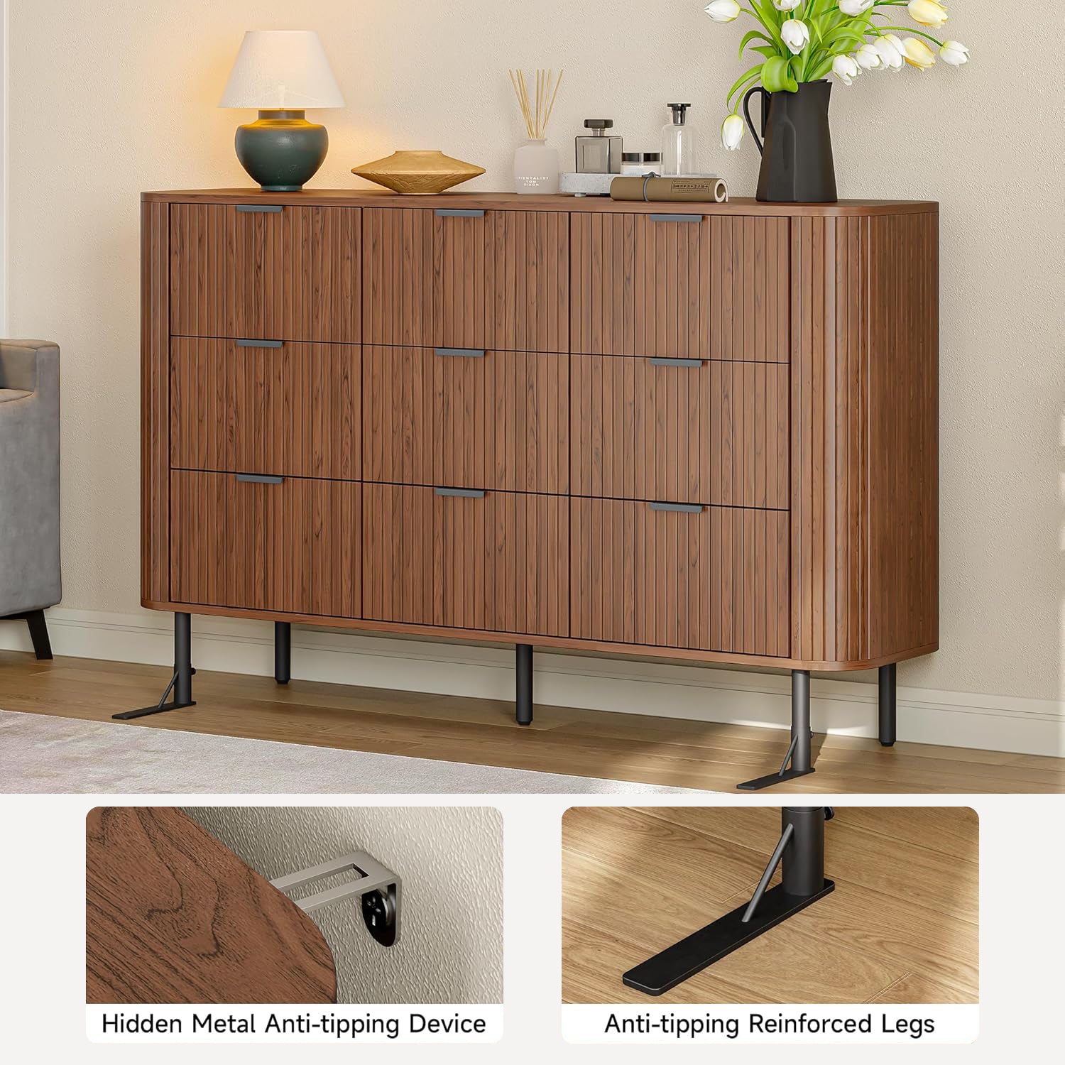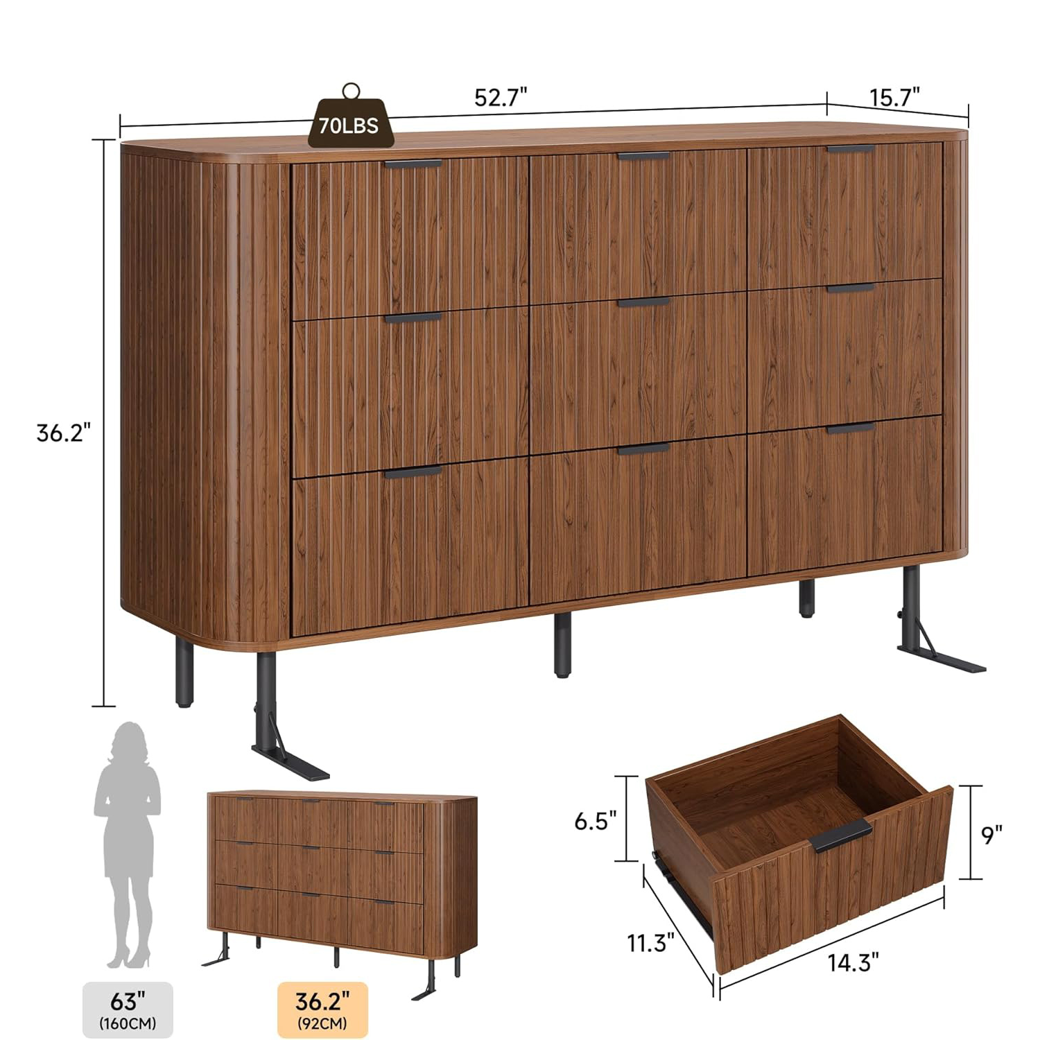 The large dresser has nine spacious drawers that make it easy to keep things organized. Each drawer has a metal handle and smooth sliding rails, so you can open and close it quietly and without effort. The wide top surface also gives you room for decorations, a lamp, or even some plants.