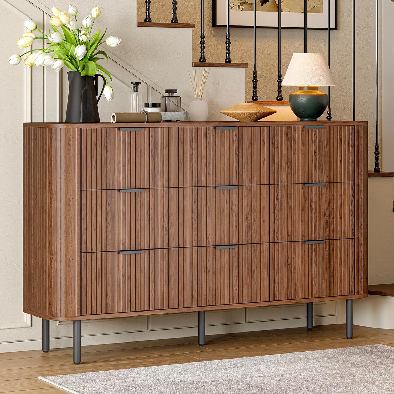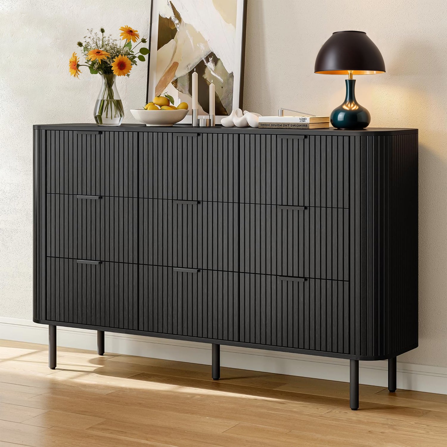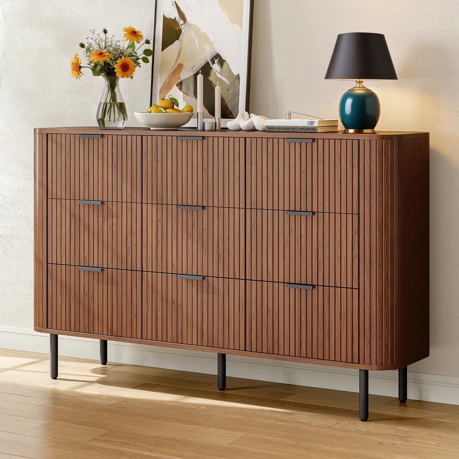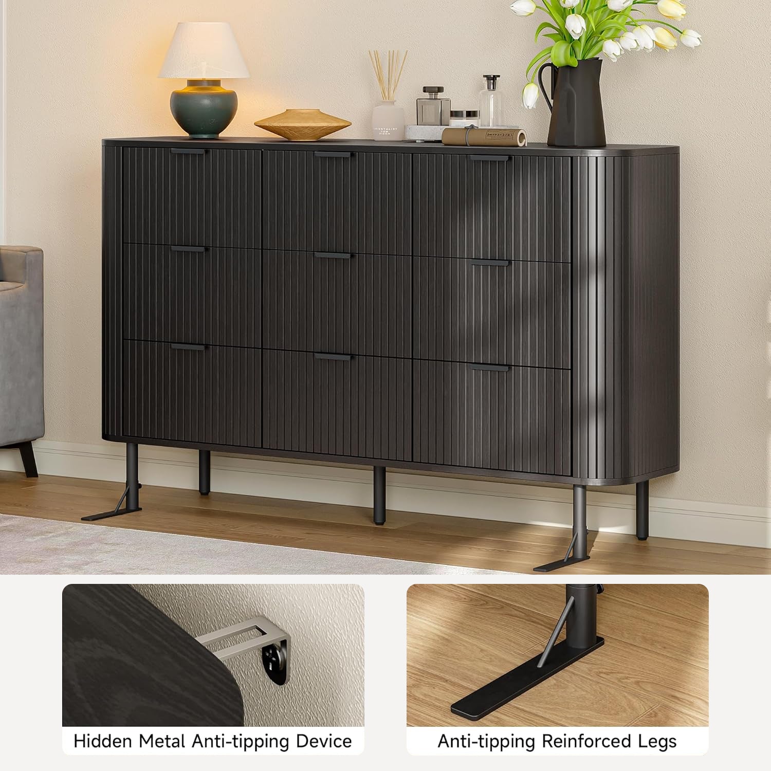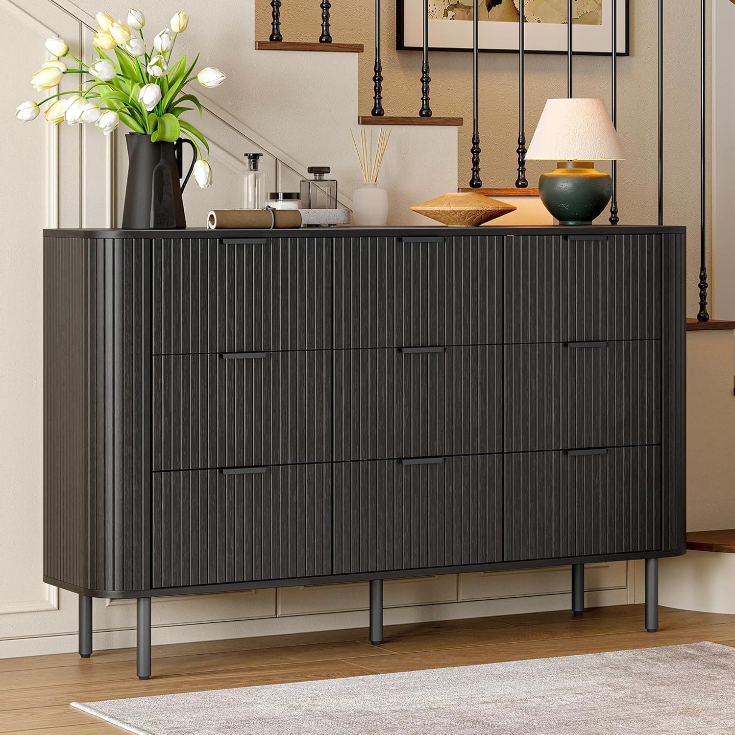 The large dresser has nine spacious drawers that make it easy to keep things organized. Each drawer has a metal handle and smooth sliding rails, so you can open and close it quietly and without effort. The wide top surface also gives you room for decorations, a lamp, or even some plants.