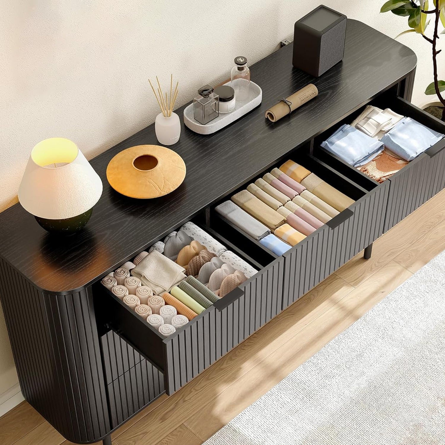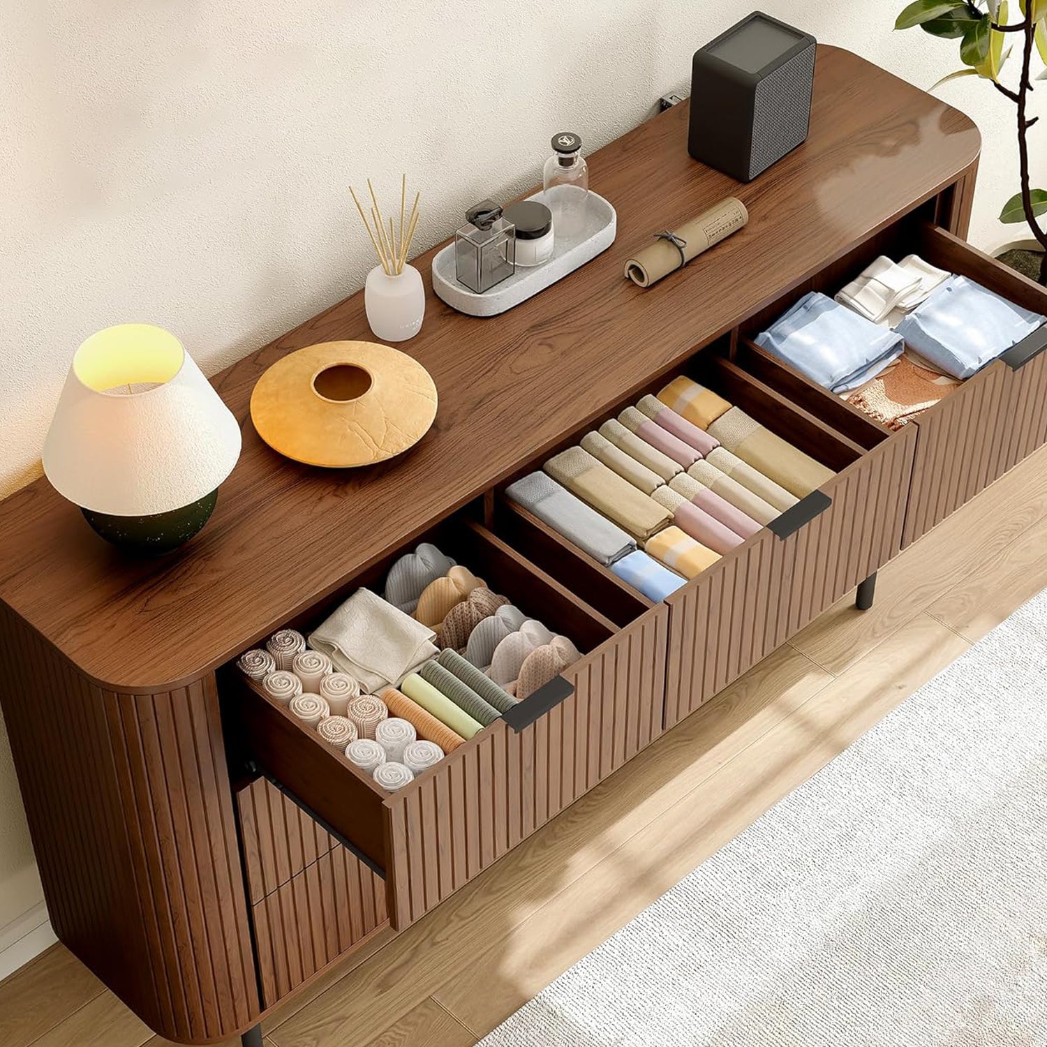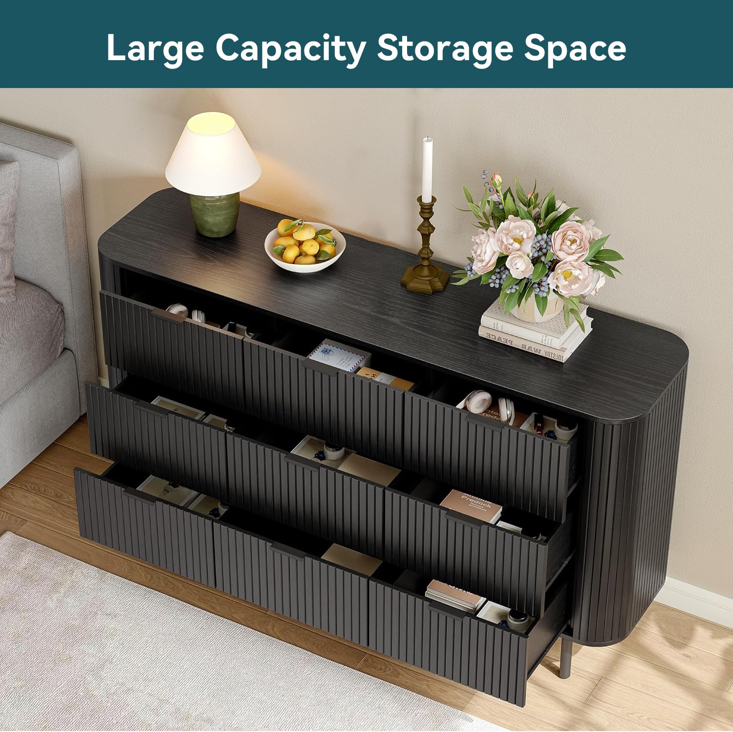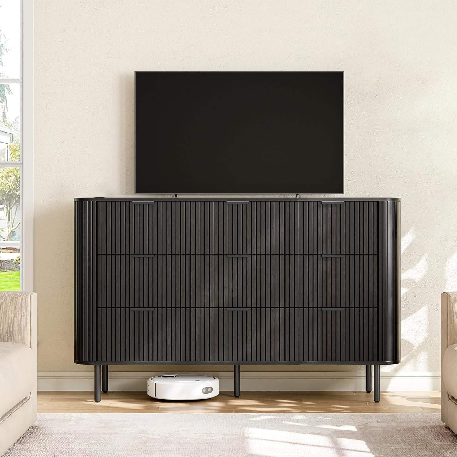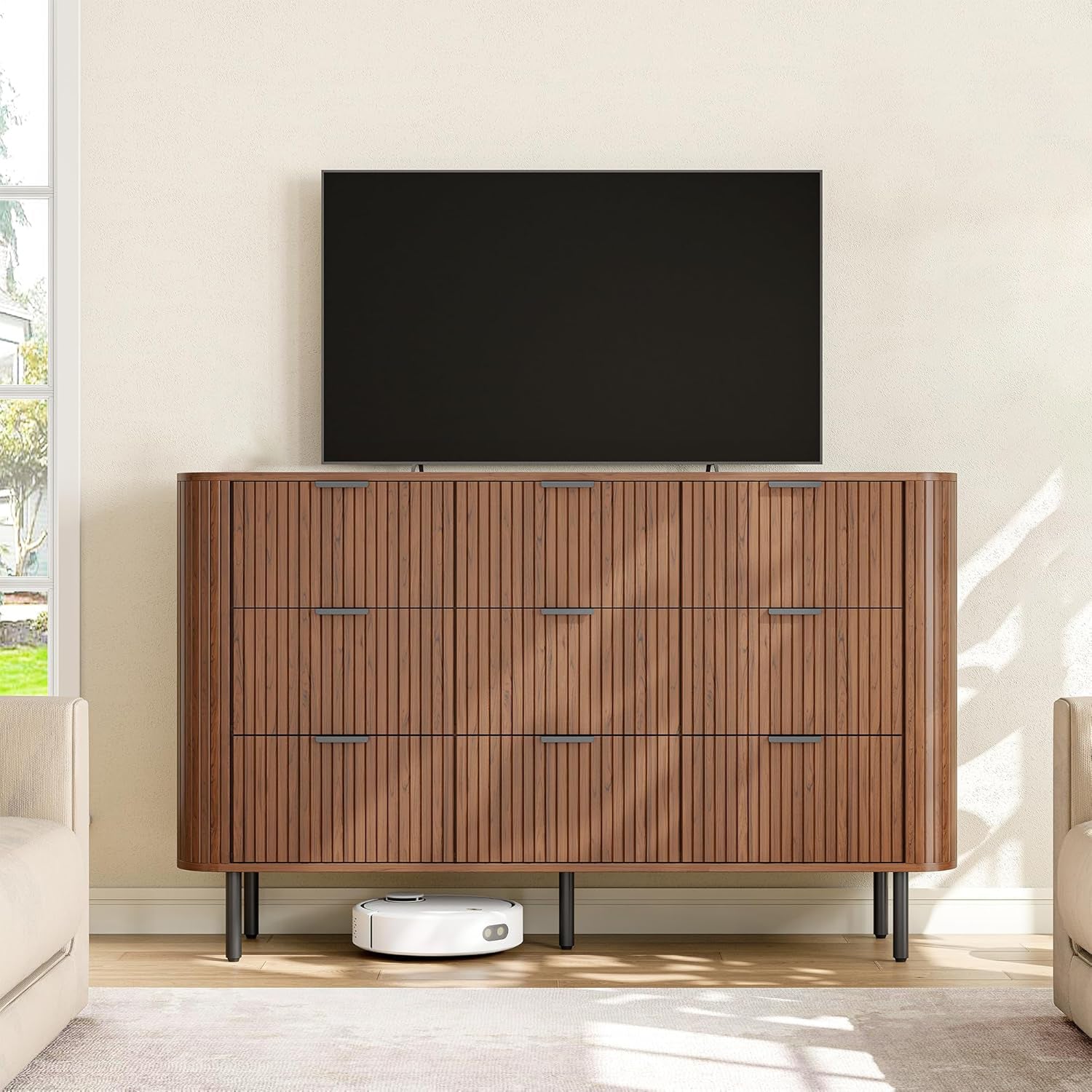The large dresser has nine spacious drawers that make it easy to keep things organized. Each drawer has a metal handle and smooth sliding rails, so you can open and close it quietly and without effort. The wide top surface also gives you room for decorations, a lamp, or even some plants.