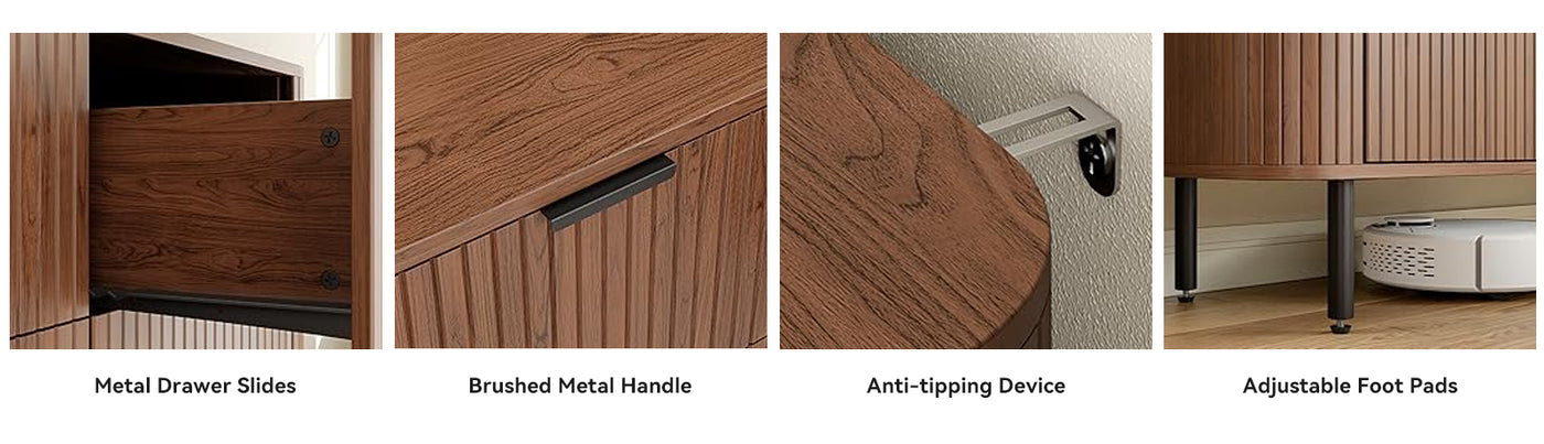 For strength and stability, the chest of drawers is built with reinforced wood and supported by 4 strong metal legs. It also comes with an anti-tipping device for the wall and reinforced bottom legs, so it stays steady even when filled with heavy items. The surface is water-resistant and simple to clean, so it can handle everyday use.