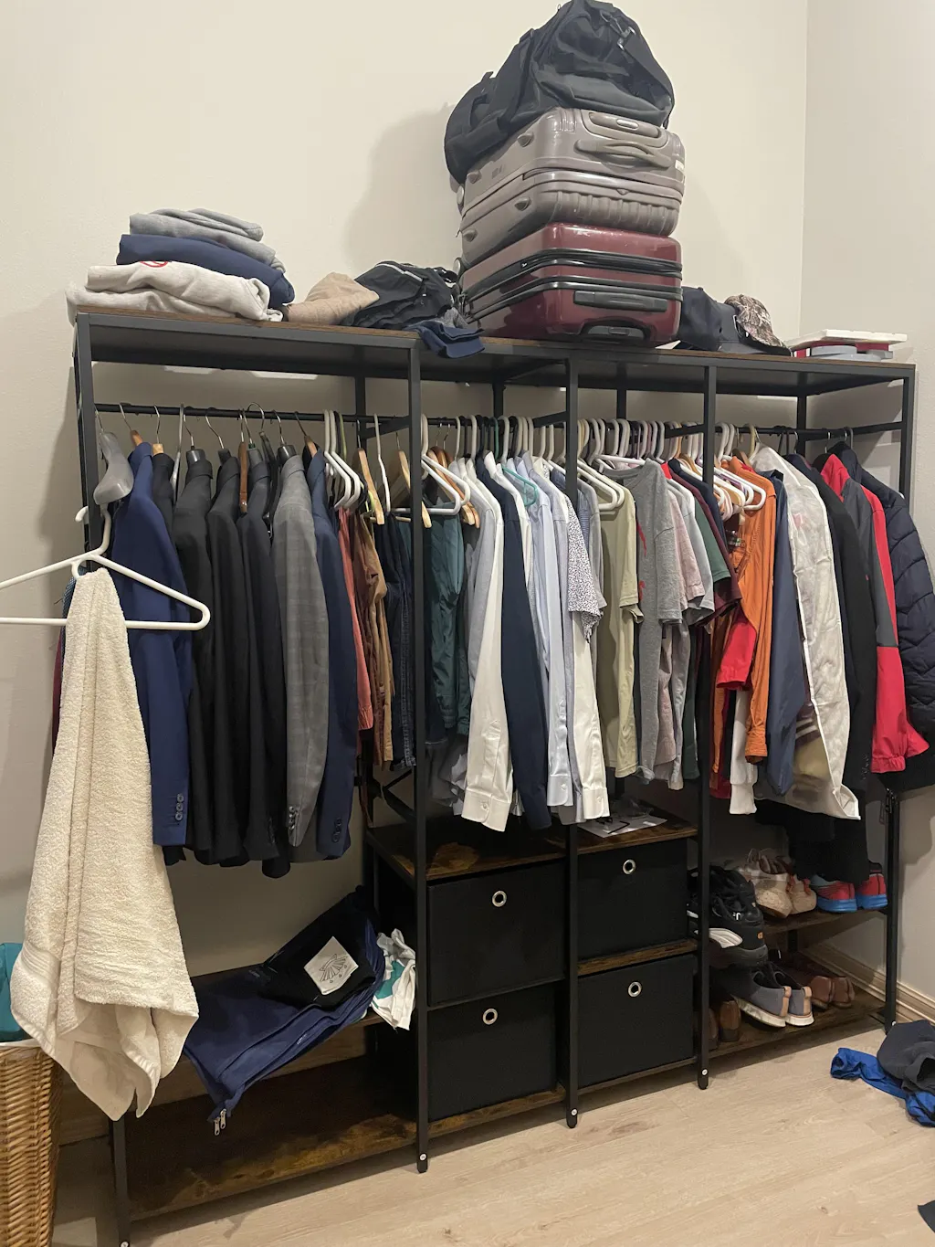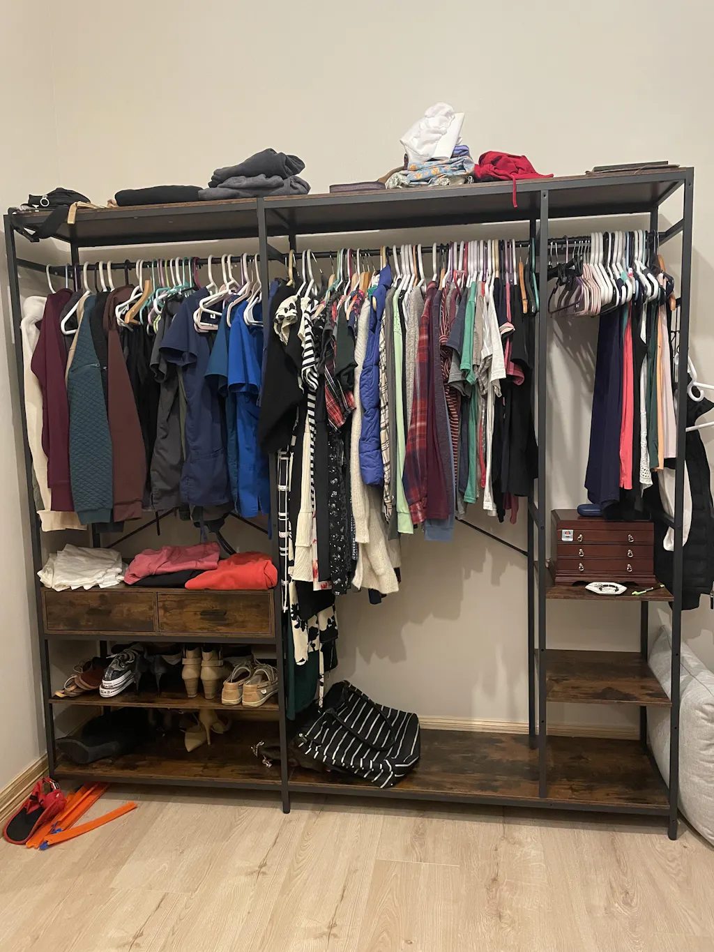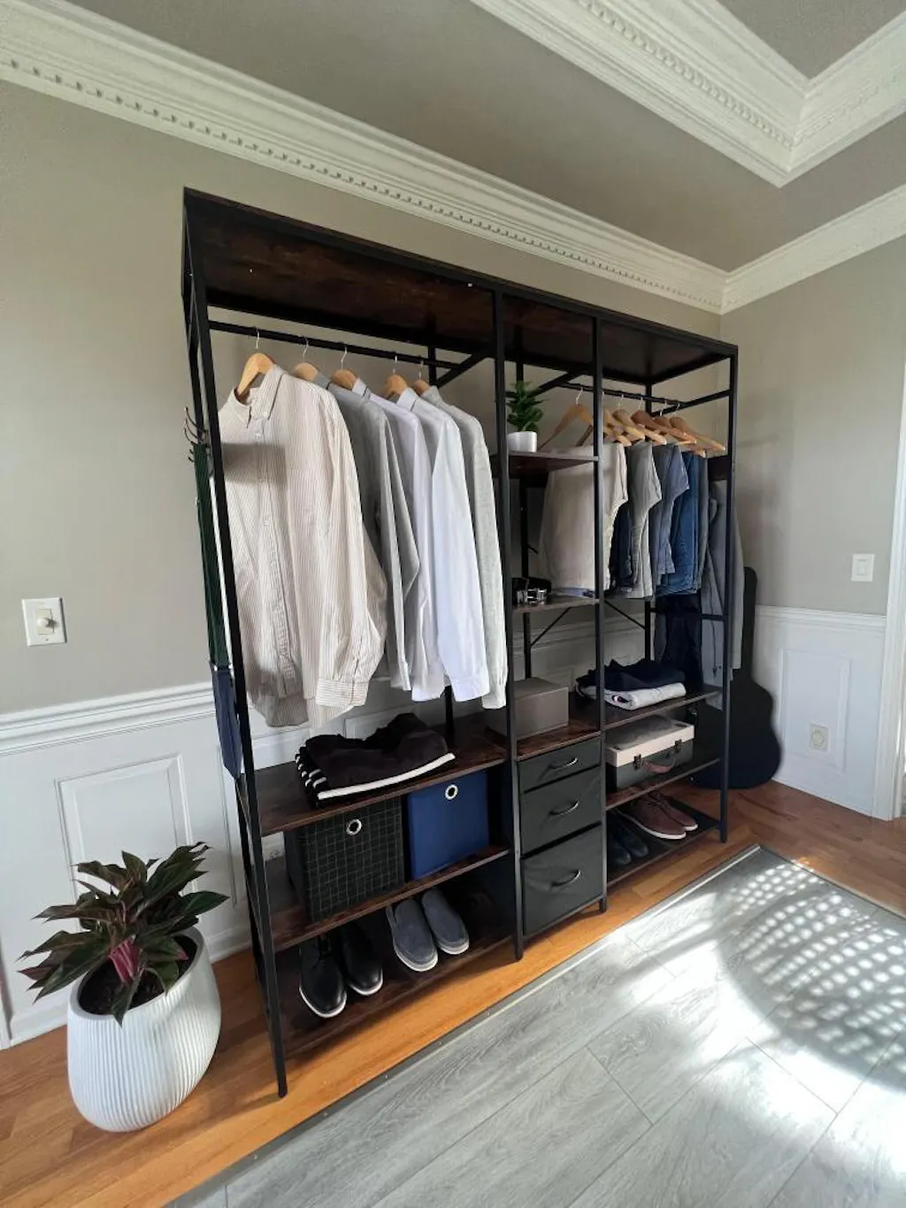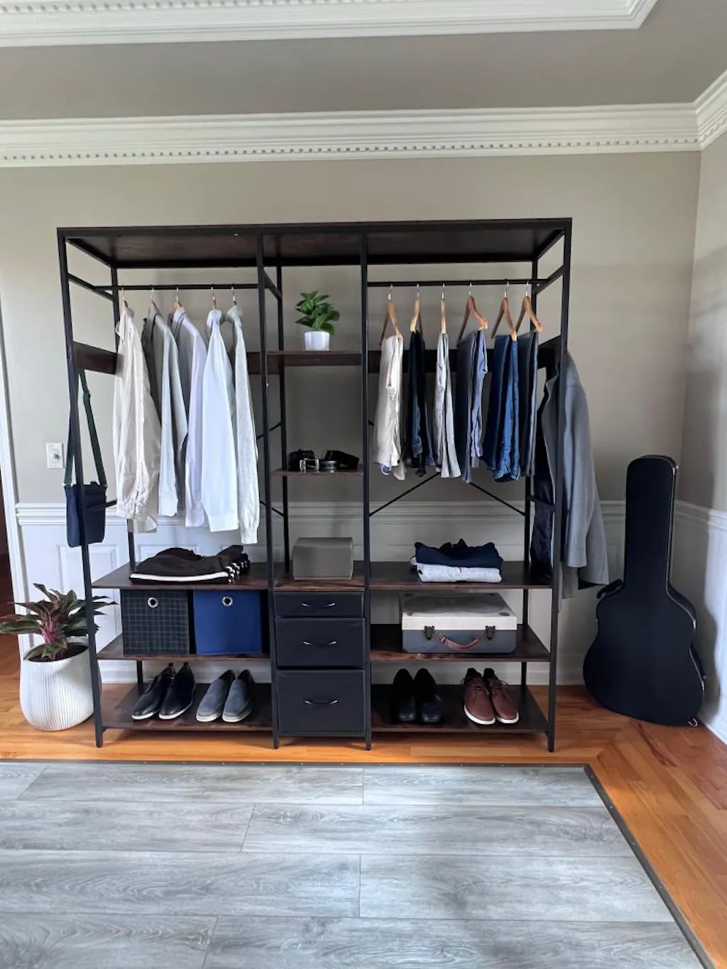This clothes rack has 9 storage shelves, 2 hanging rods, and 3 collapsible drawers for flexible storage of everything from shoes and bags to luggage and clothing, keeping your space clean, tidy, and organized. It also comes with 6 hooks for convenient storage of your accessories. The industrial style design of this garment rack with a sturdy metal frame brings a complete and stylish look to your home, keeping your space clean, neat and organized.