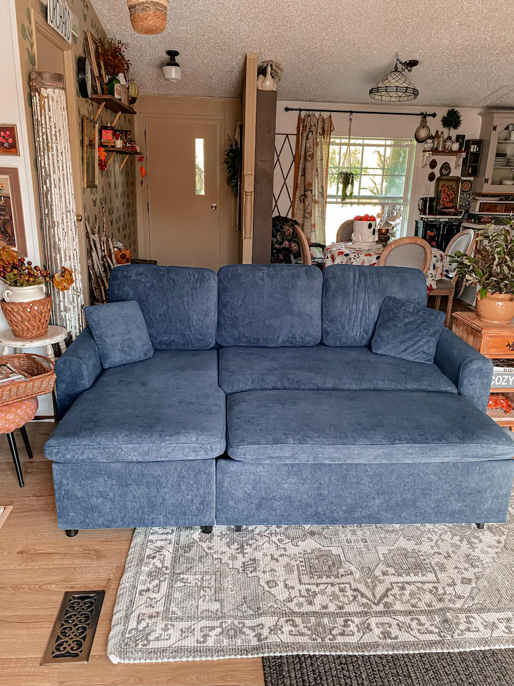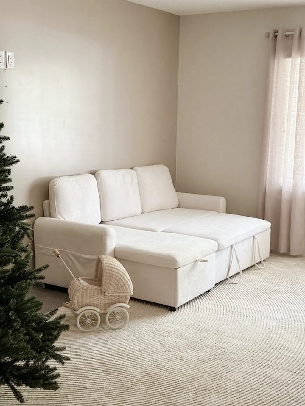 The sofa bed is made of advanced water and oil resistant fabric, stain and fade resistant, easy to clean and maintain, which will keep the sofa looking fresh for a long time. This large sofa features a pet-friendly design with a soft, delicate and abrasion-resistant surface that prevents damage from pets or sharp objects. This L-shaped sofa features a hidden pull-out bar that transforms into a sofa bed with a simple tug for your relaxation and resting needs. Whether it's for family gatherings or everyday use, it offers the ultimate in comfort. This multi-functional sofa comes with a large storage chaise lounge that opens up with a simple pull, easily storing pillows, books and other items, say goodbye to clutter and enjoy a tidy space. This sofa bed measures 85 "L x 52 "W x 35 "H and can hold up to 600 pounds. The sofa is a fixed sofa that can't be combined at will, and the chaise lounge is on the right side of the sofa. Suitable for all kinds of family use.