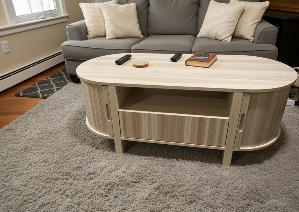 The center table provides multiple storage options. An open shelf and a drawer allow you to separate everyday essentials from extra supplies. Dual sliding doors on both sides offer additional hidden space, perfect for storing books, magazines, or larger items neatly out of sight.