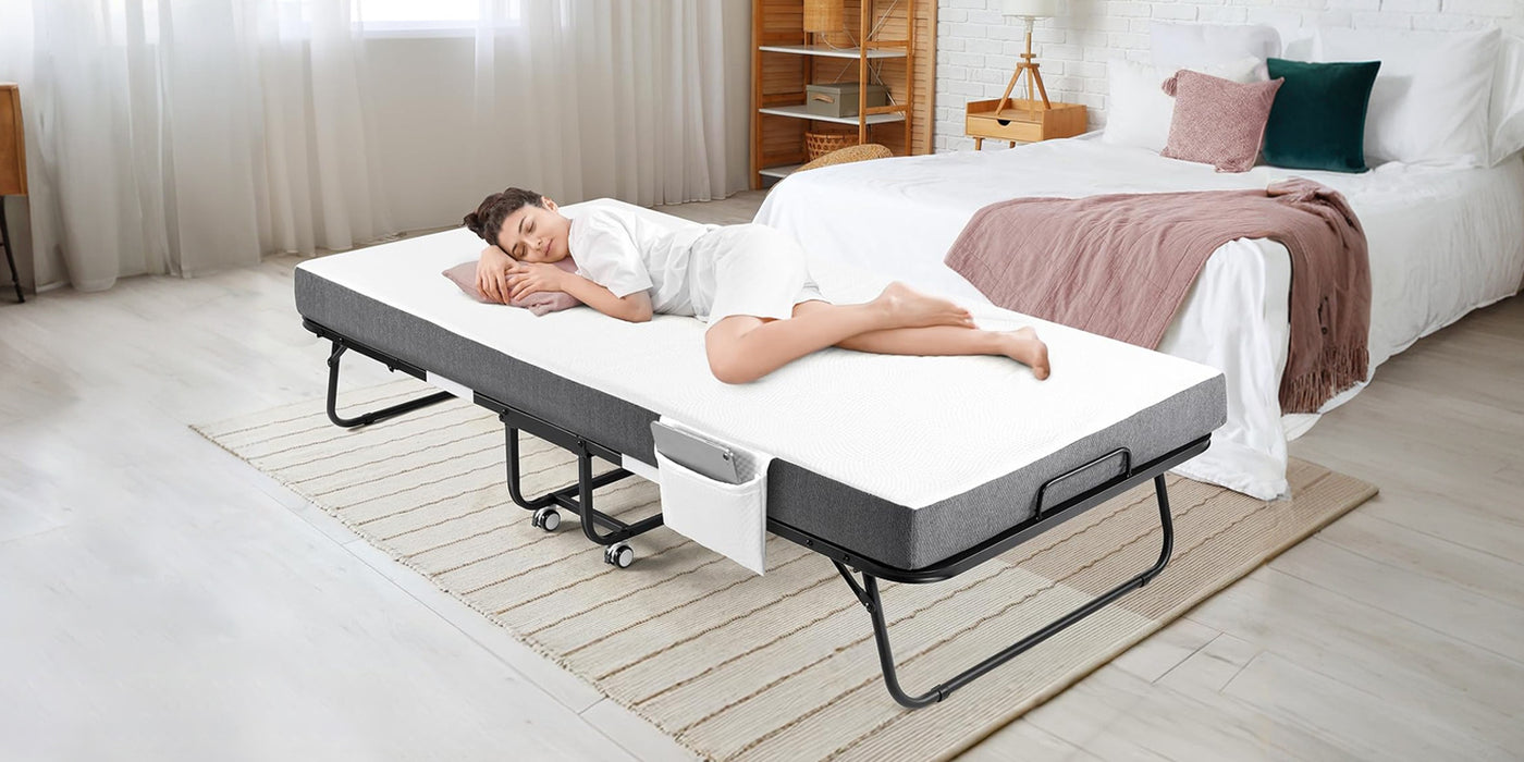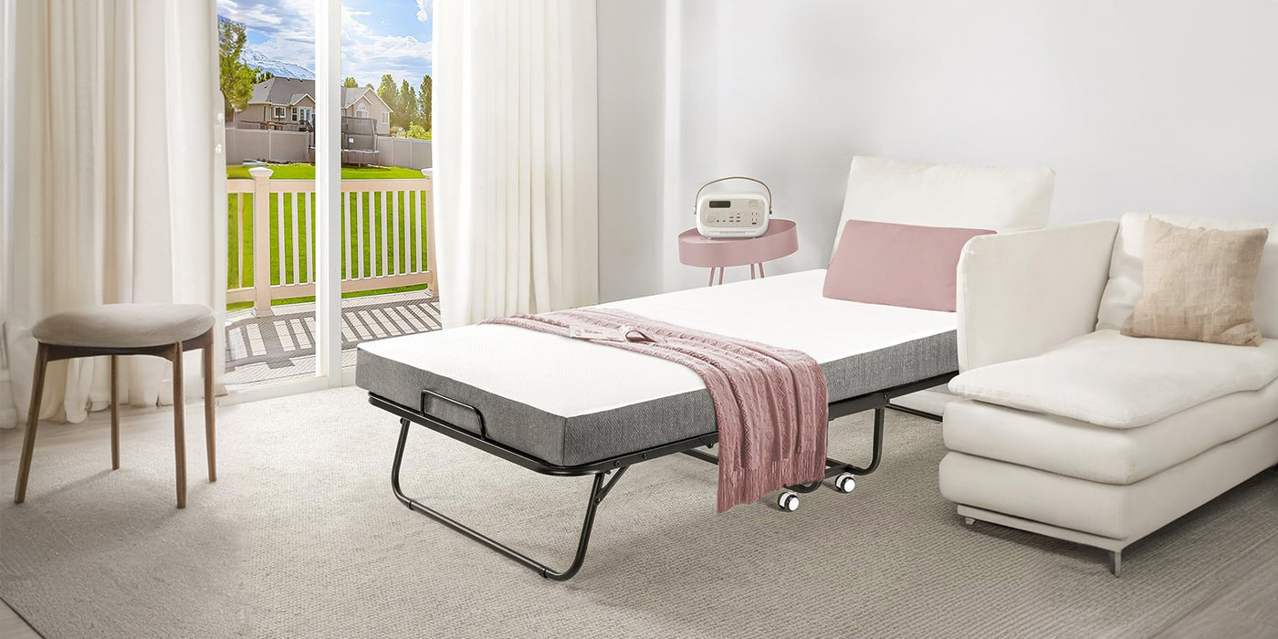 The folding bed comes with a 4’ memory foam mattress. The mattress of the double folding bed is mainly made of 3.15 inches of 23D high resilience foam and 0.8 inches of gel memory foam. The mattress and bed frame are separate, and you can also easily change the mattress cover at any time.