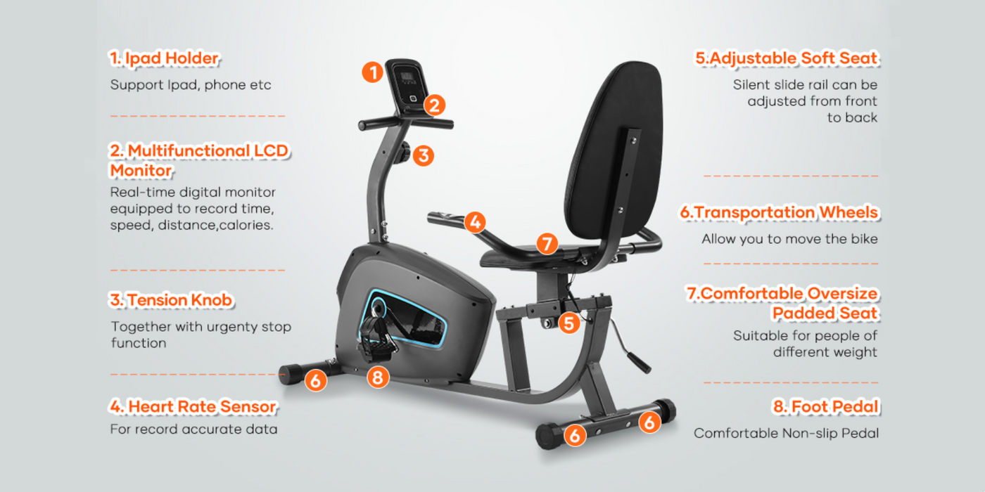 Recumbent Exercise Bike Home Stationary Bike with 8 Level Adjustable Resistance magnetic, Heart Rate Handle, Large Cushion Seat, Free from Joint Pain, Physical Therapy Bike